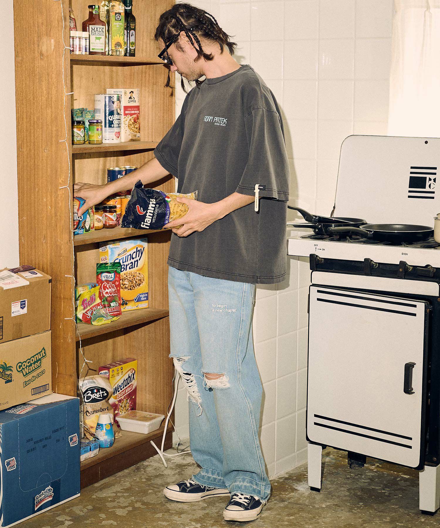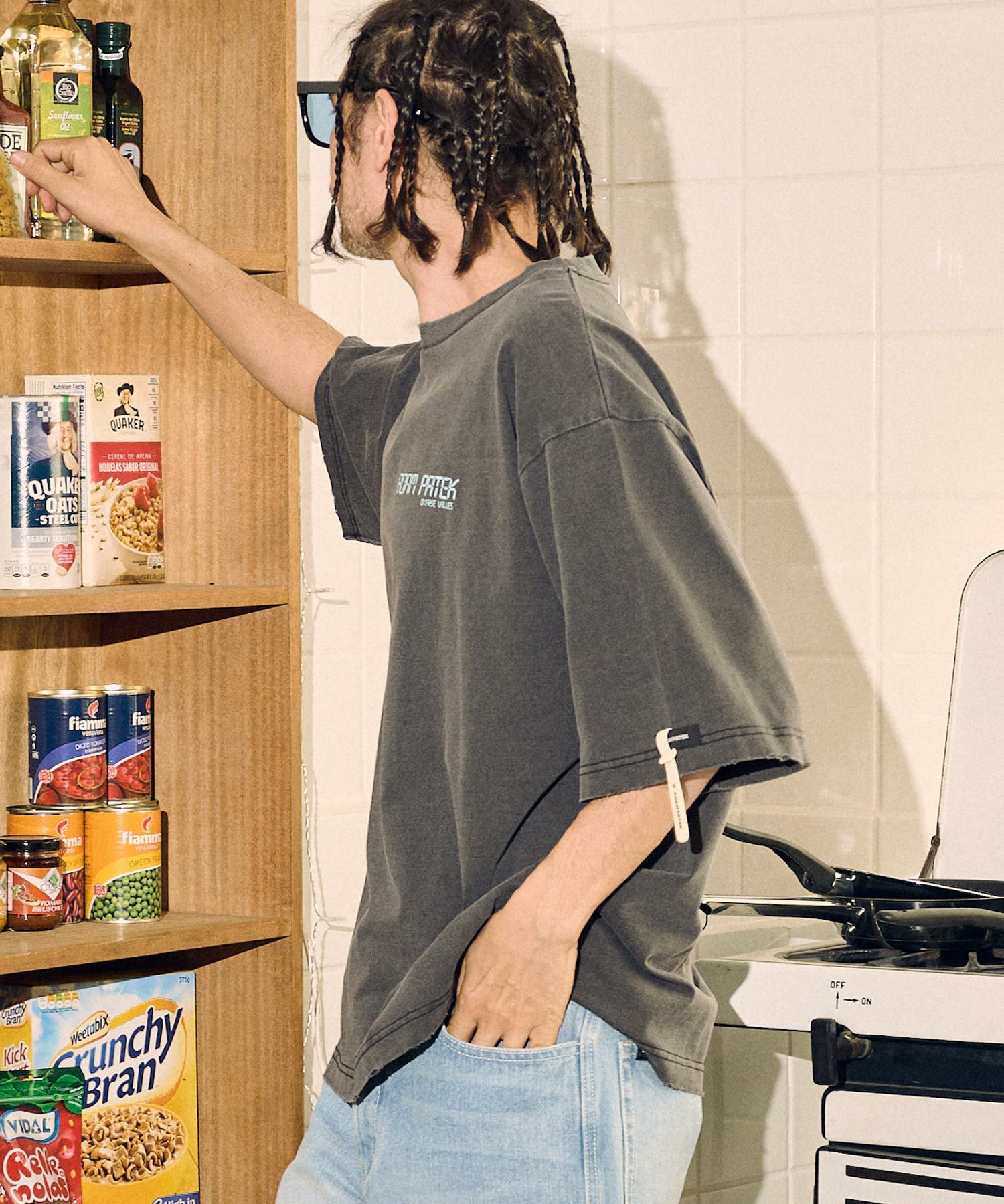 空紡糸のザラっとした質感にピグメントと洗い加工、程よいダメージ加工で、ワードローブのお気に入りTシャツの経年変化をイメージして作りました。