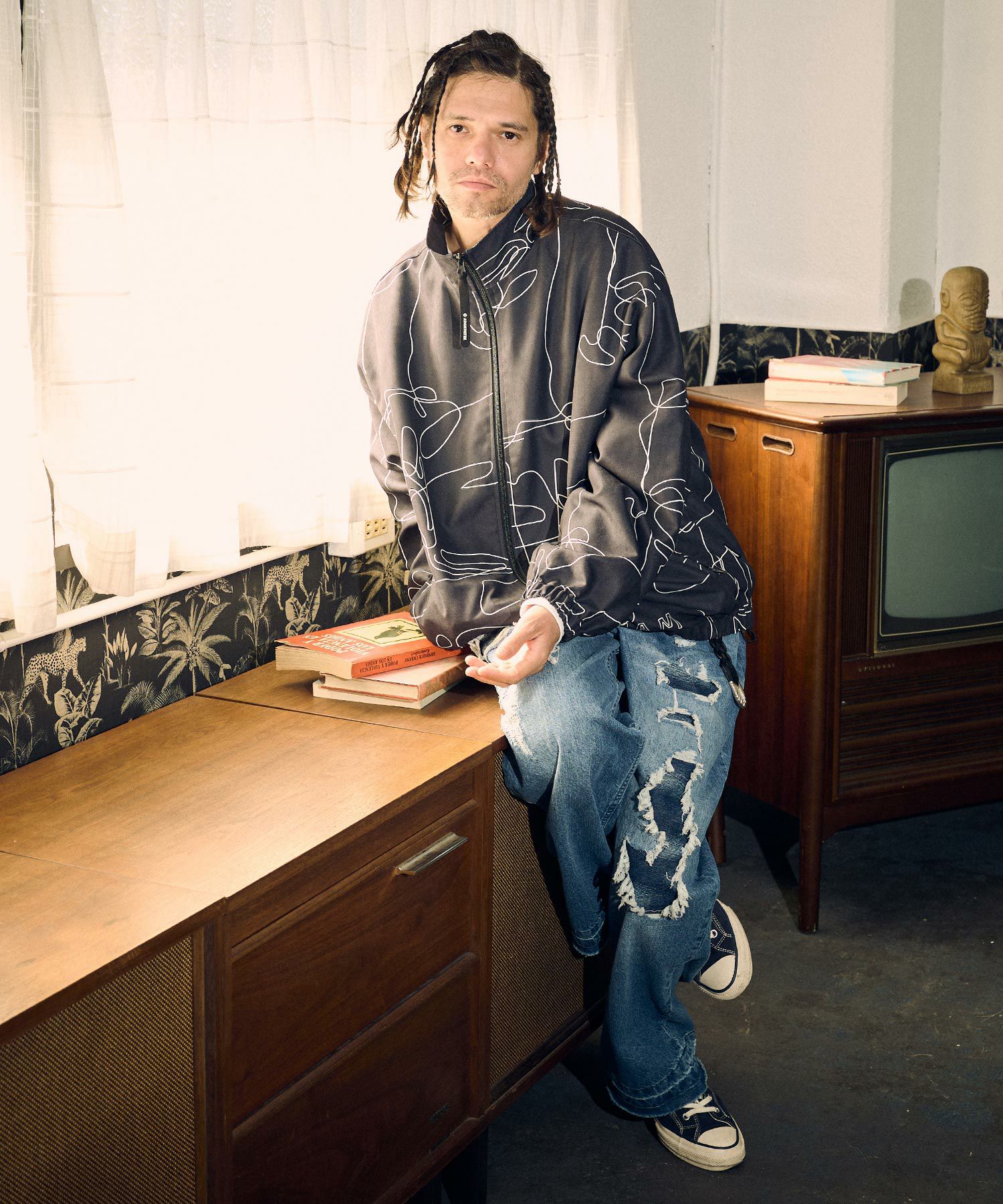 手書きで書いた線画の様なオリジナル総柄をプリントしています。