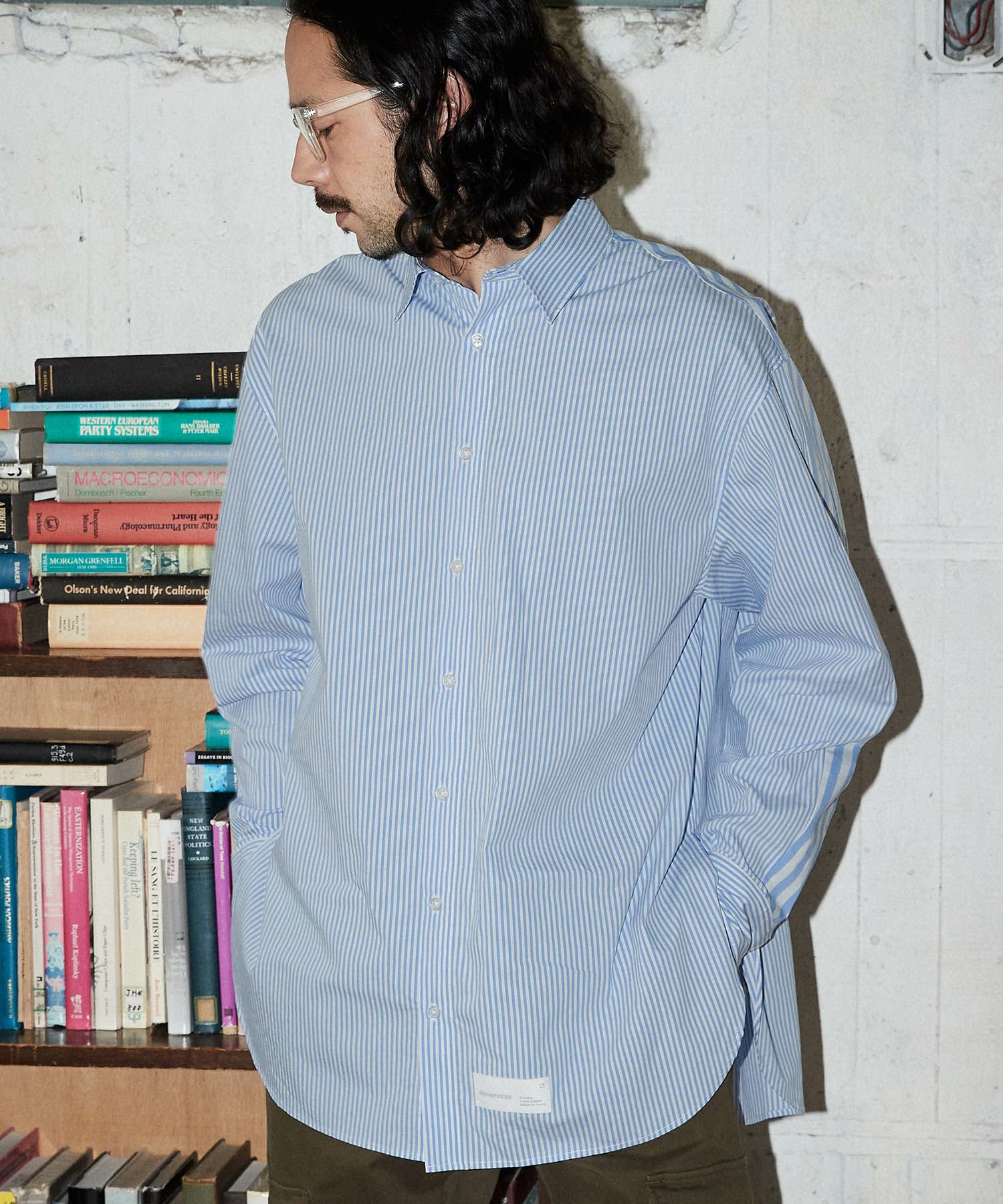 ハリのある高密度ストライプ生地を使用したルーズシルエットのシャツ