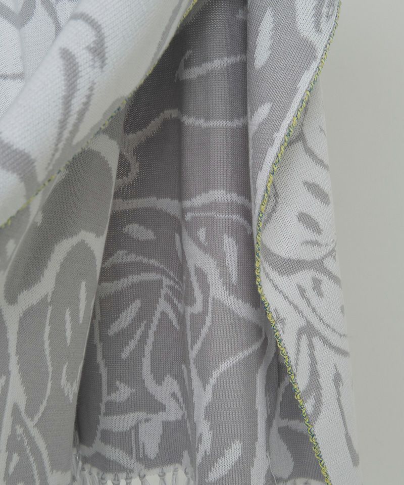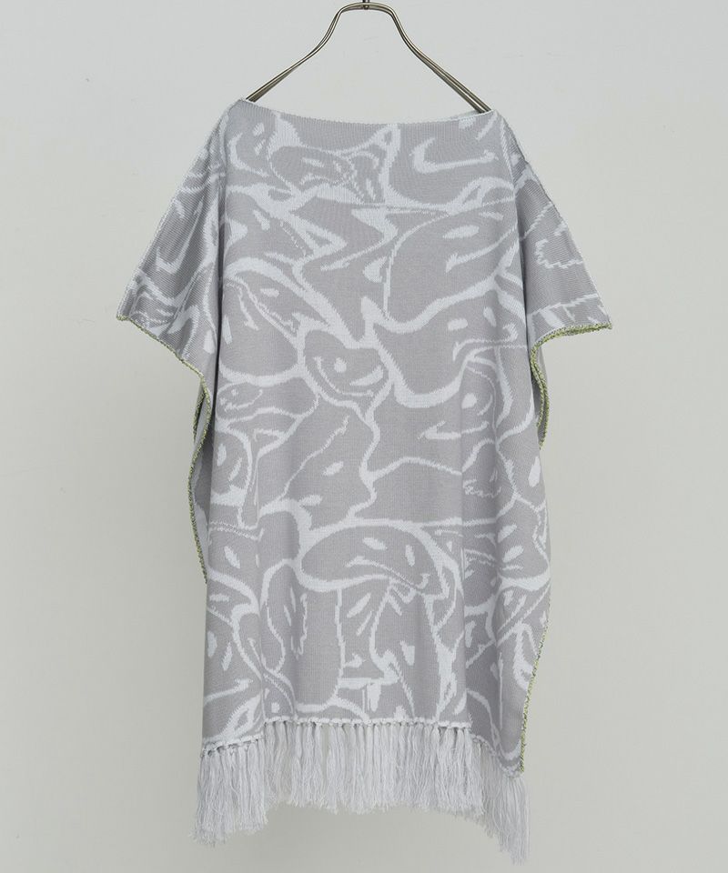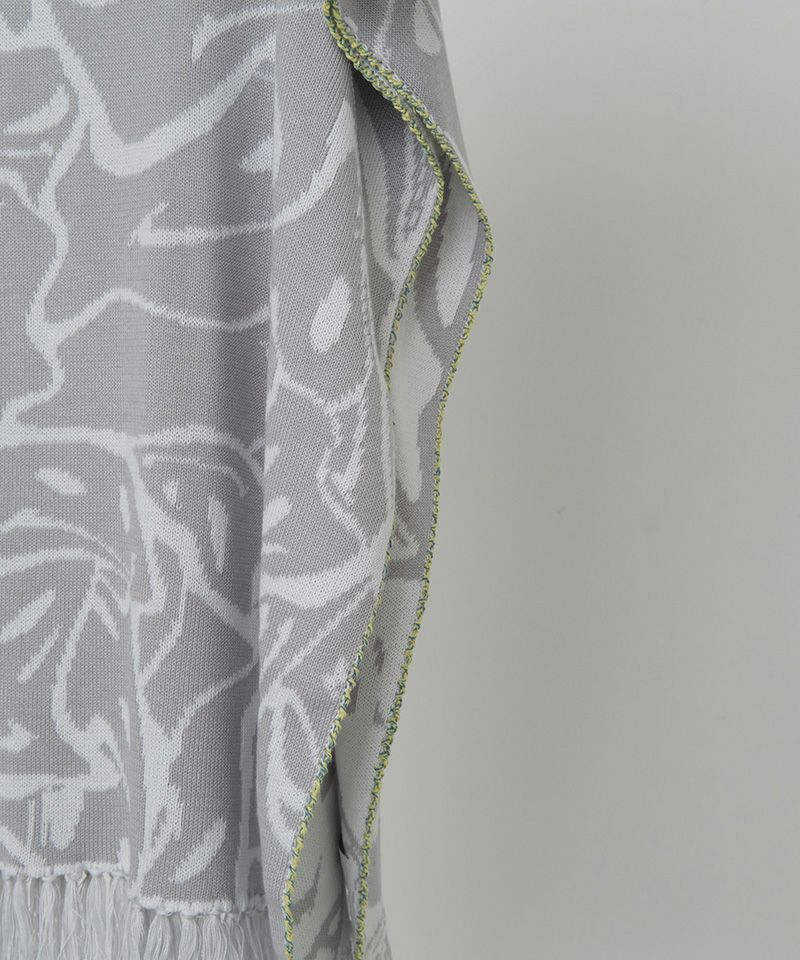 ポンチョの形状で、サイドはハンドステッチでトリミング、裾は手付けでフリンジを取り付けています。