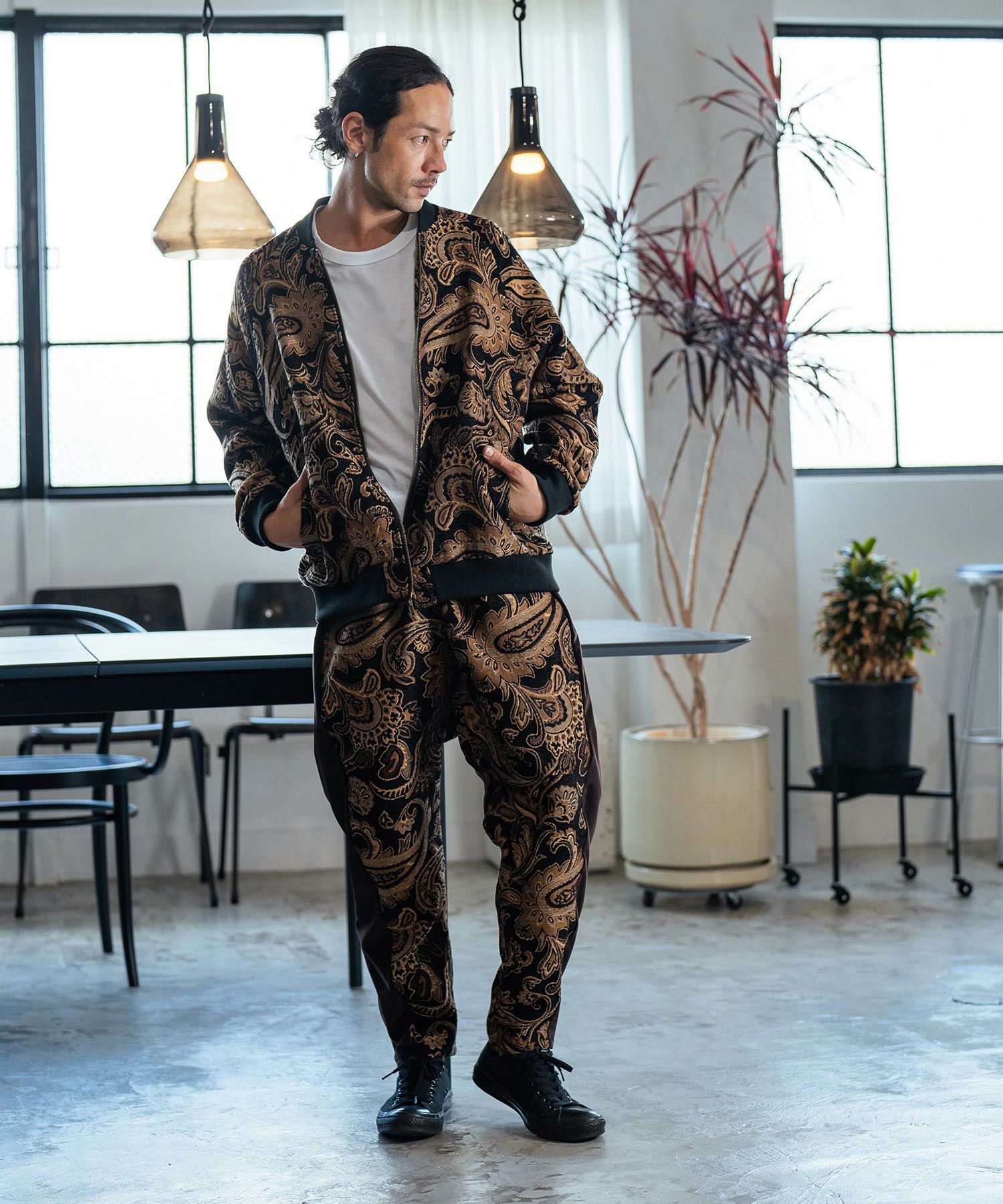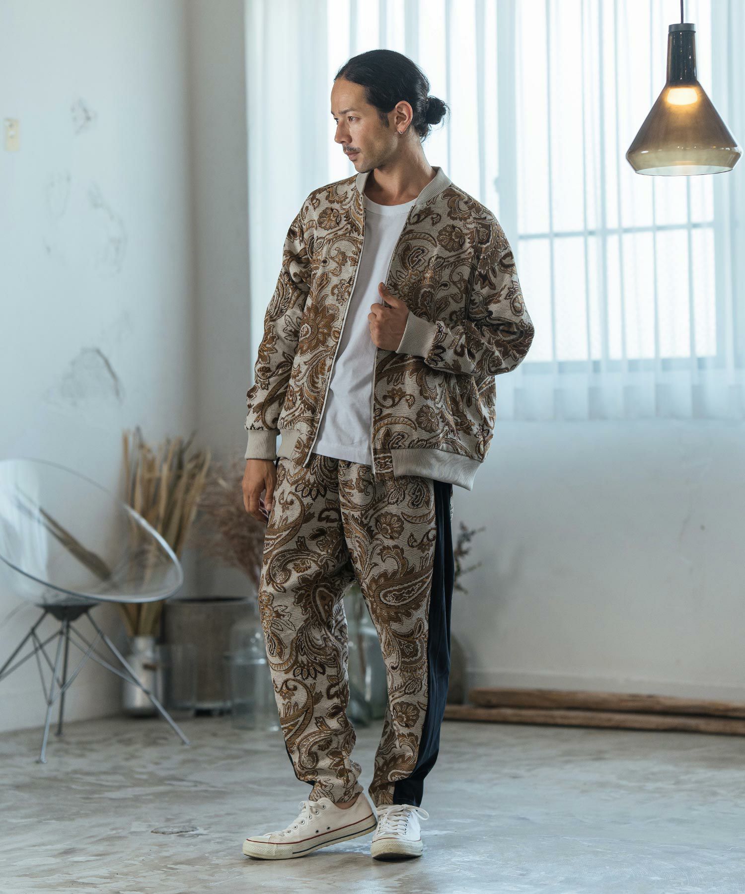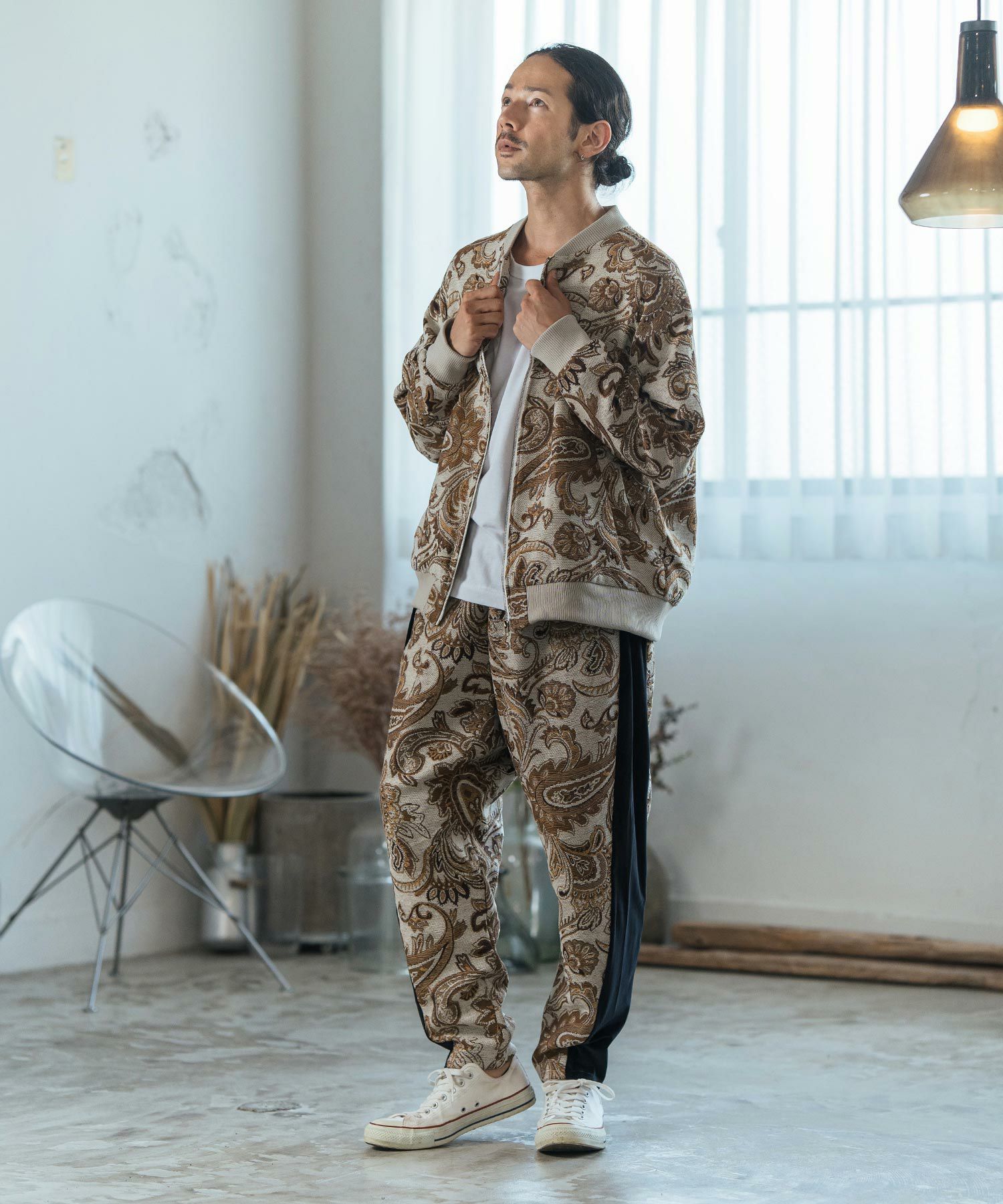 ボトムスはシンプルなものを選ぶことで、アウターの柄が引き立ち、カジュアルからドレッシーまで幅広いスタイルに合わせる事ができます。