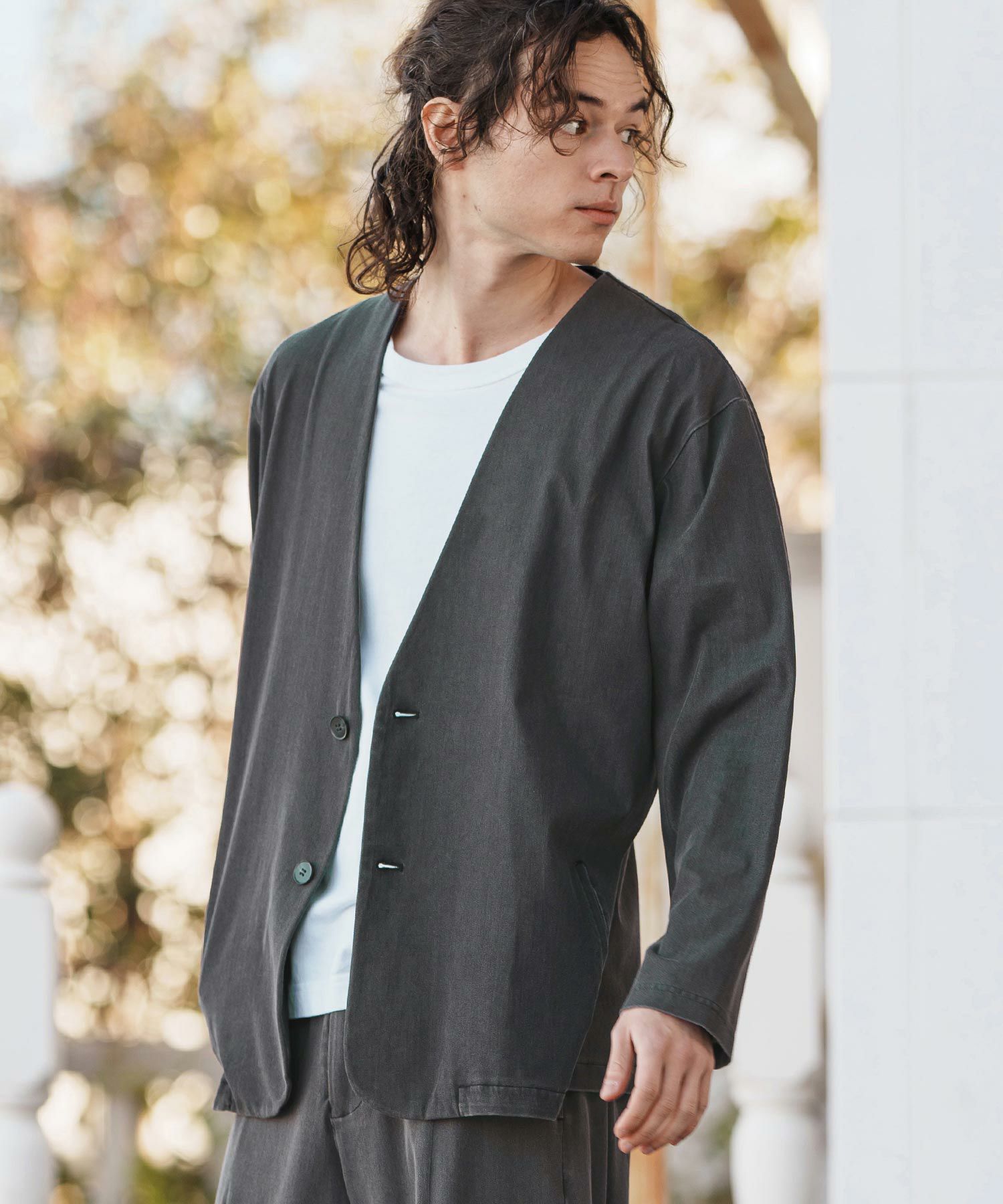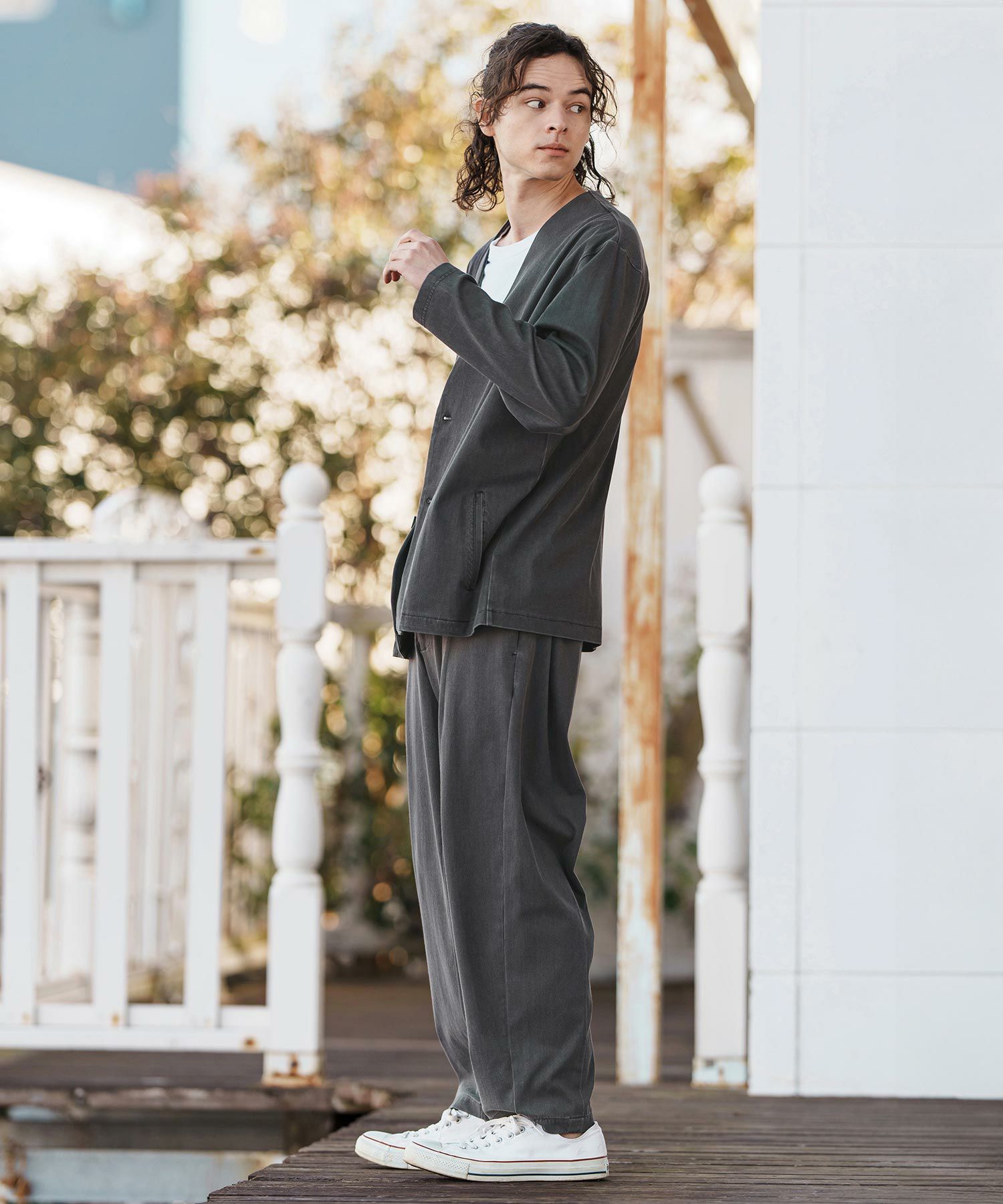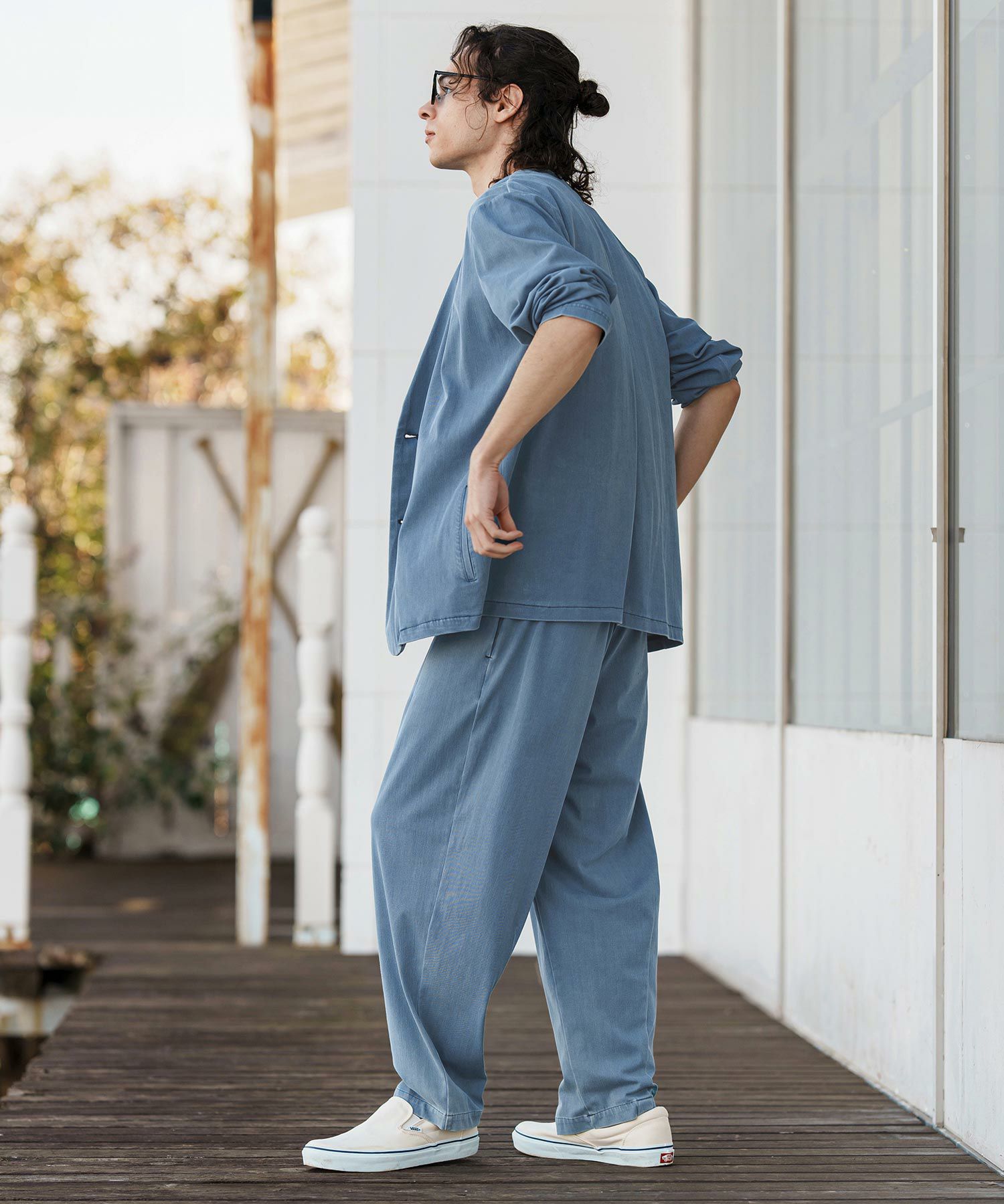 同素材のテーパードパンツの展開もあるので、セットアップ着用も可能。