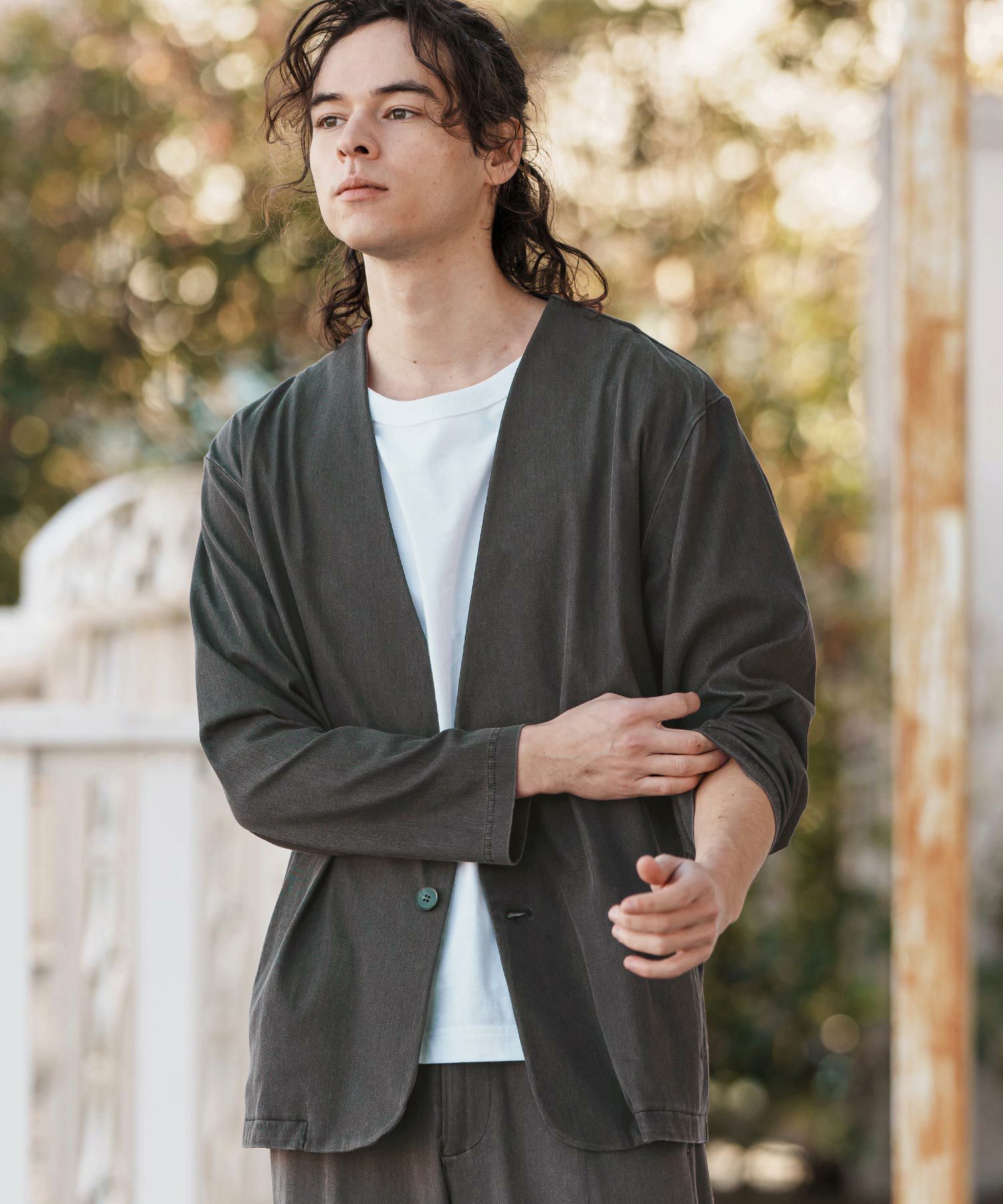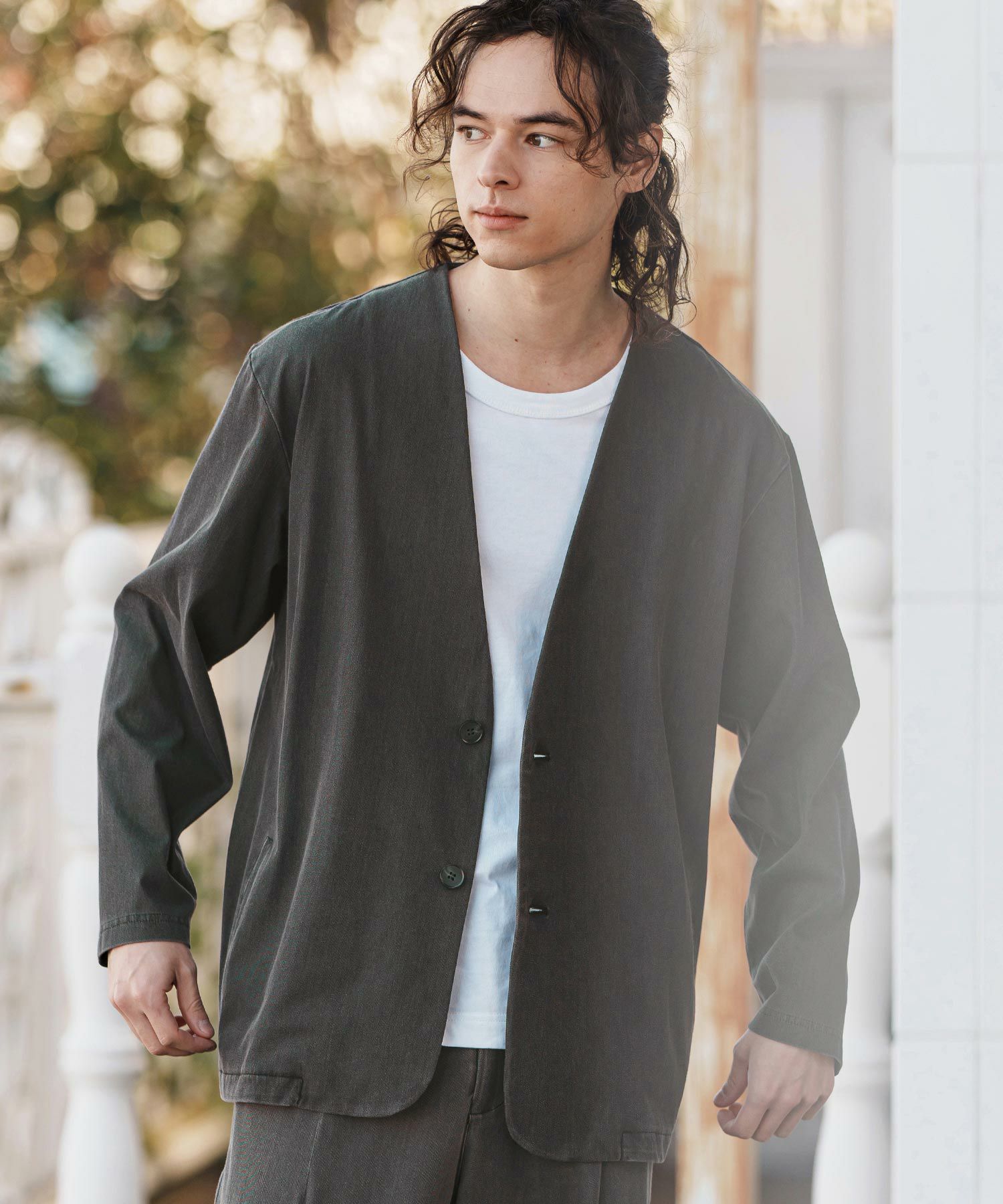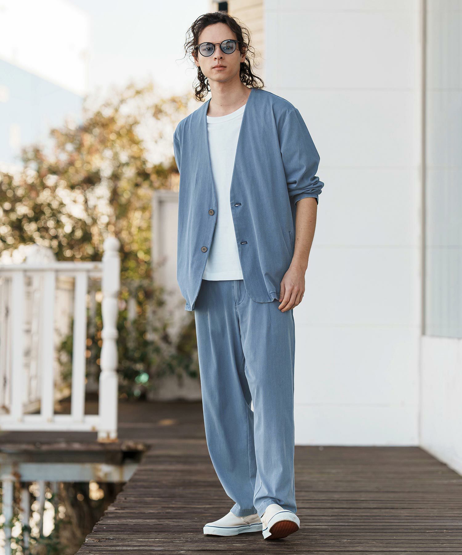 同素材のテーパードパンツの展開もあるので、セットアップ着用も可能。