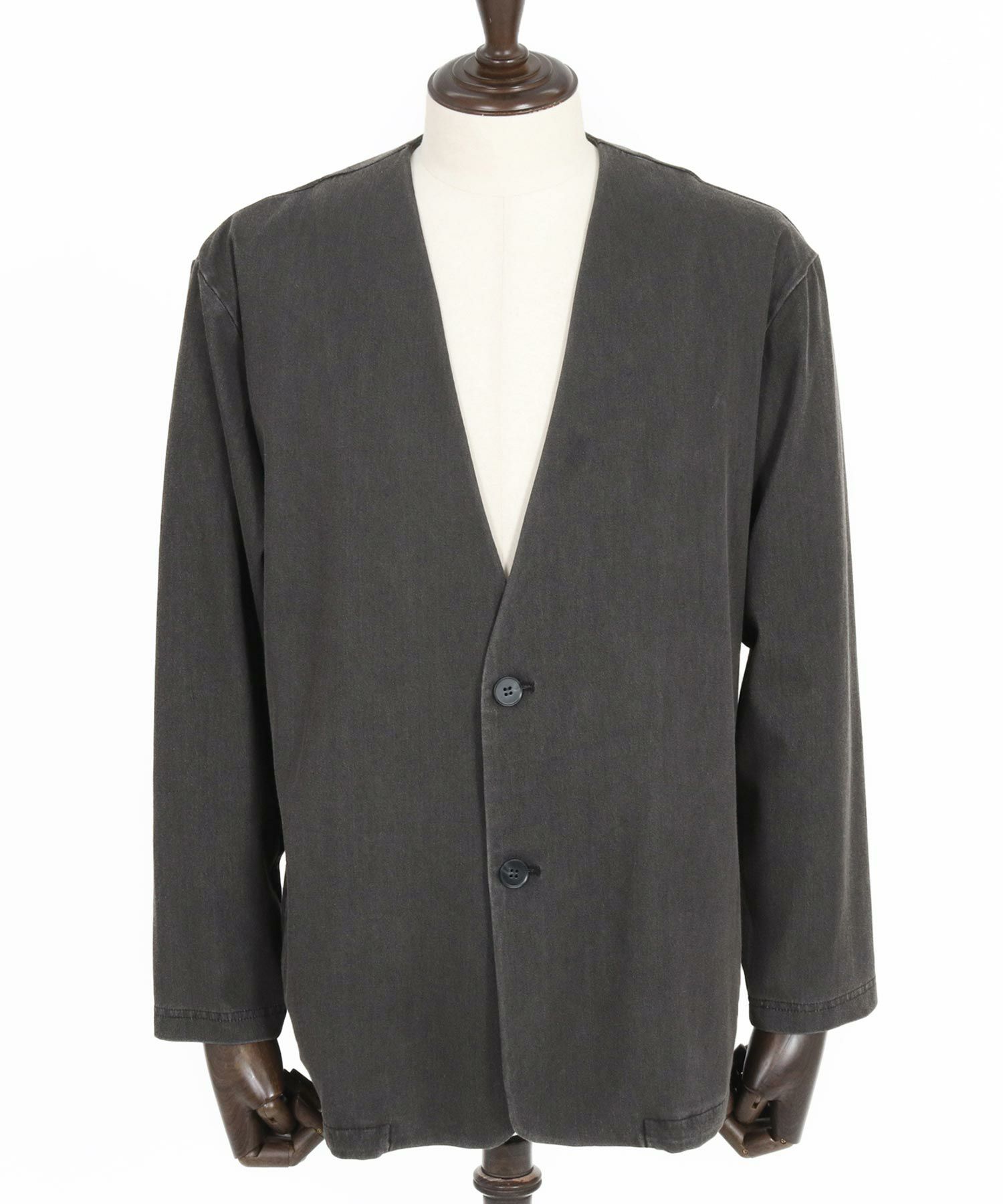 カットデニム素材を使用したノーカラージャケット。