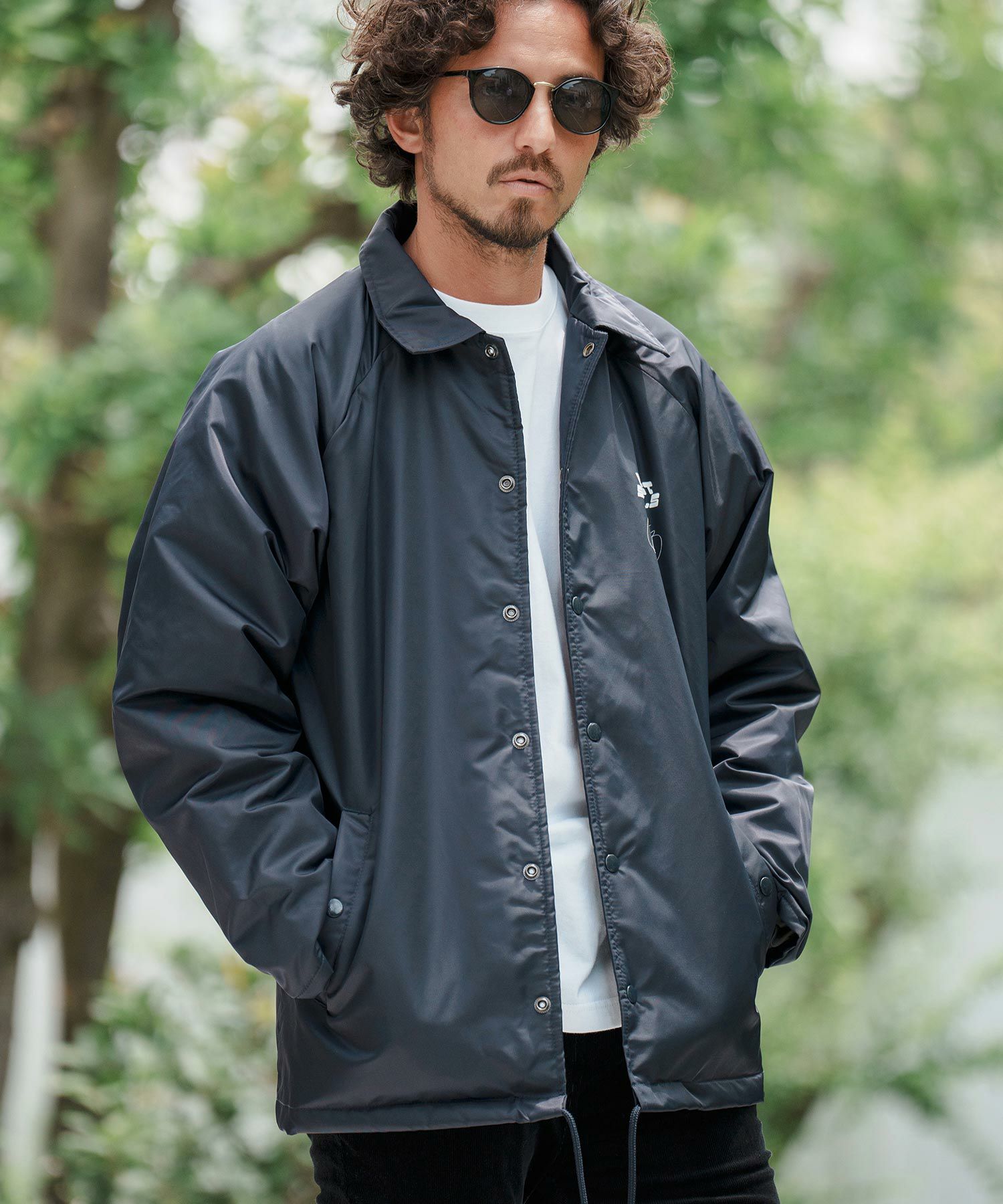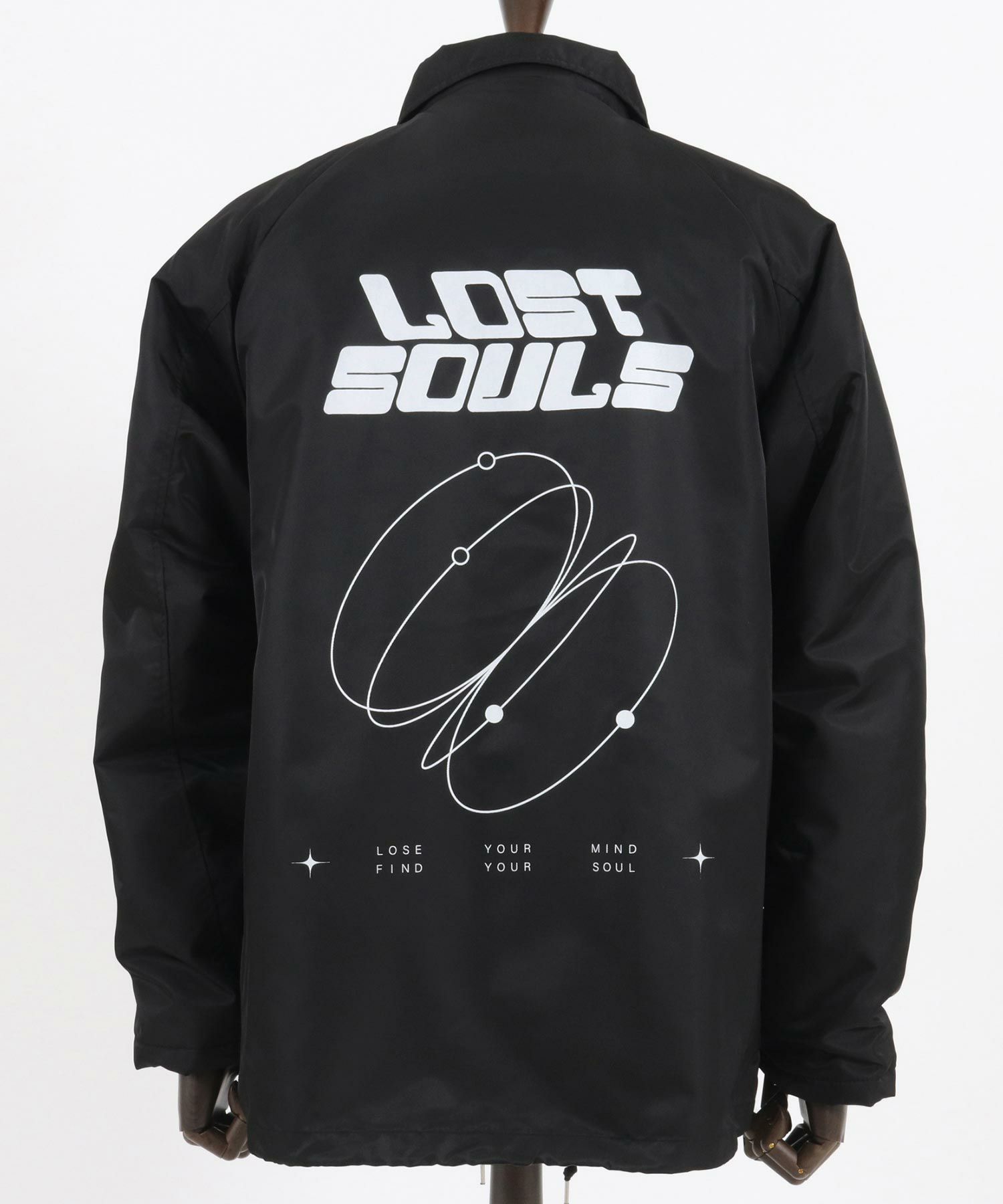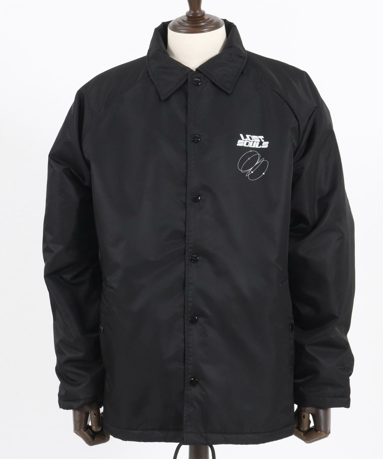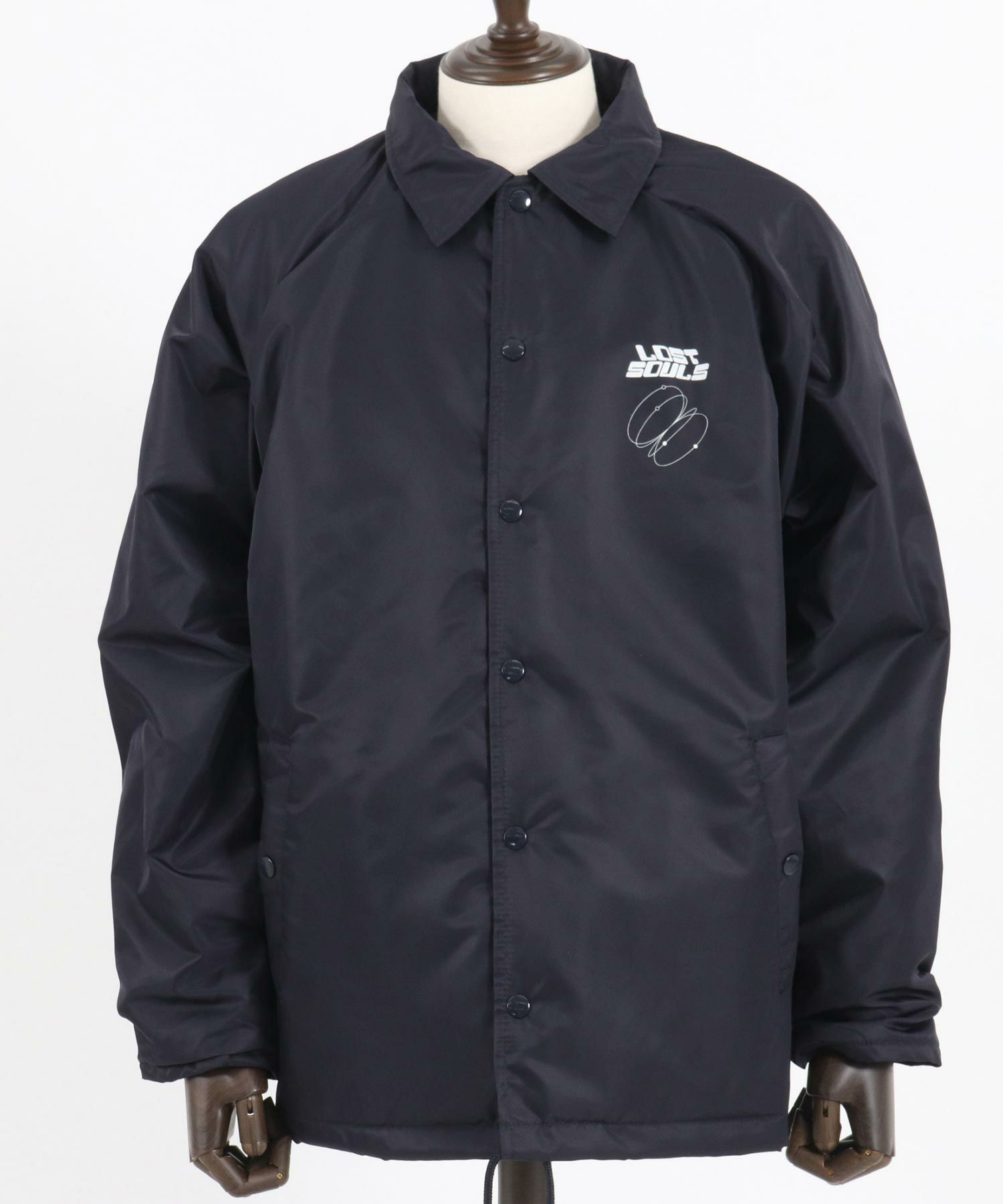 フロントとバックスタイルにメッセージロゴプリントを配置したコーチJKTです。
