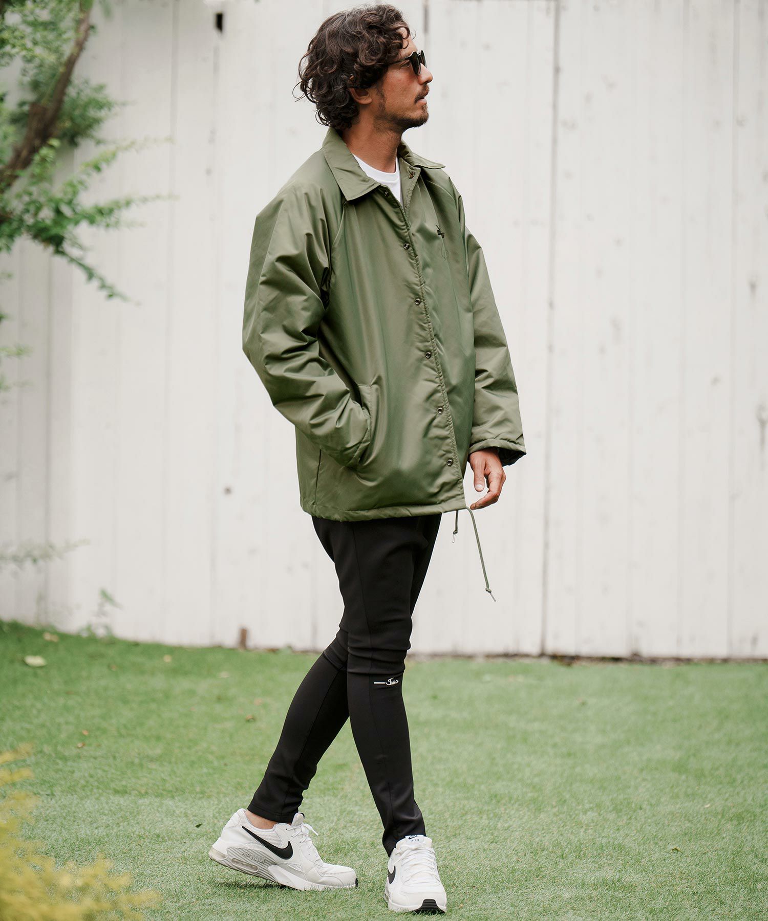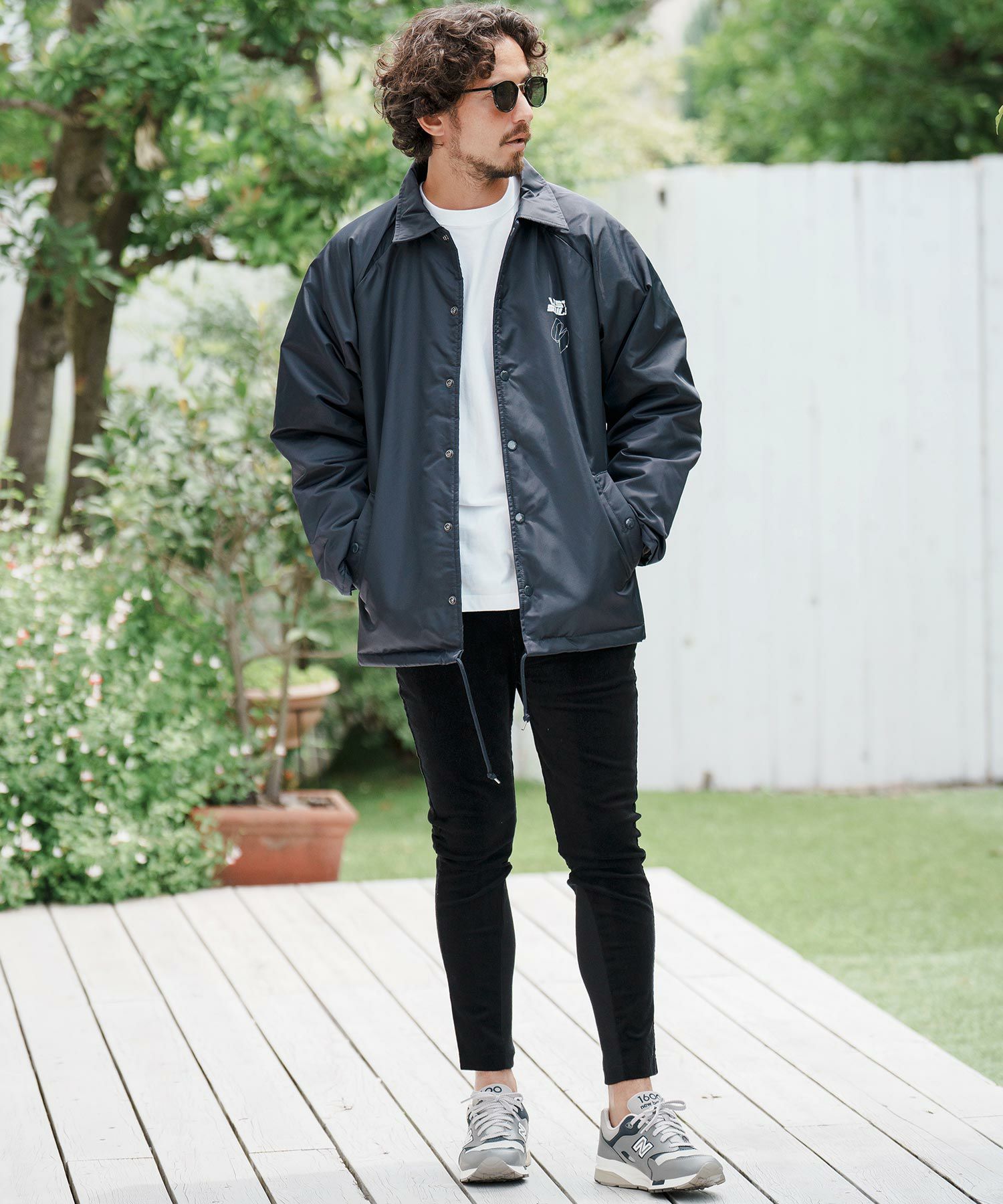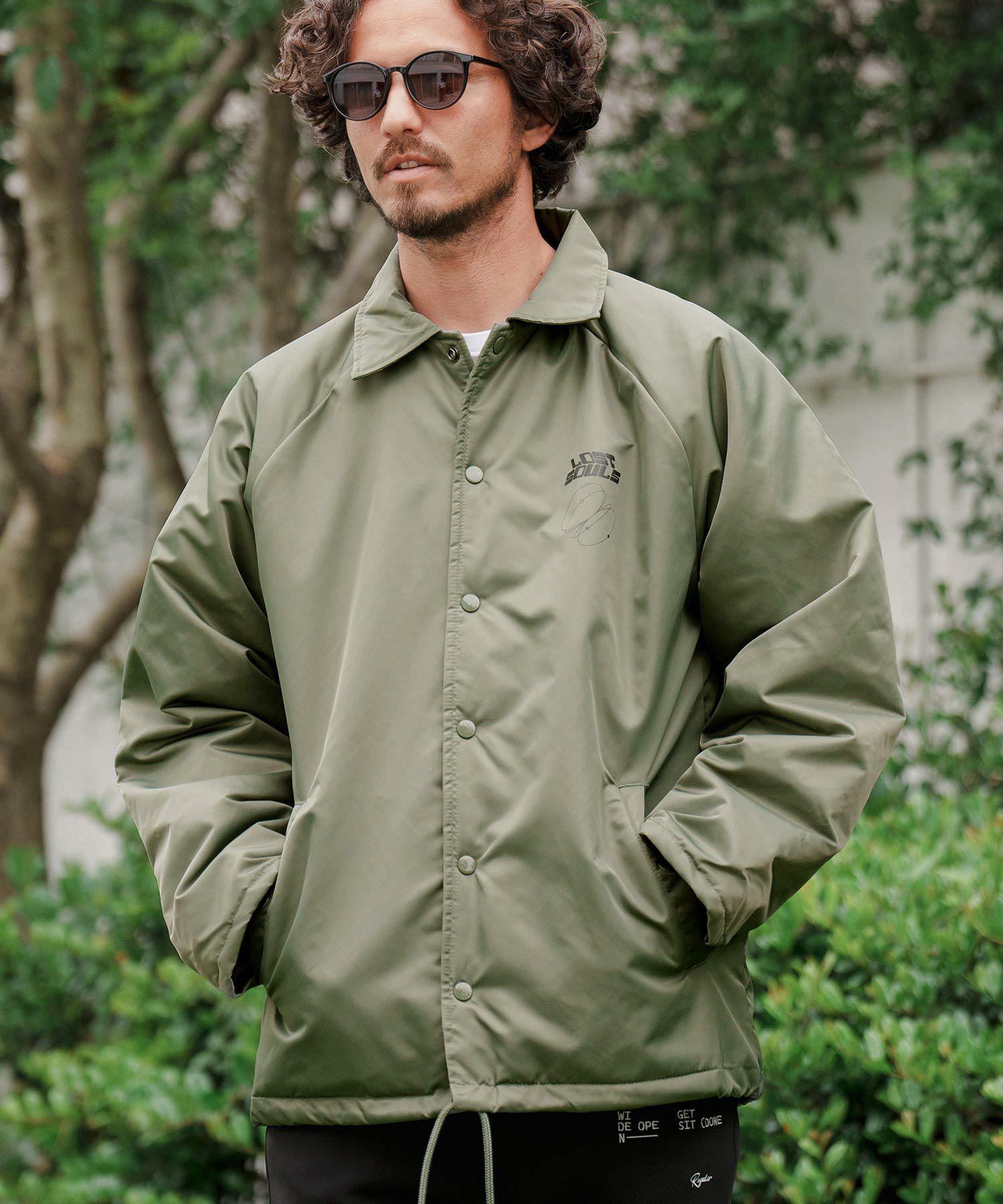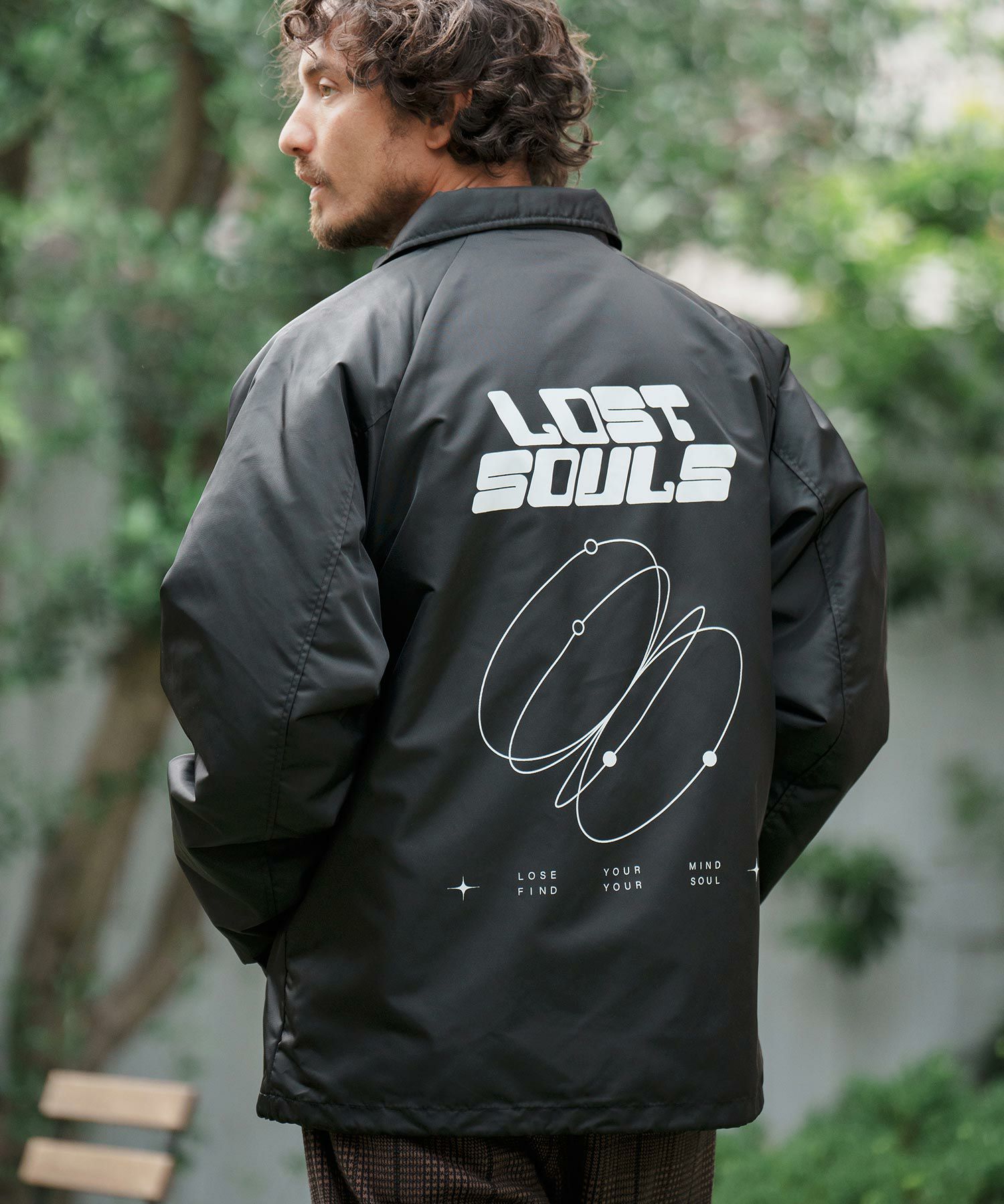 フロントとバックスタイルにメッセージロゴプリントを配置したコーチJKTです。
