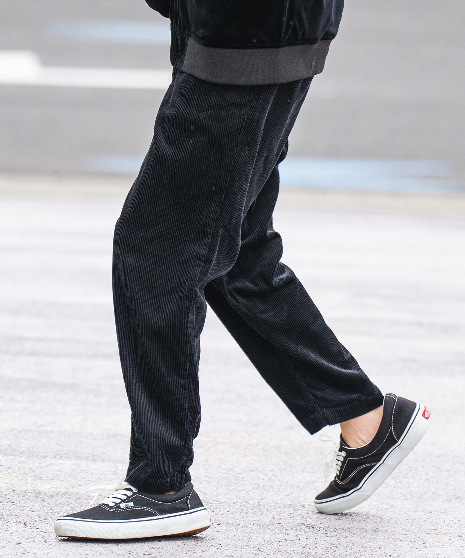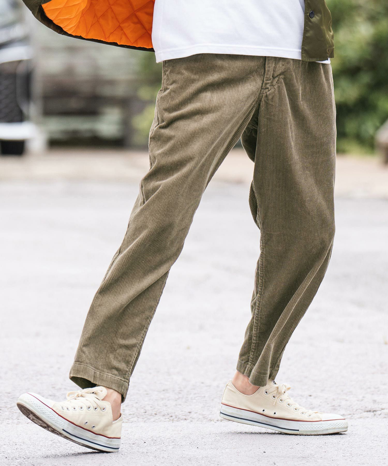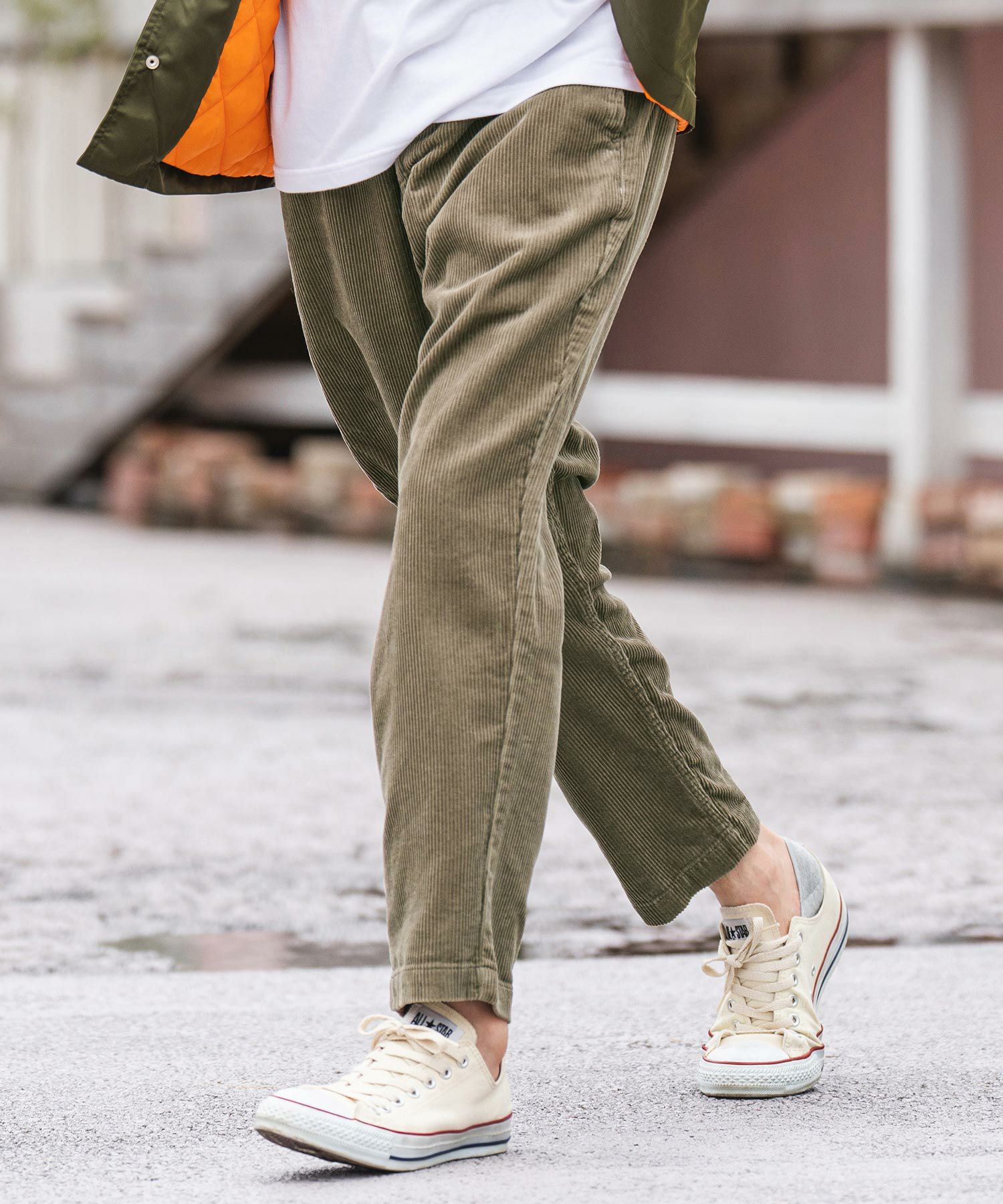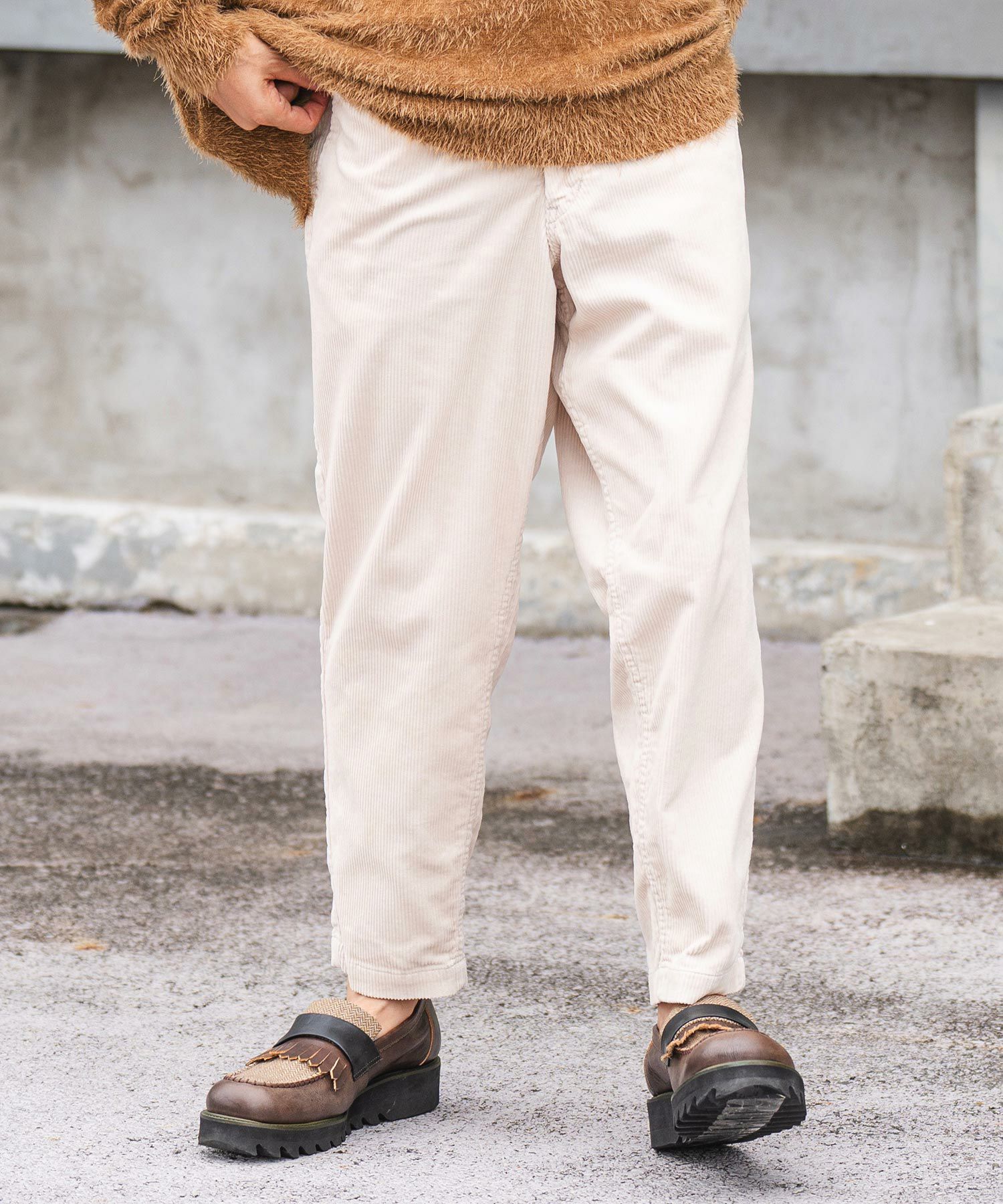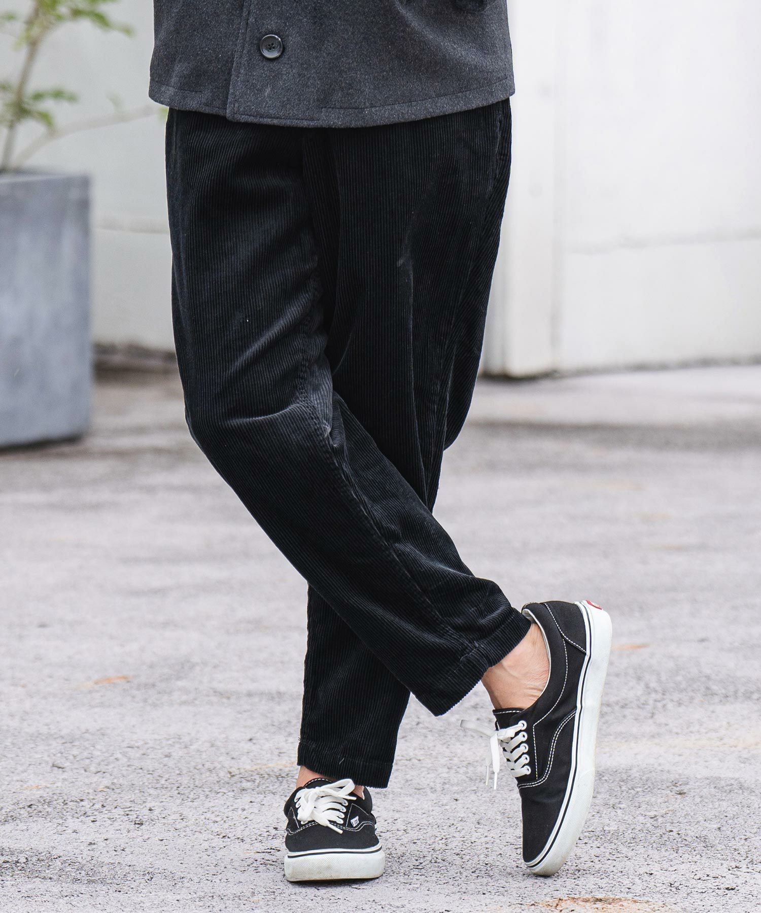 太い畝のコーデュロイ生地を使用したイージータイプのワイドテーパードパンツです。