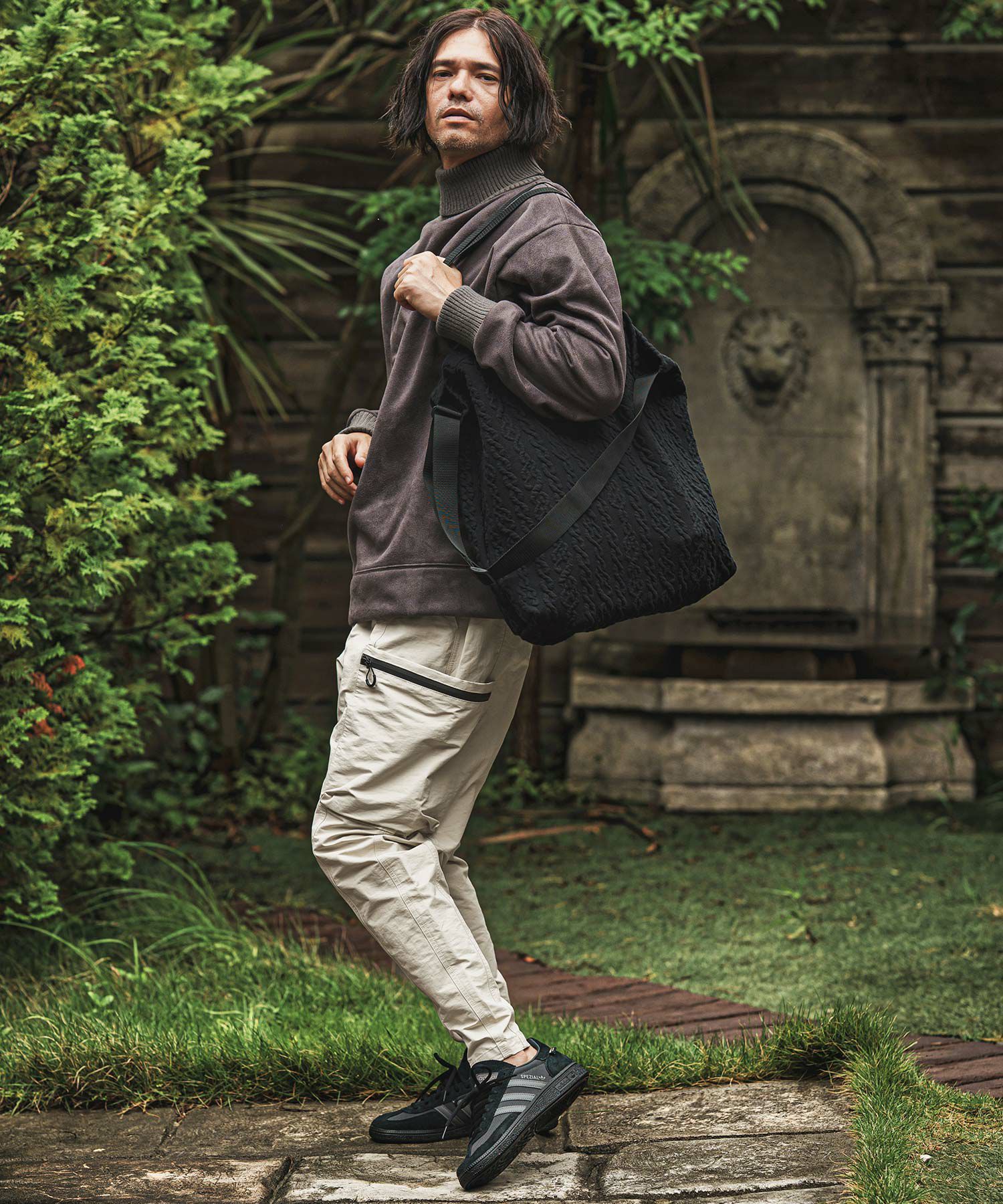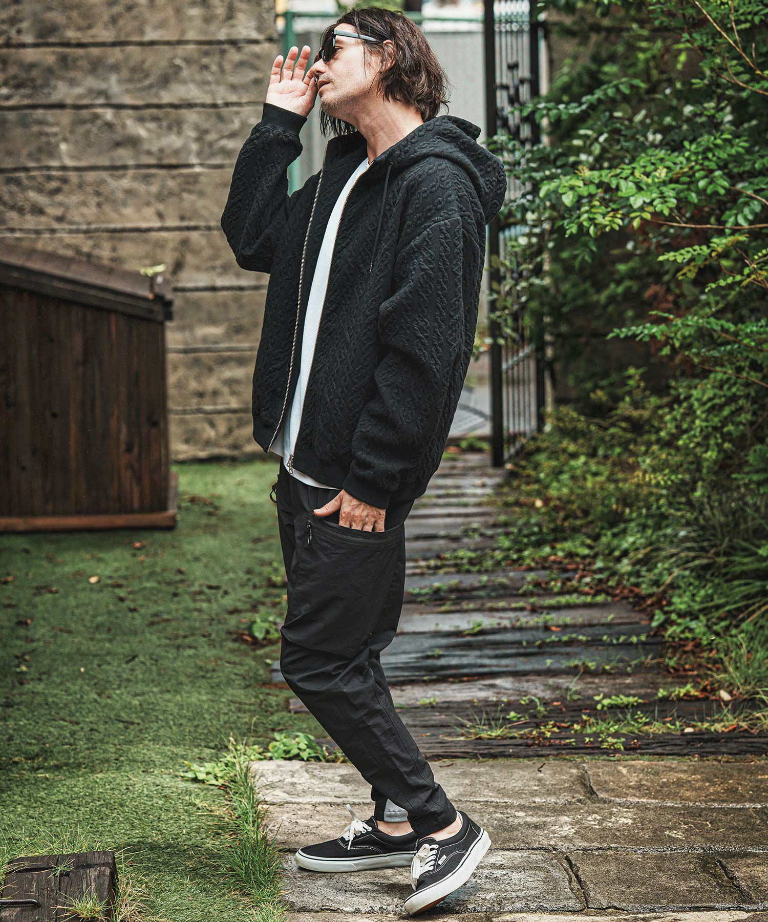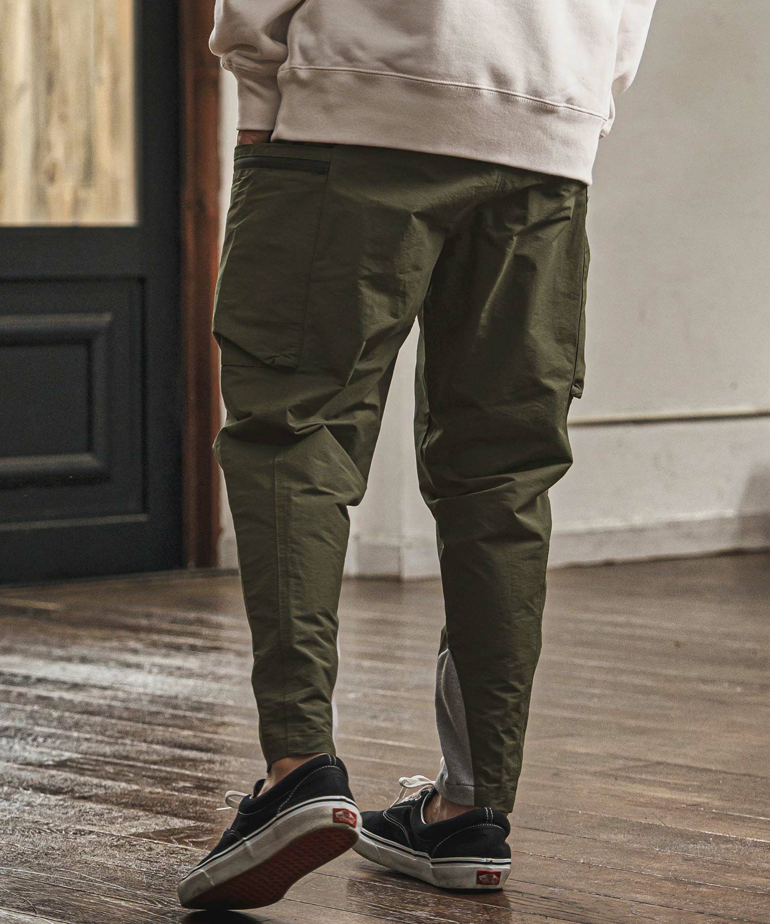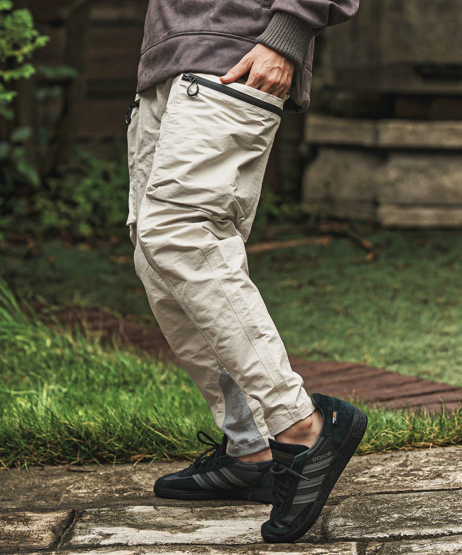 大きめなポケットをサイドに配したテックパンツ。
