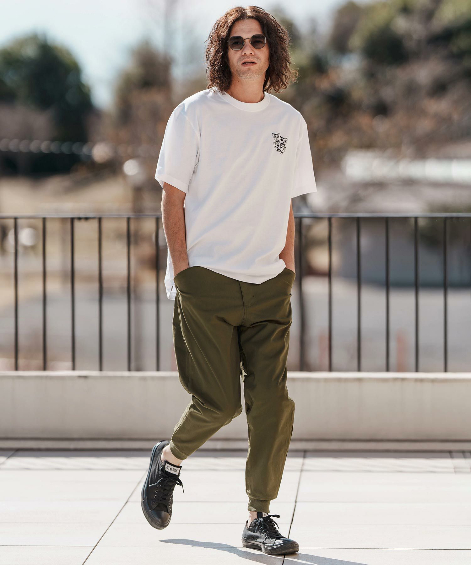175cm B90-W73-H89 靴26.5cmのモデルがLサイズを着用。