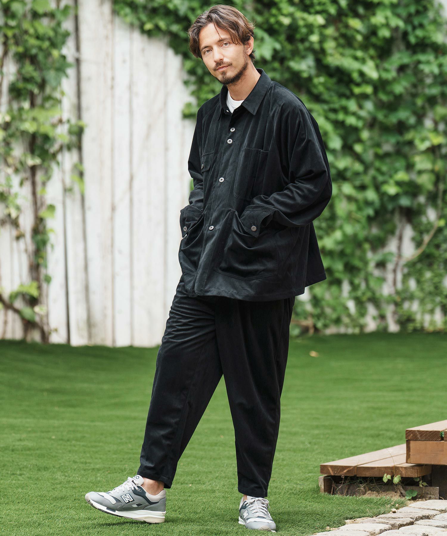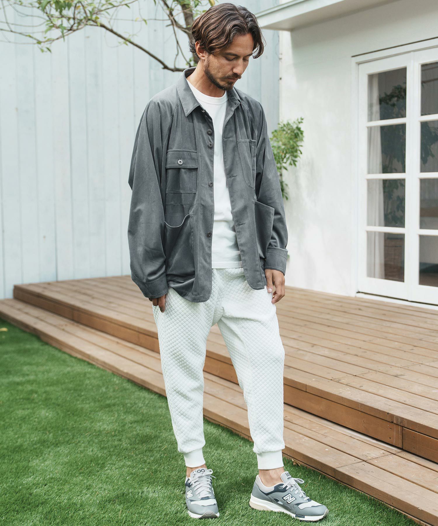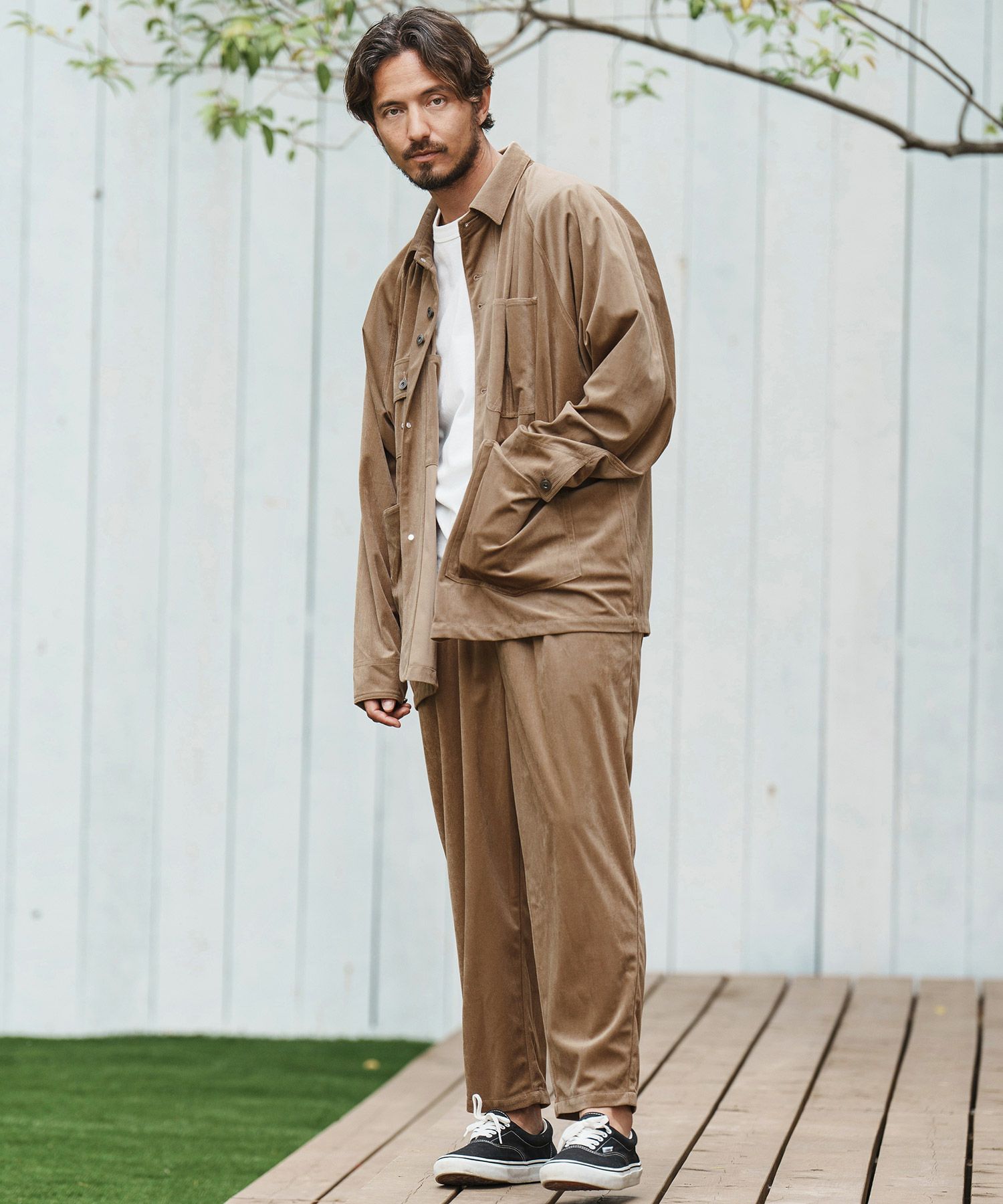 同素材のパンツとセットアップコーディネートも楽しめるアイテムです。