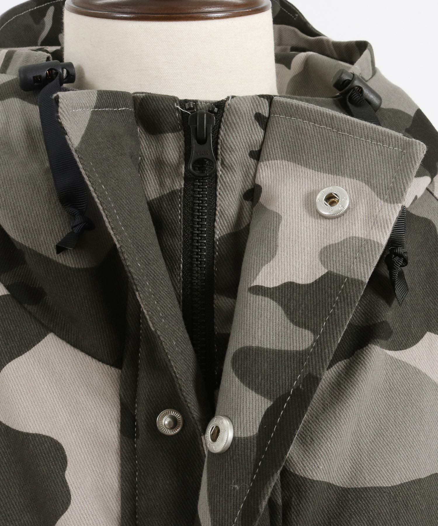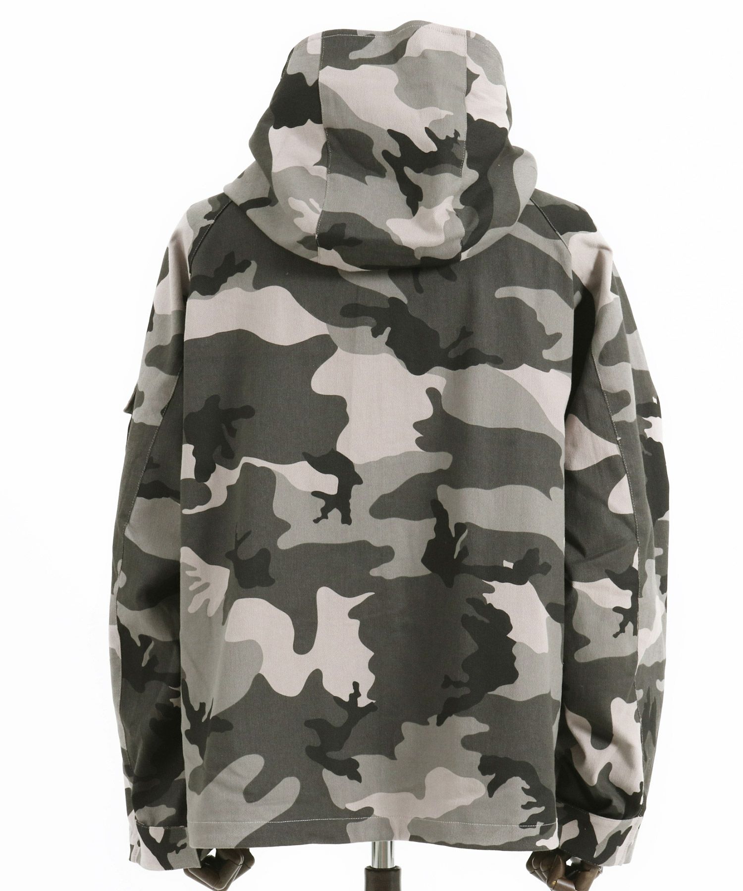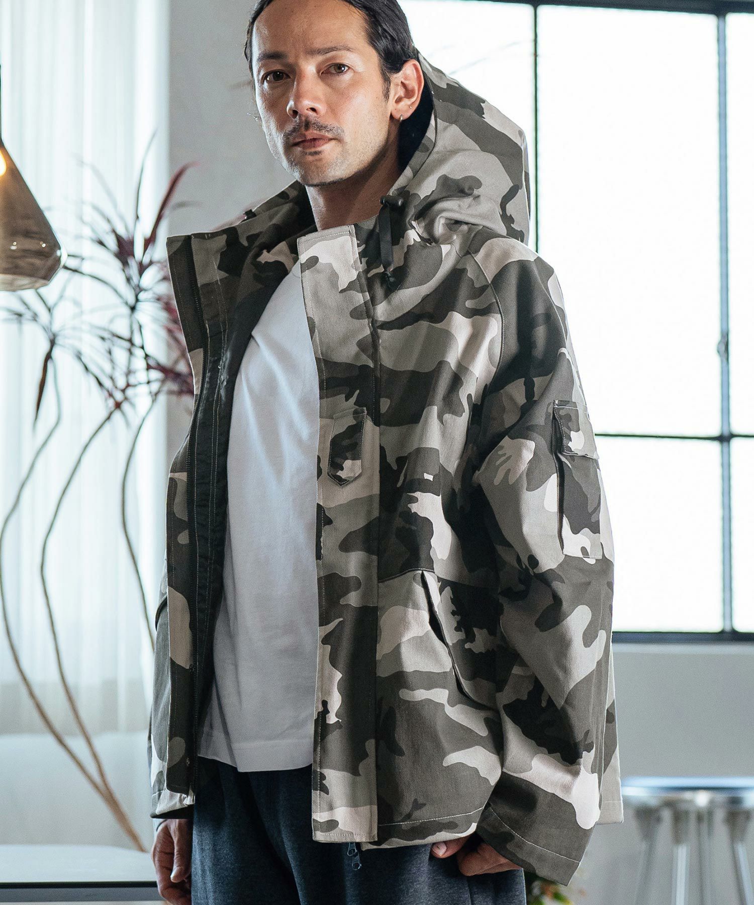 カモフラージュテキスタイルを使用したミリタリーテイストのマウンテンパーカー、US古着をオマージュし現代的なイメージにモディファイした1着です。