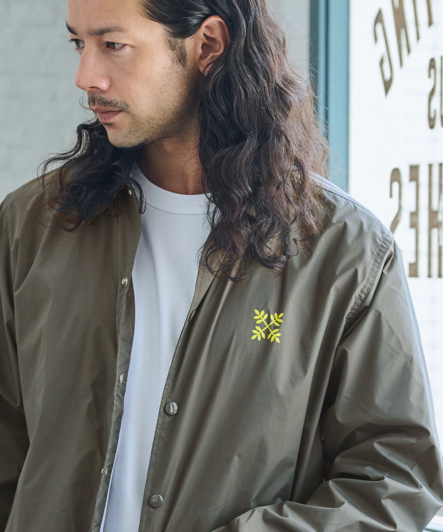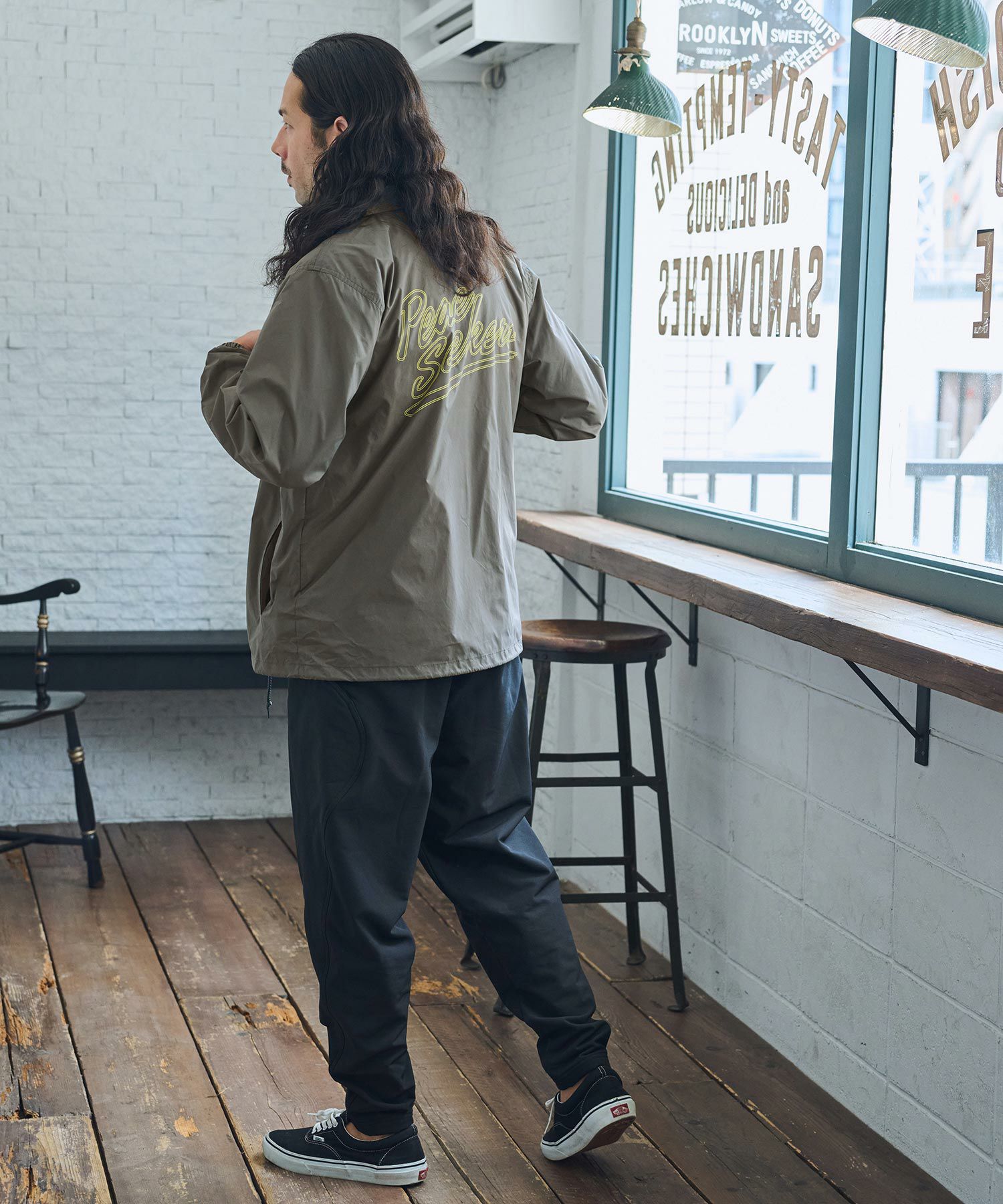 フロントには平和を象徴するオリーブの葉をモチーフにグラフィックを作成し、バッグにはネオン管のよなフォントでPeace Seekers(平和探求者)とプリントを施したコーチジャケット。
