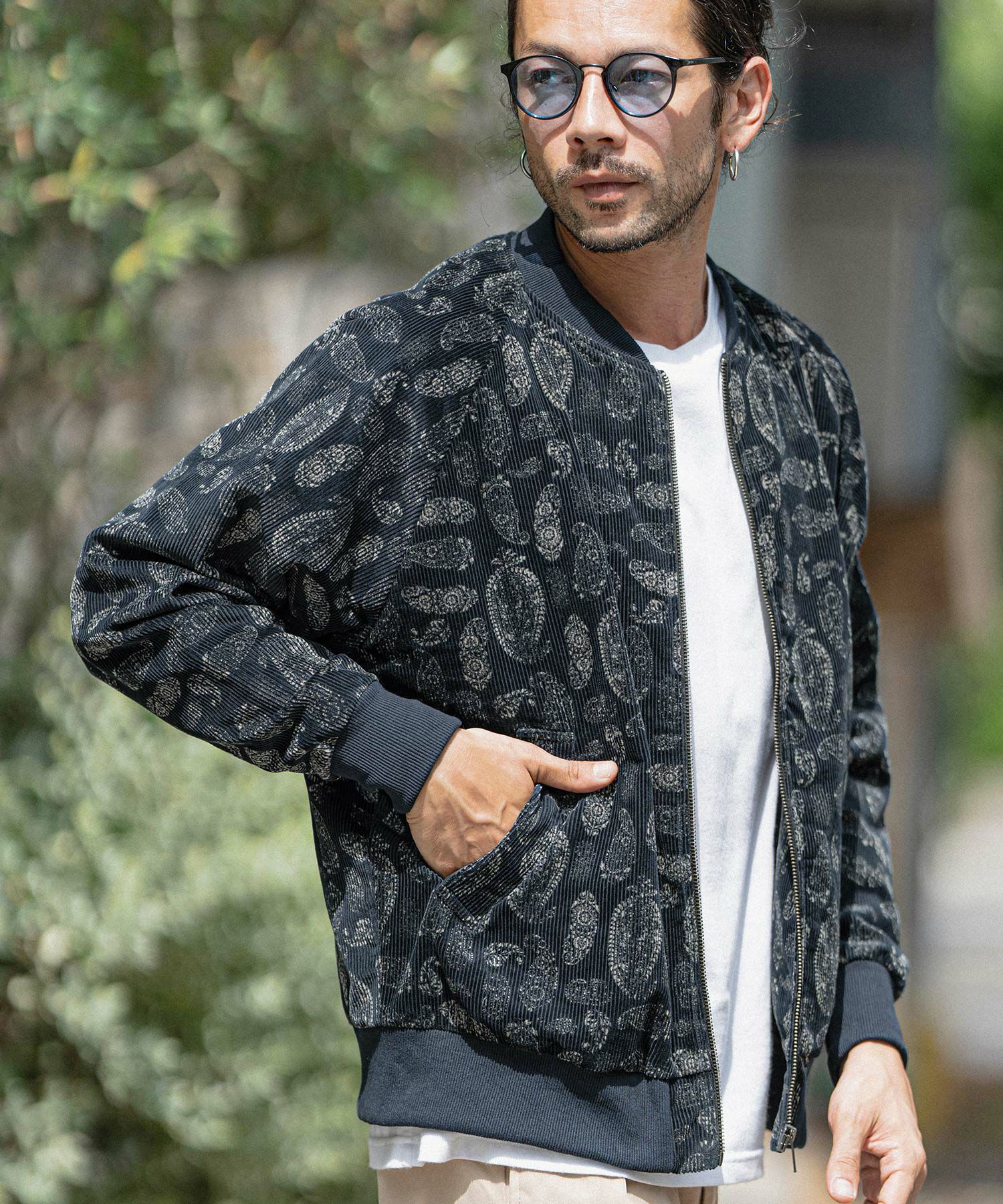 コーデュロイ生地は縦のリブが特徴であり、その上に施された柄は、JKTに個性的なアクセントを加えます。