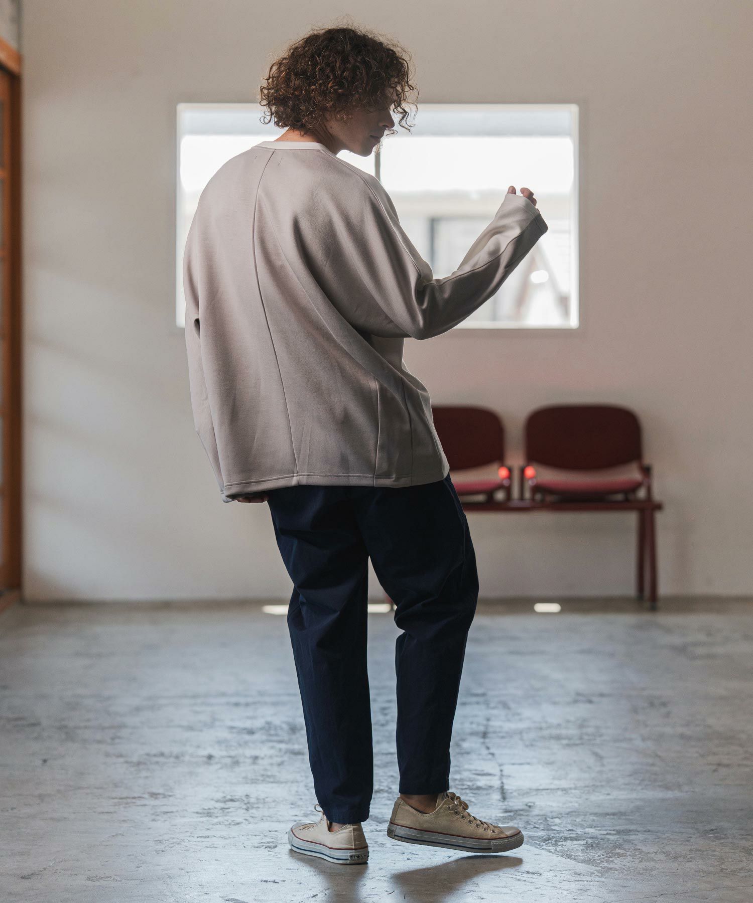 袖口と背面裾部分はデザインダーツでアクセントディティールを用いたポンチョ型のプルオーバー。