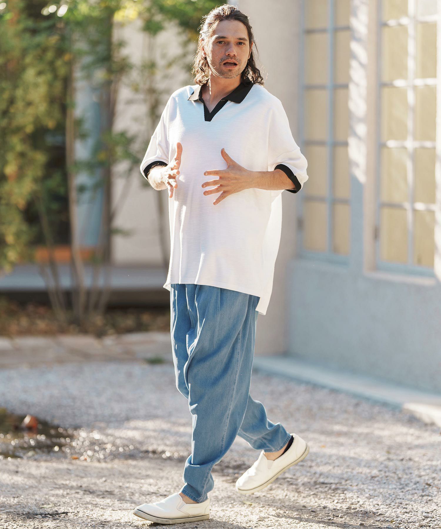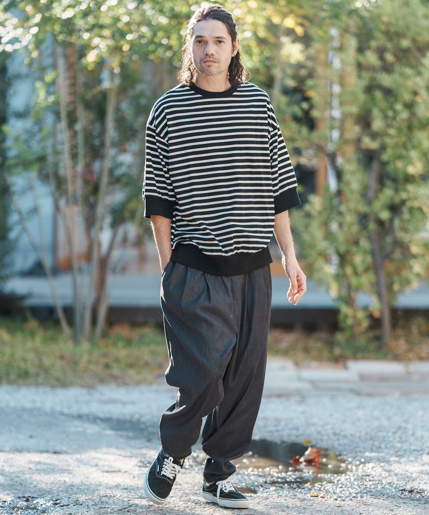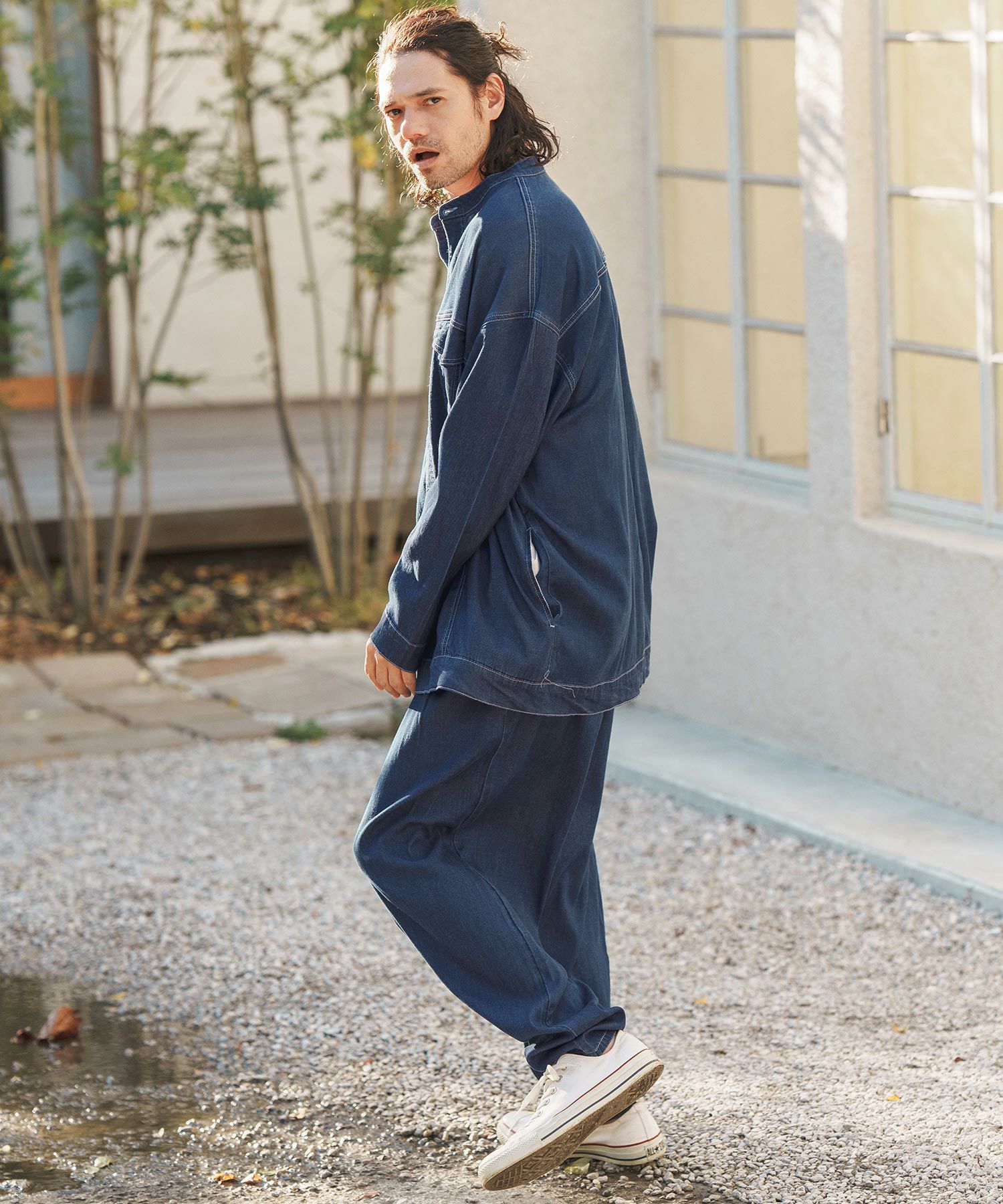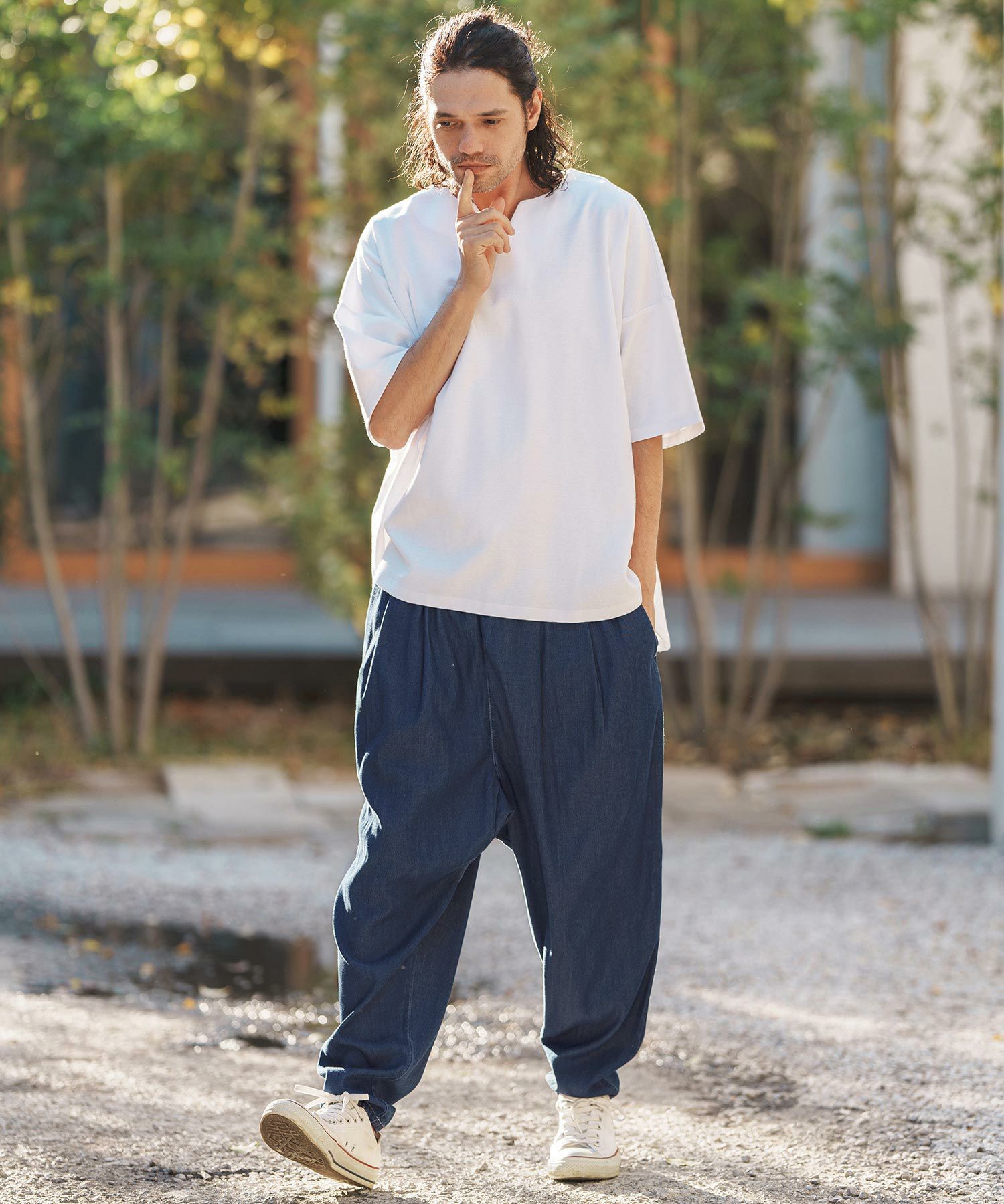 ワタリからヒップにかけてワイドに、股上は通常のパンツよりも深めに設定したリラックス感のあるシルエットです。
