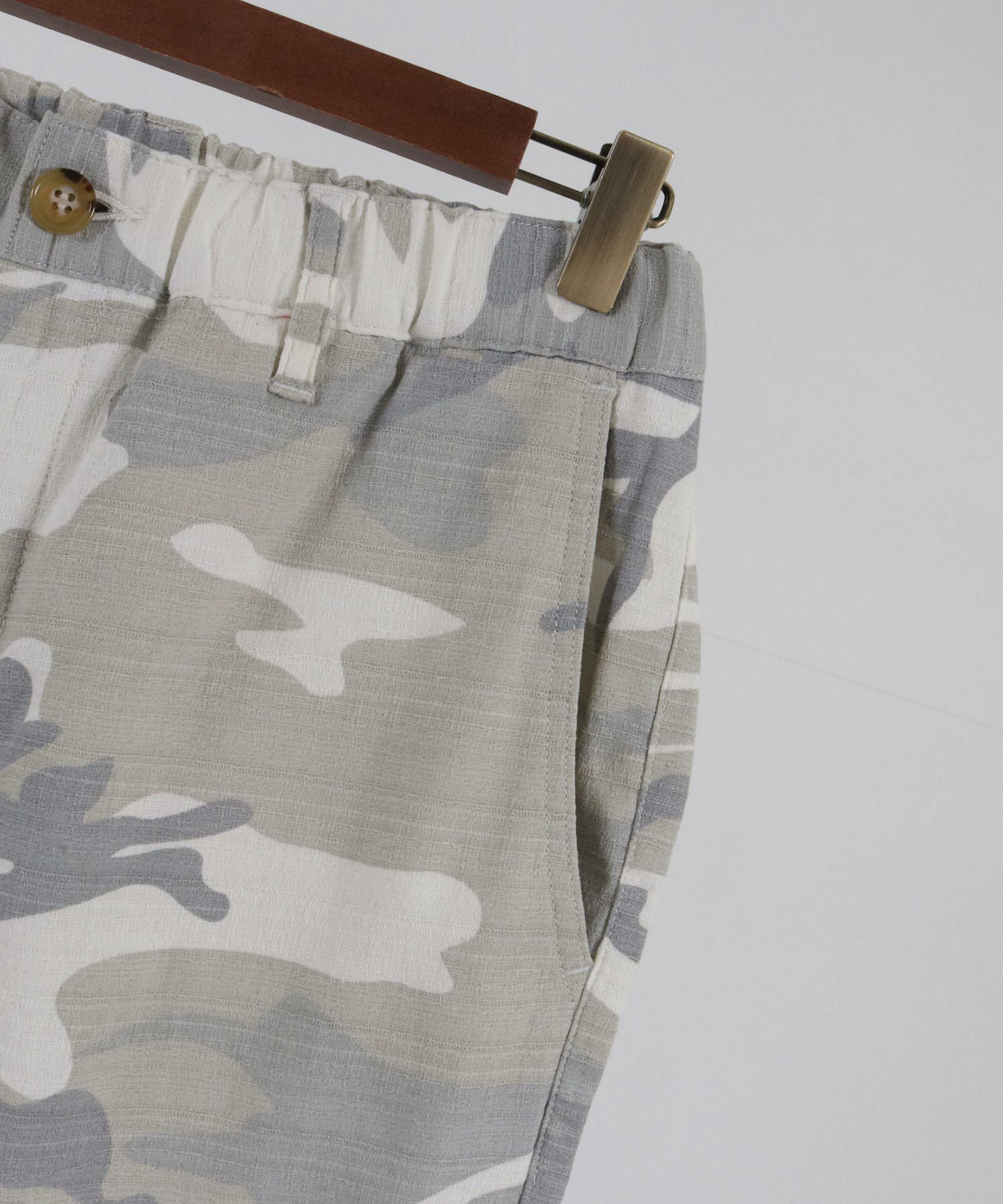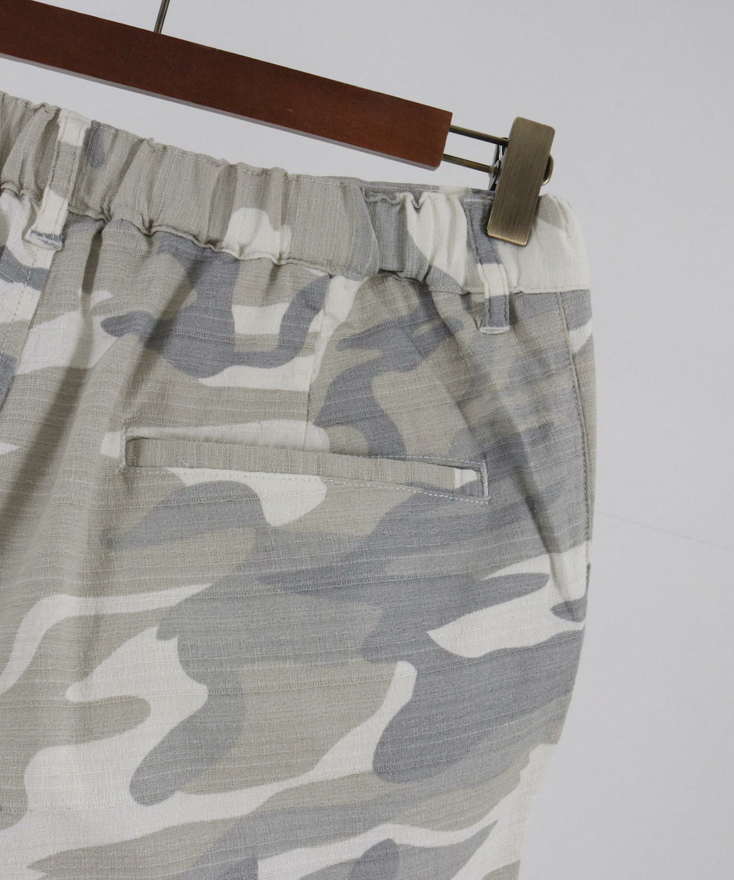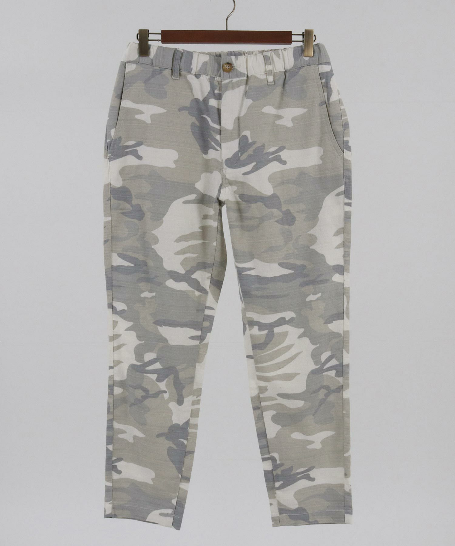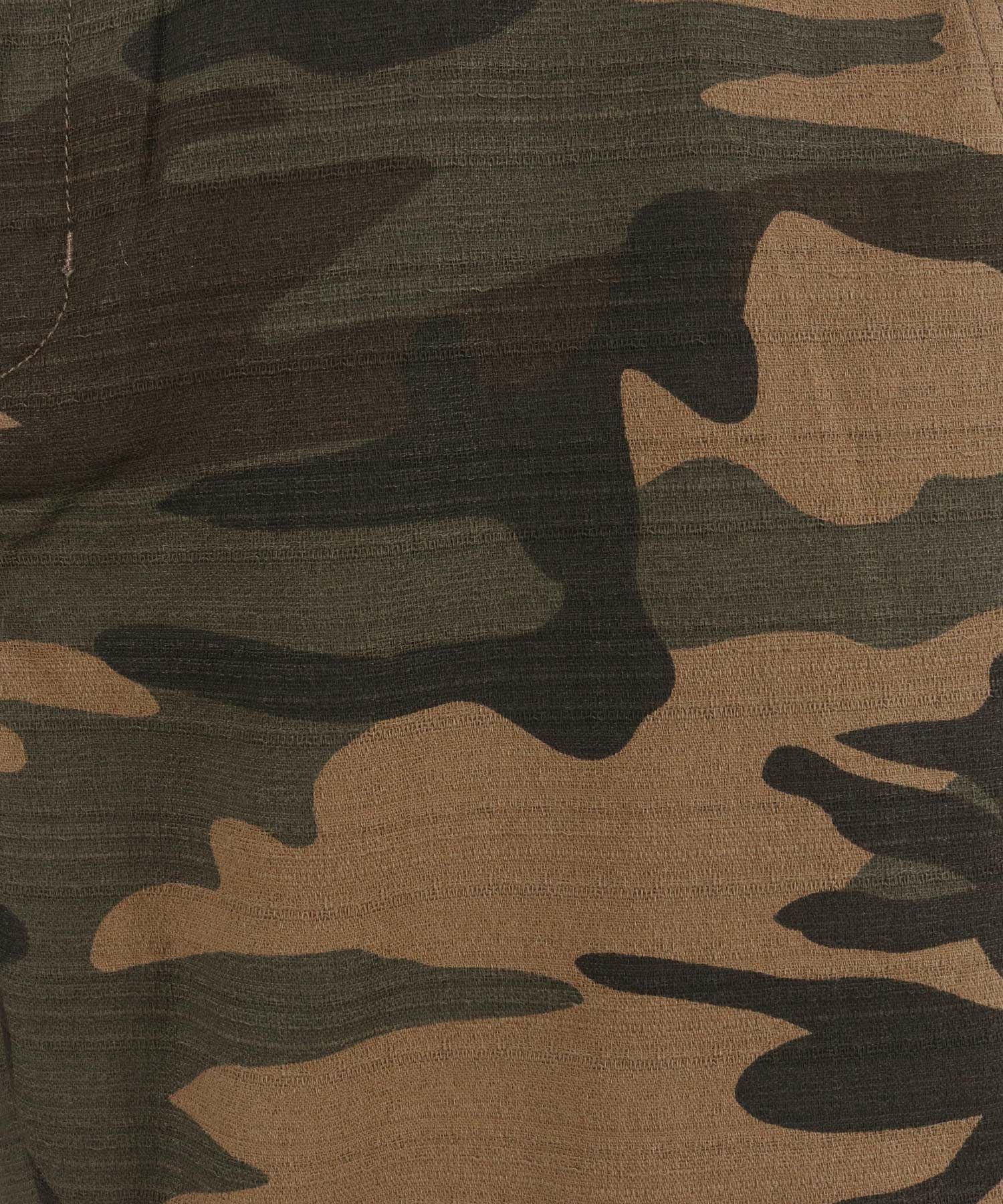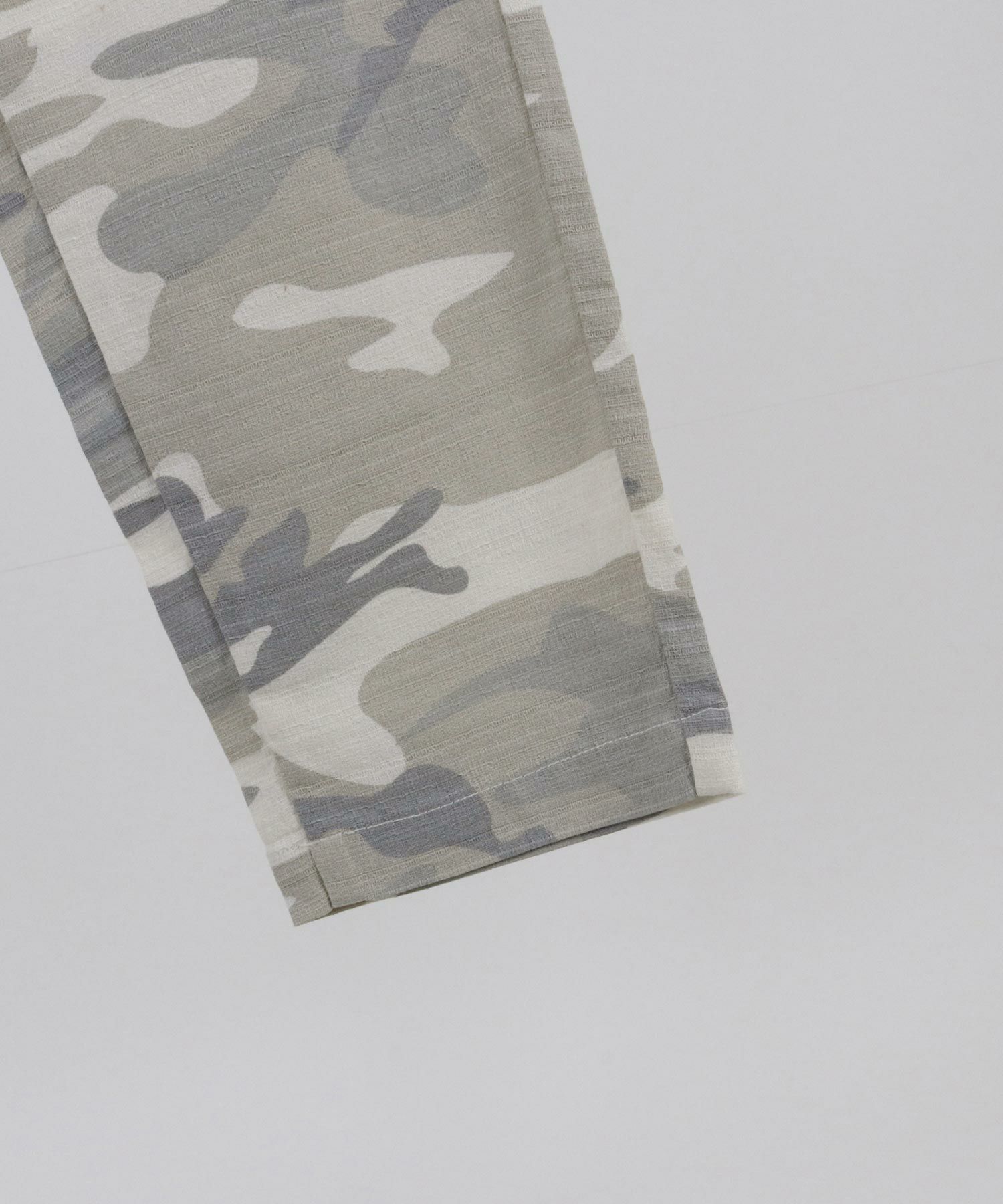天然素材でザックリした生地感のバニランに迷彩柄をプリントした生地を使用したRELAX型アンクル丈パンツです。
