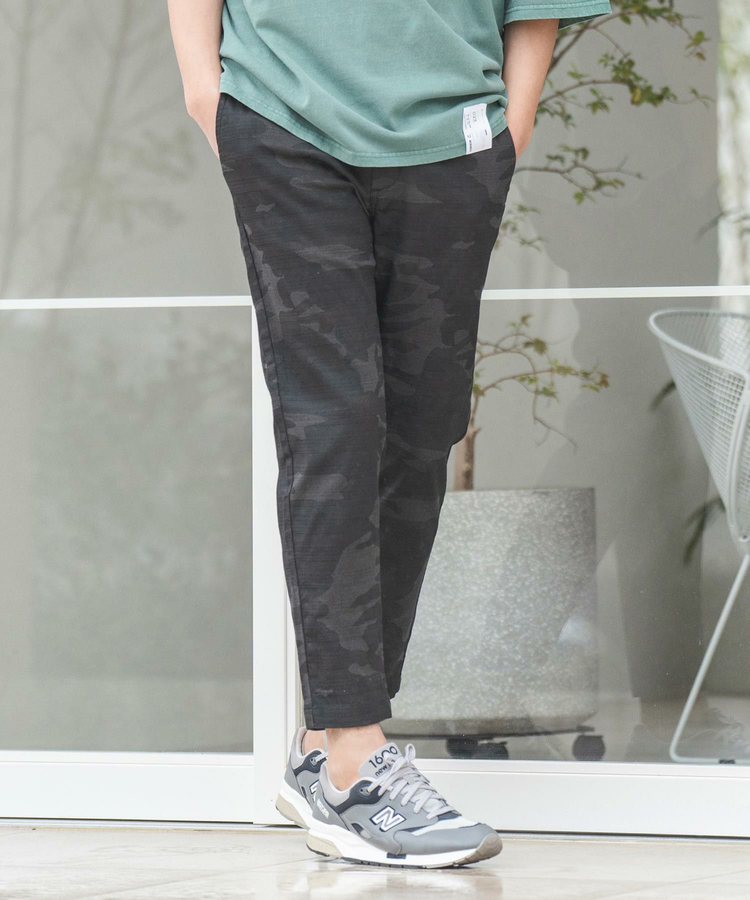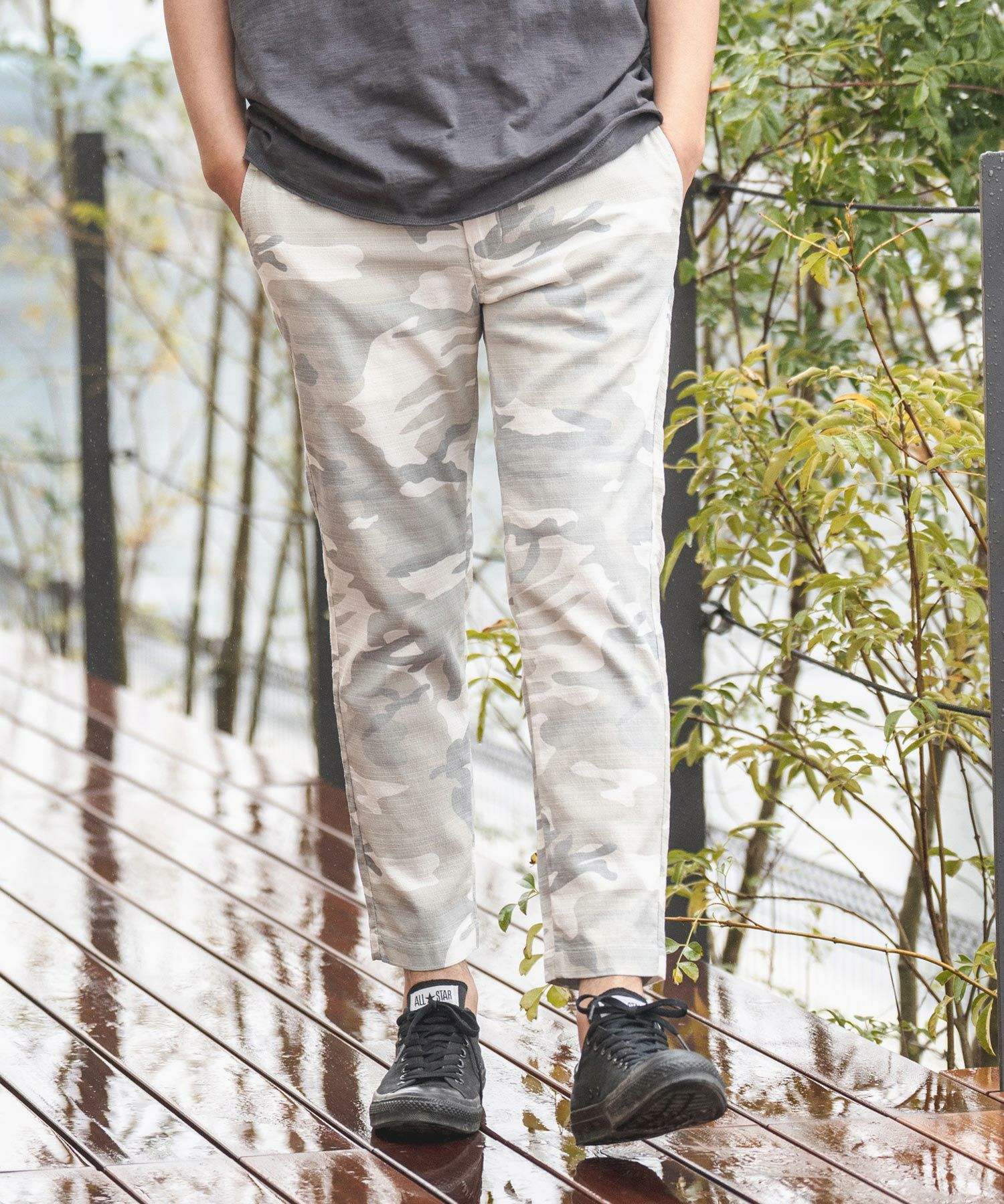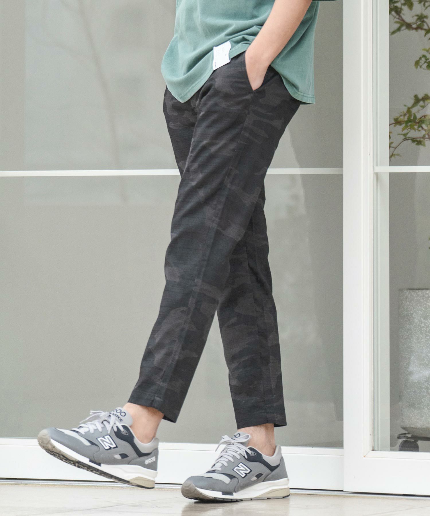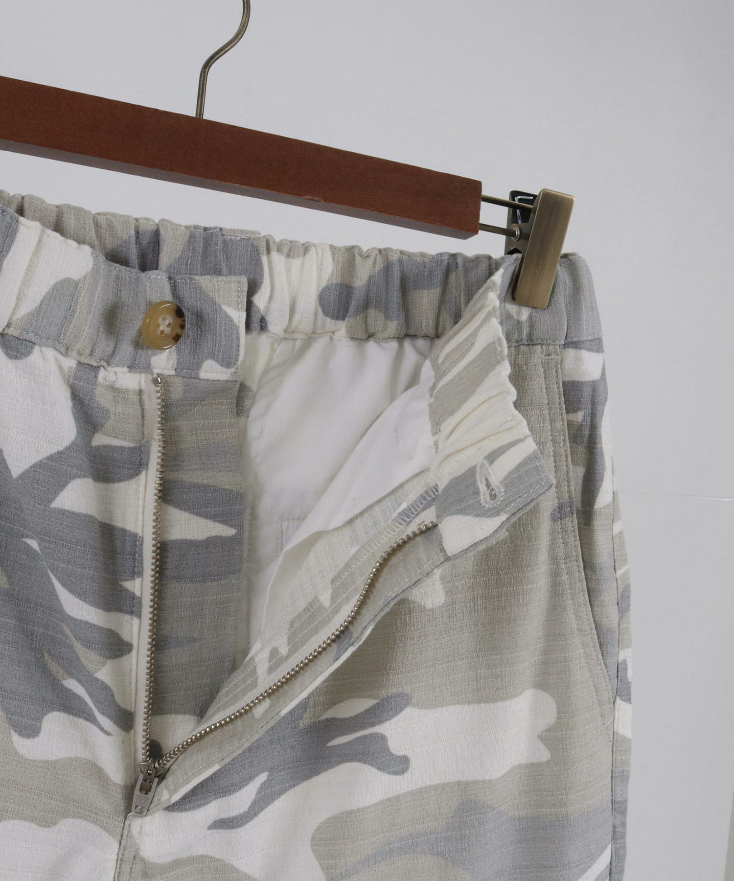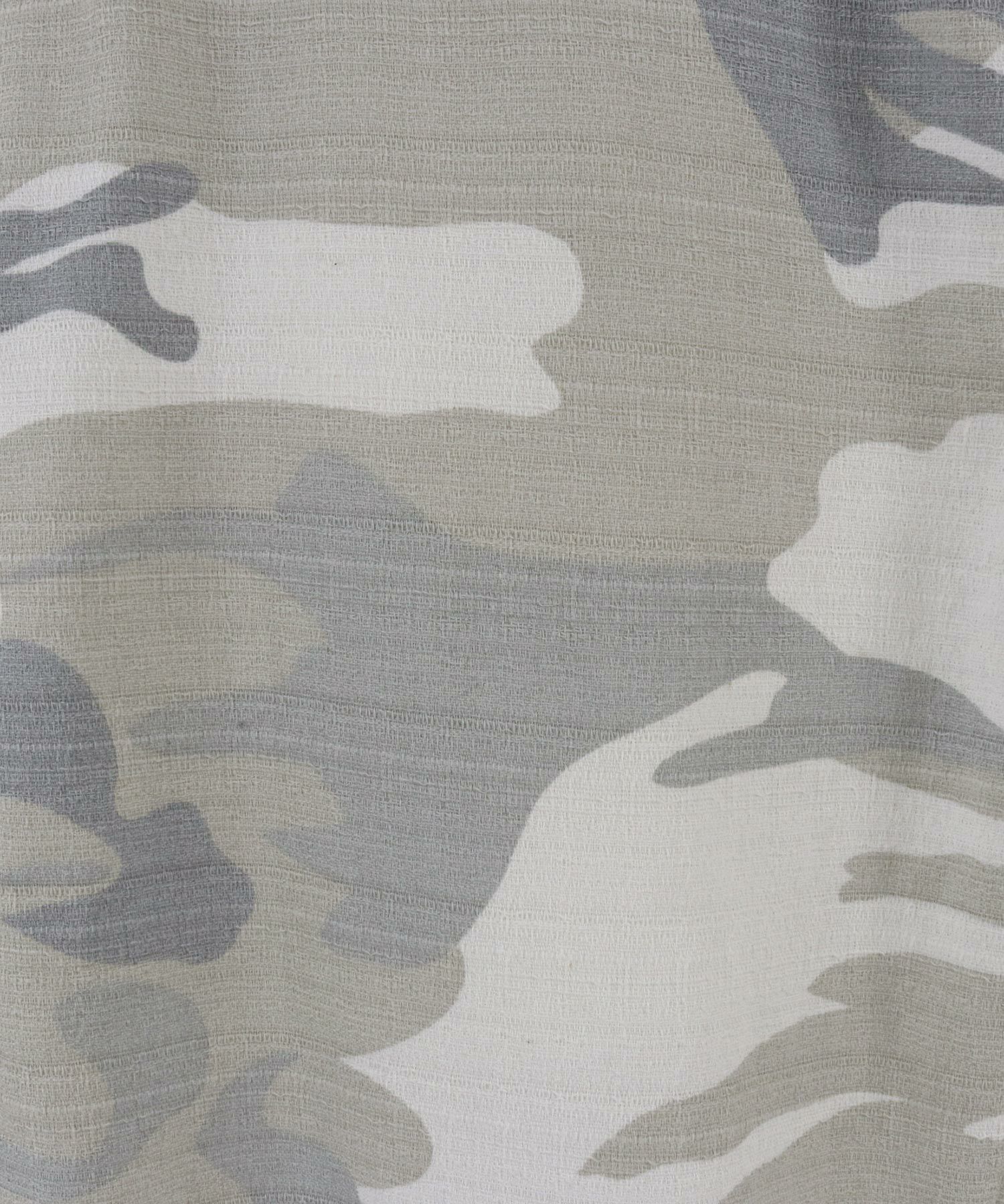 天然素材でザックリした生地感のバニランに迷彩柄をプリントした生地を使用したRELAX型アンクル丈パンツです。