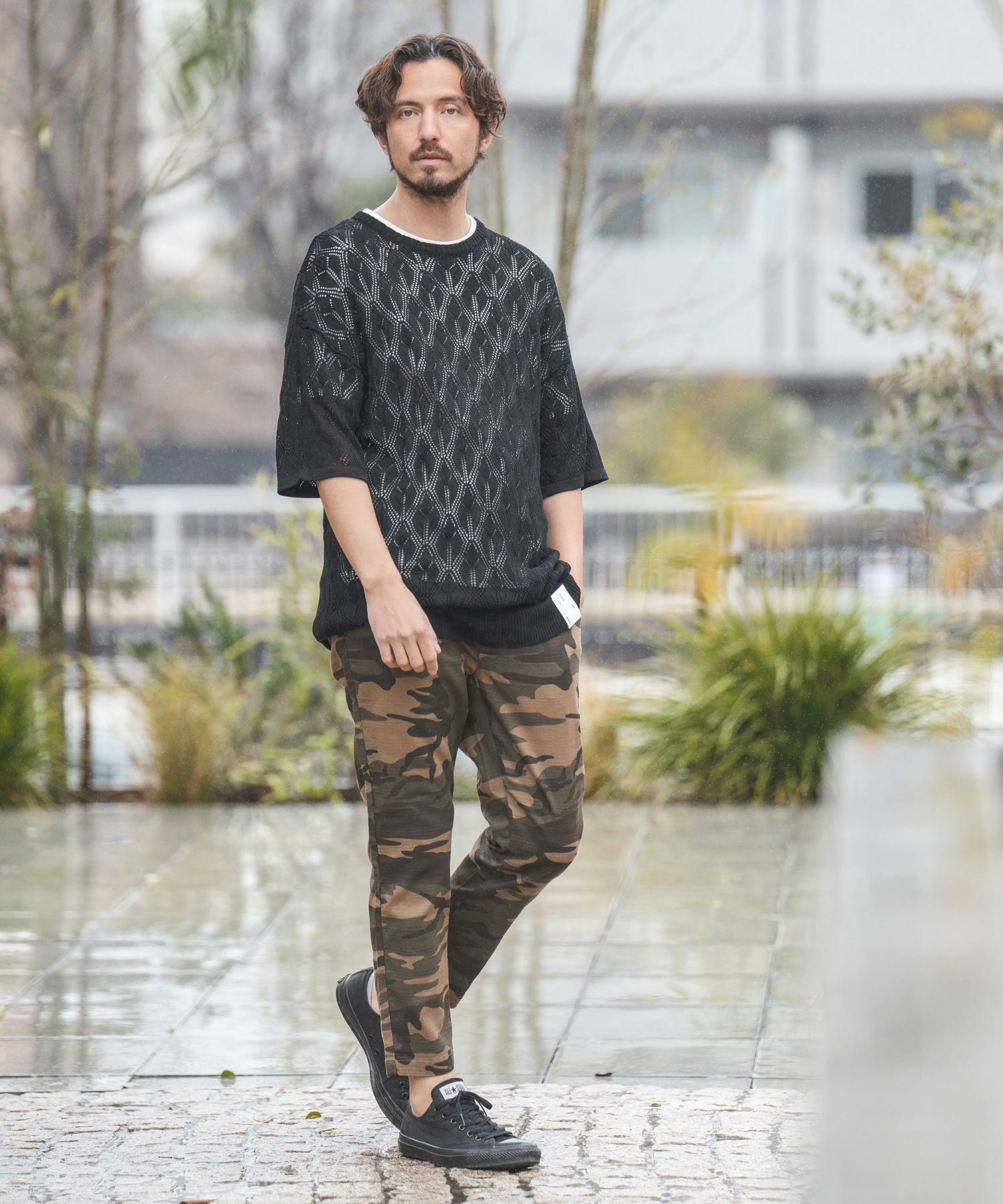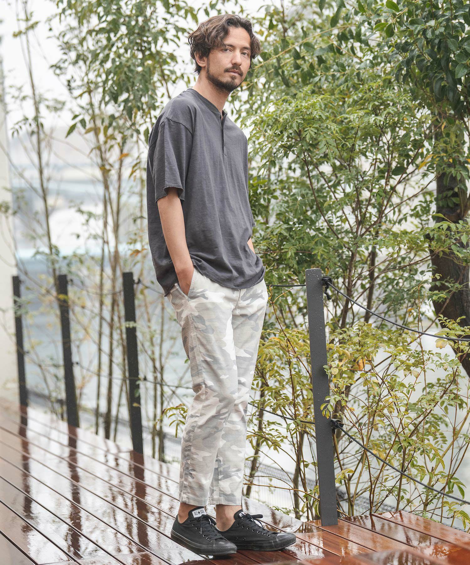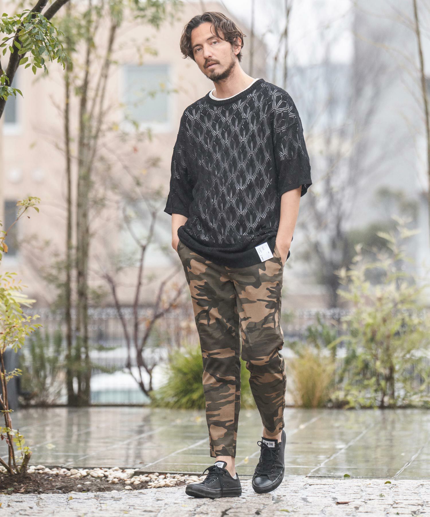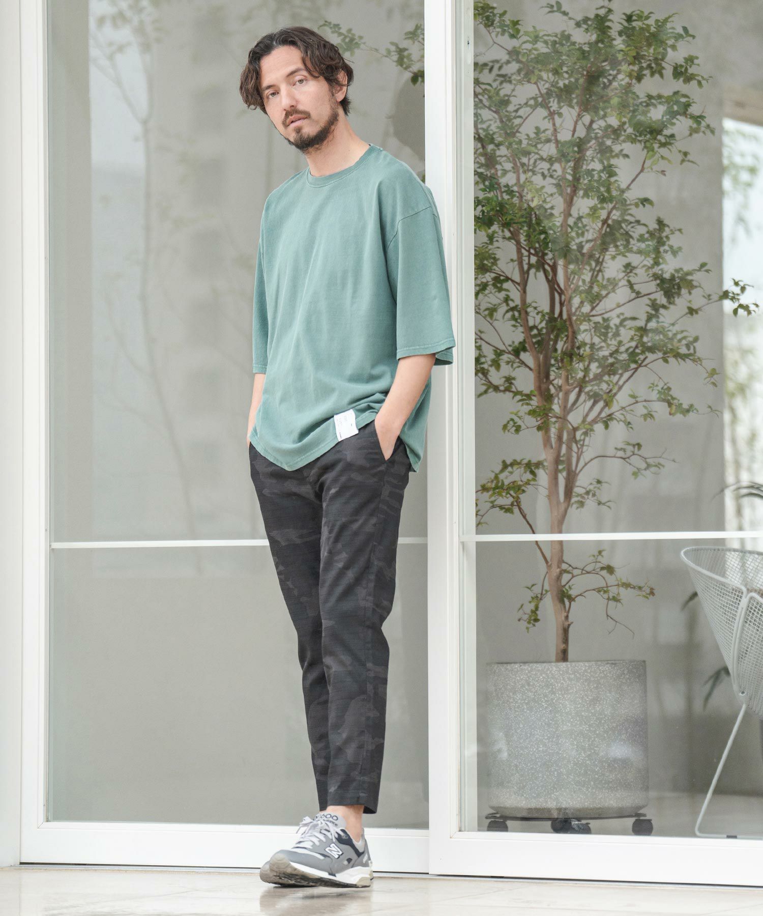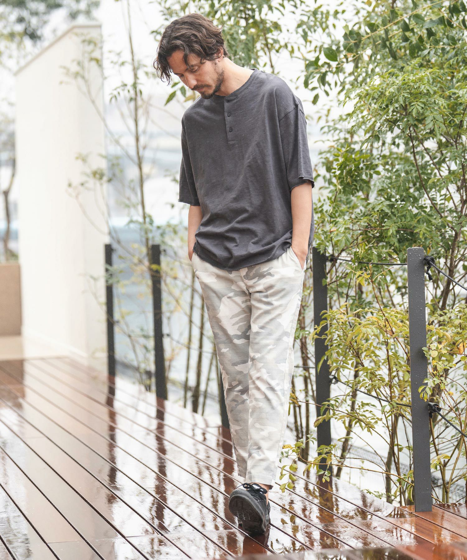 天然素材でザックリした生地感のバニランに迷彩柄をプリントした生地を使用したRELAX型アンクル丈パンツです。