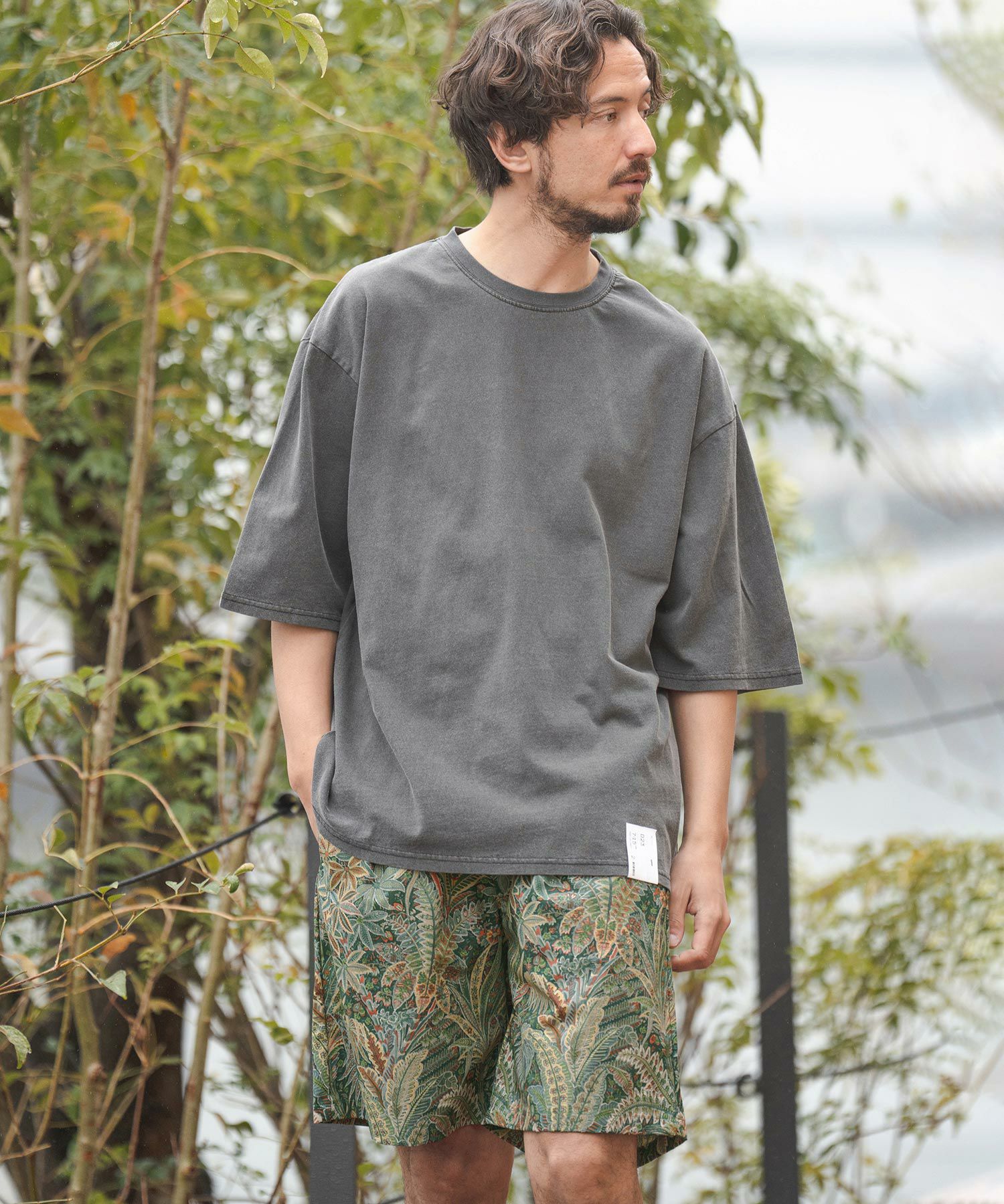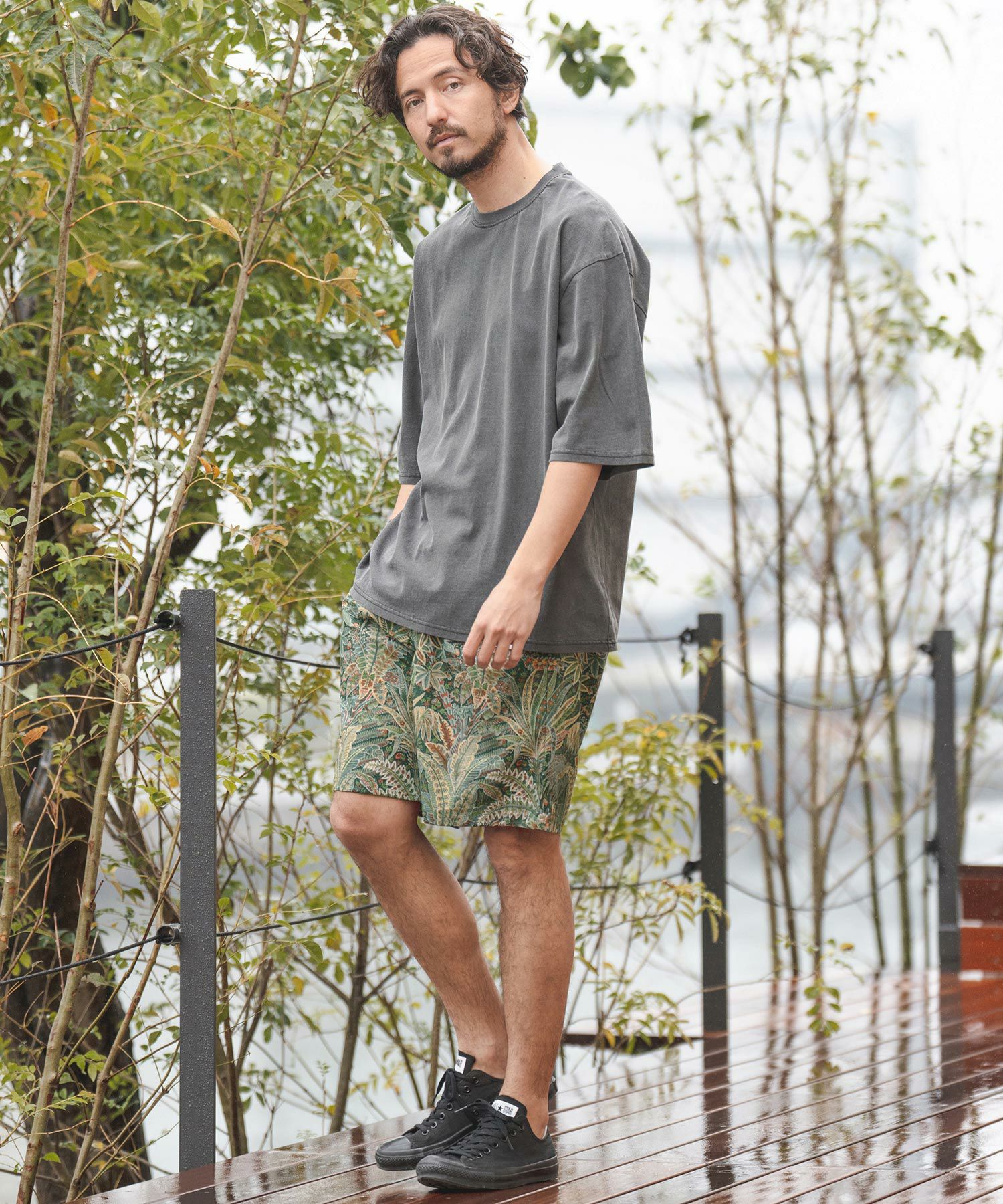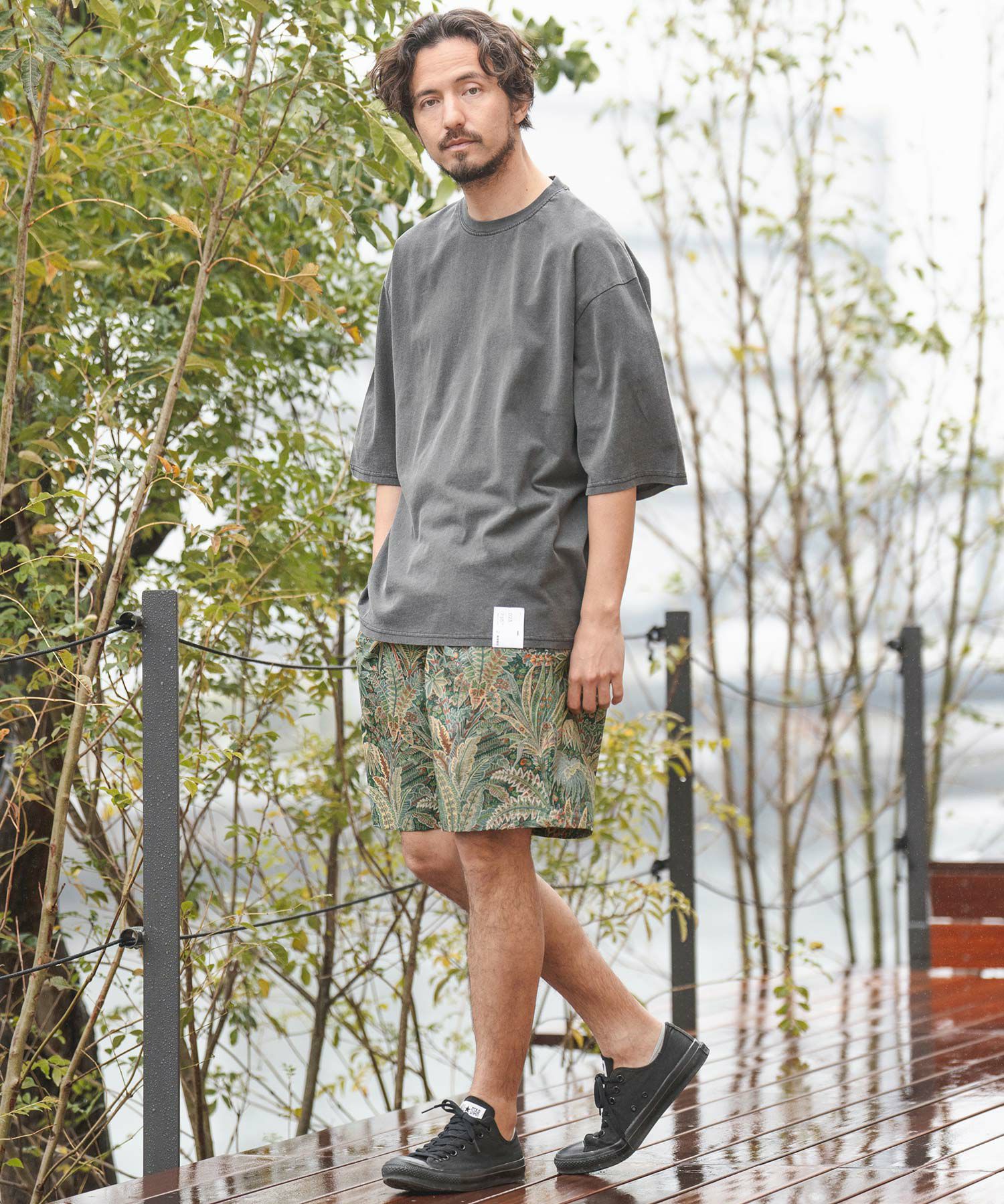 軽く丈夫なリップストップ地をベースにボタニカル柄を構成。