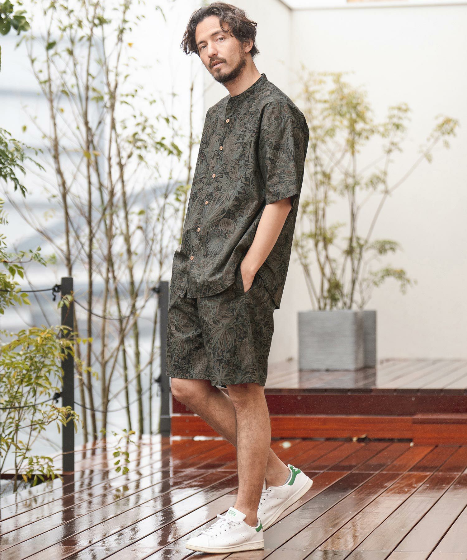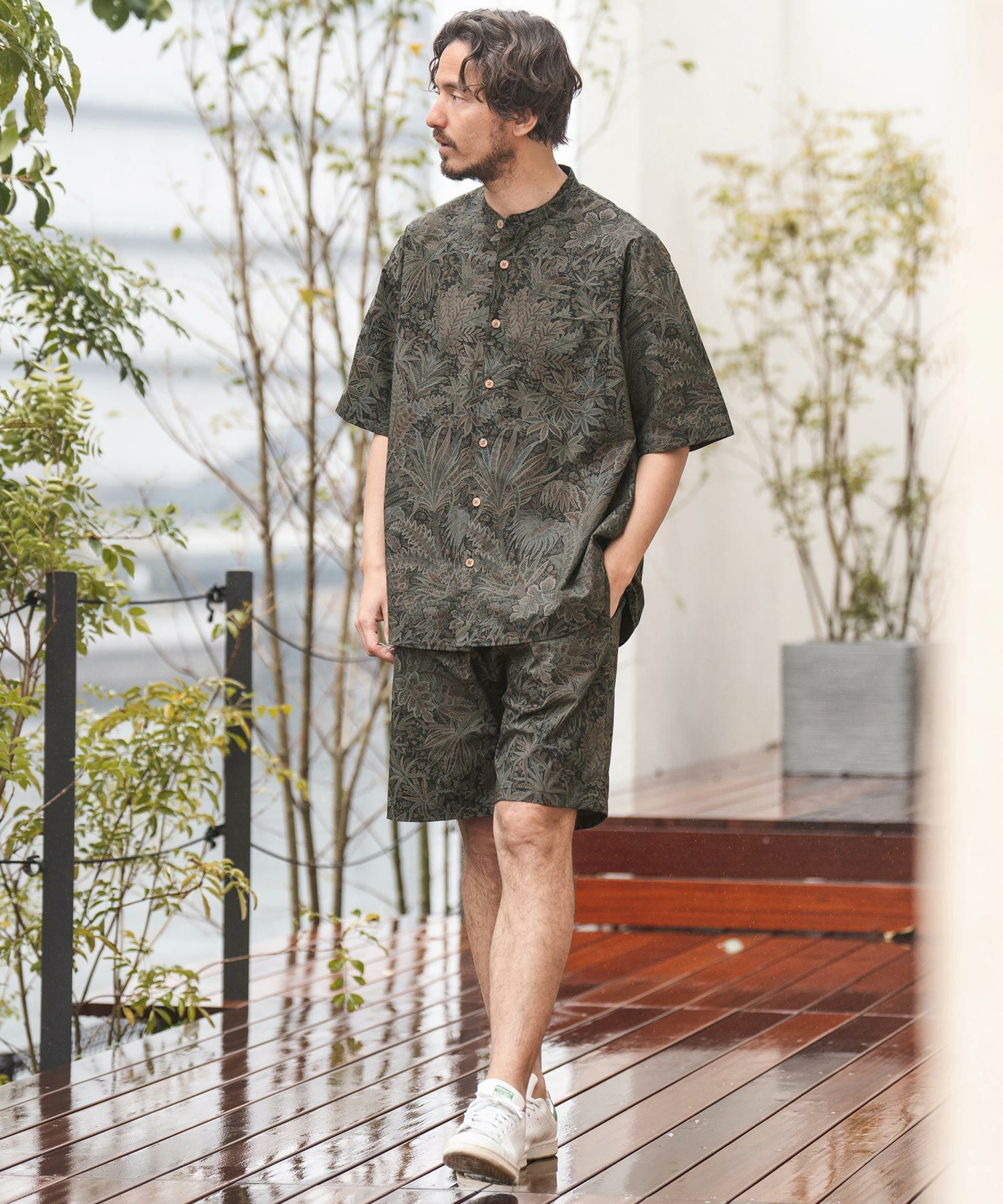 同素材のバンドカラーシャツの展開もあるので、セットアップ着用も可能。