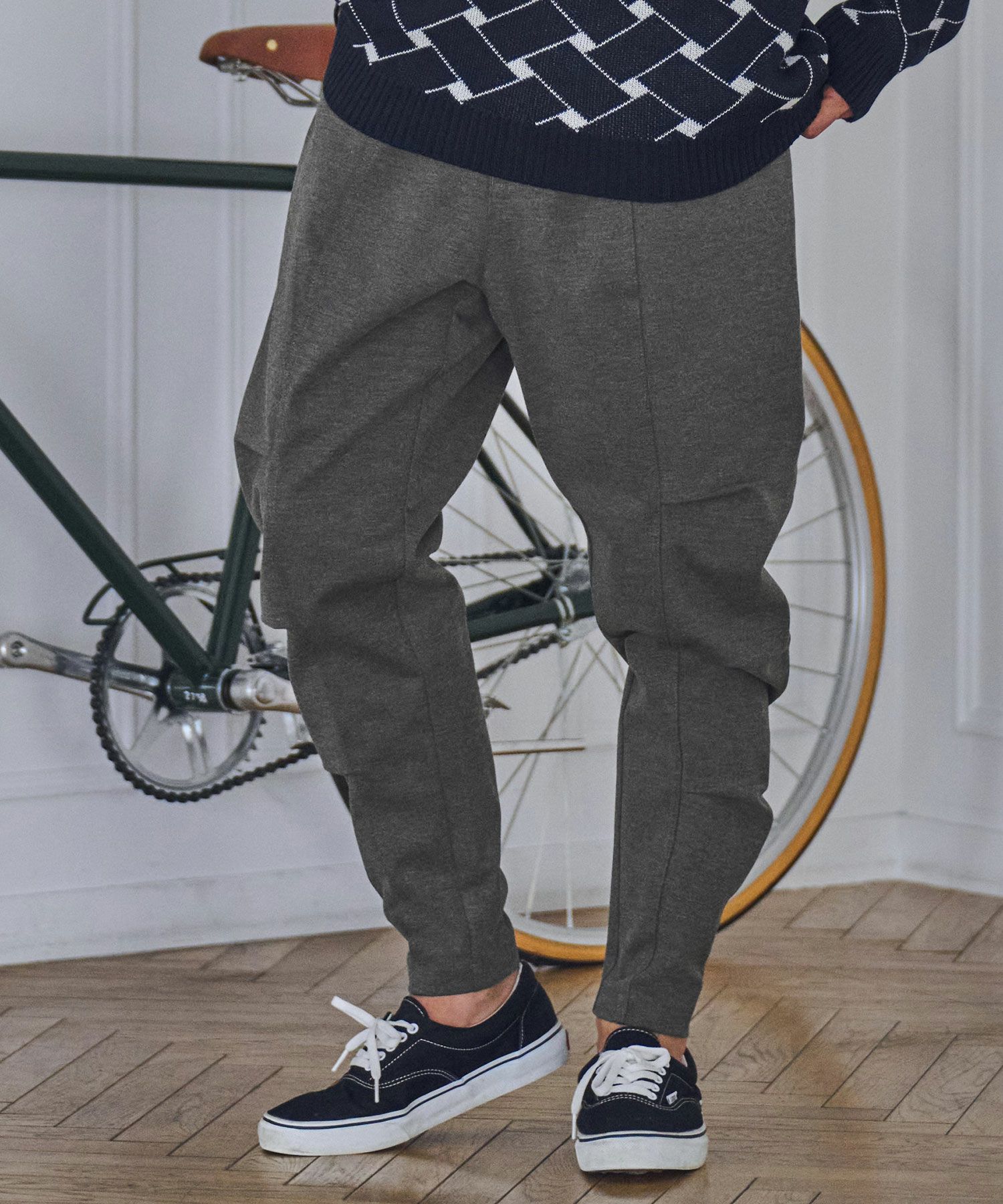 バナナのようなシルエットラインが特徴的なテーパードハイパーストレッチパンツ。