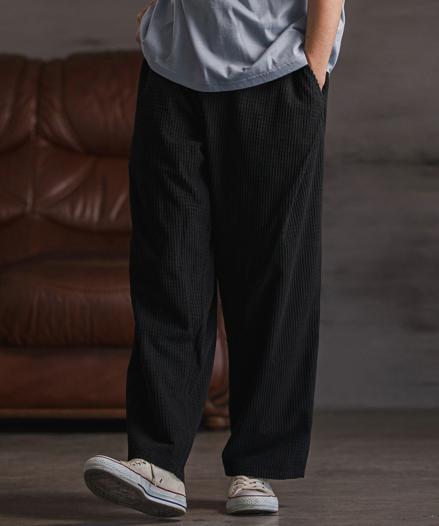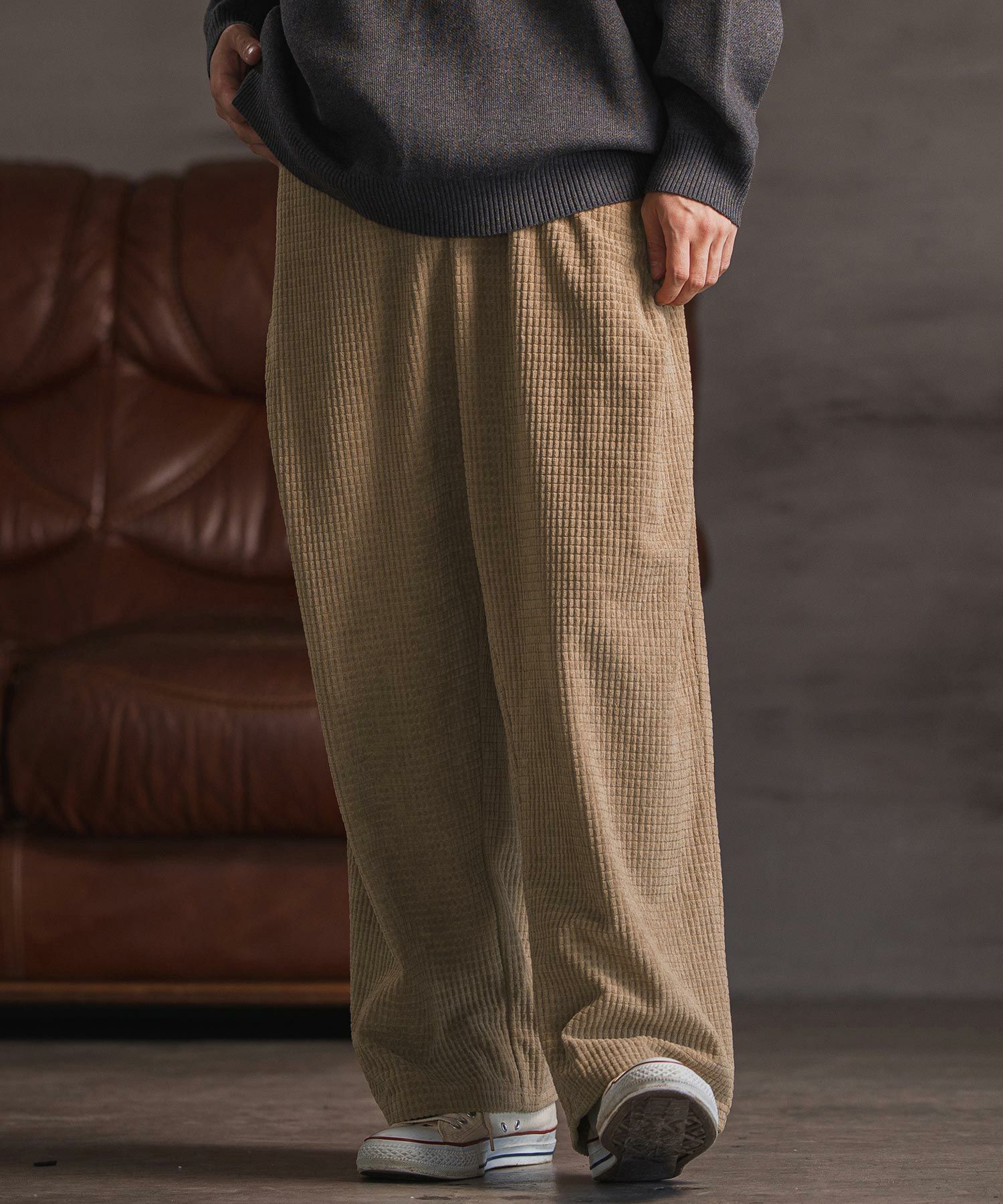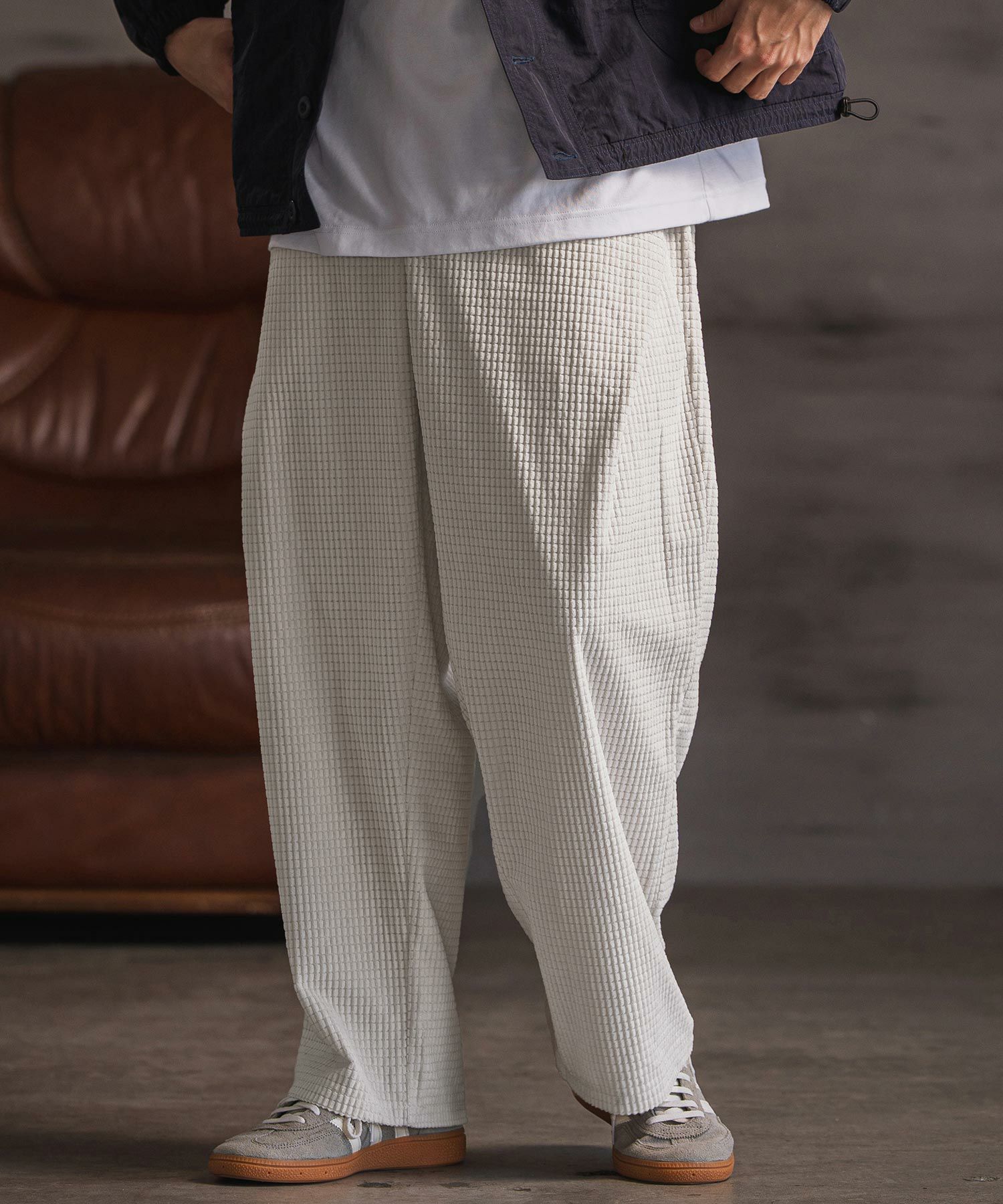 ワッフル織りコーデュロイ素材のワイドストレートパンツ。