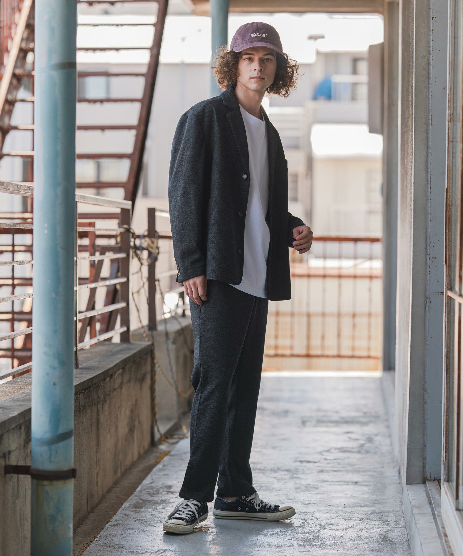 同素材のテーラードジャケットの展開もあるのでセットアップ着用も可能。
