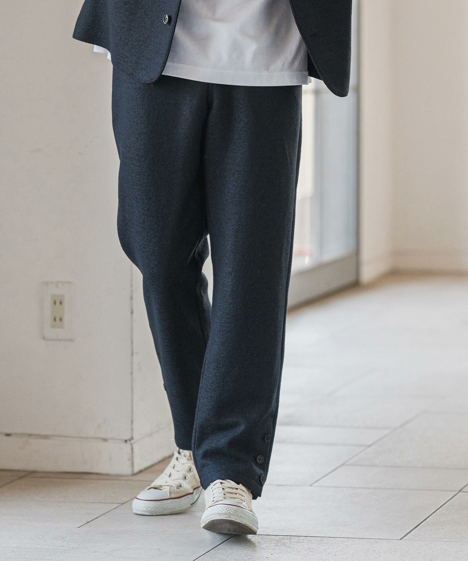 ウール混のメランジ感あるテーパードパンツ。