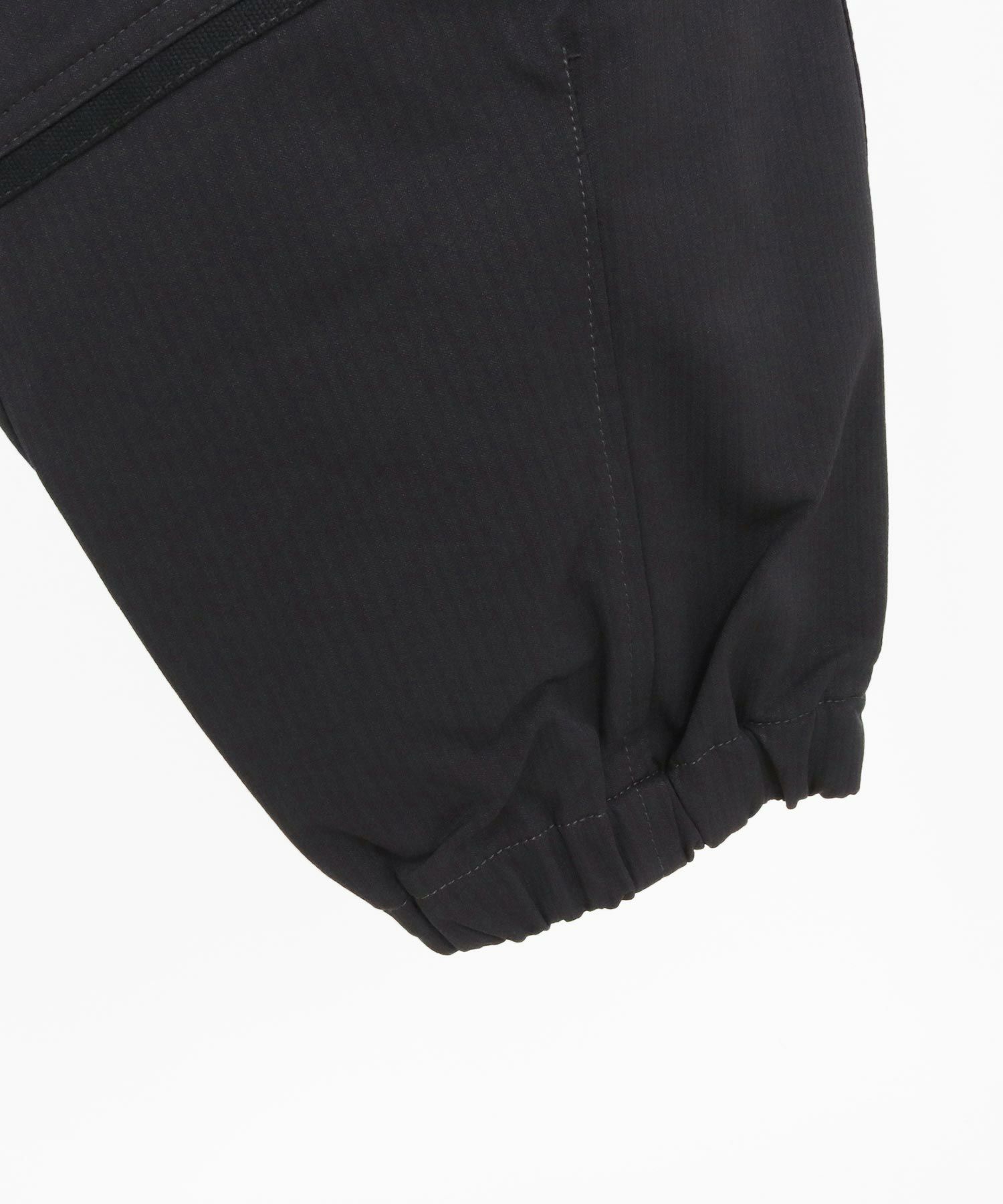 シャドーストライプのポリエステル素材のダブルニー風デザインリブパンツ。