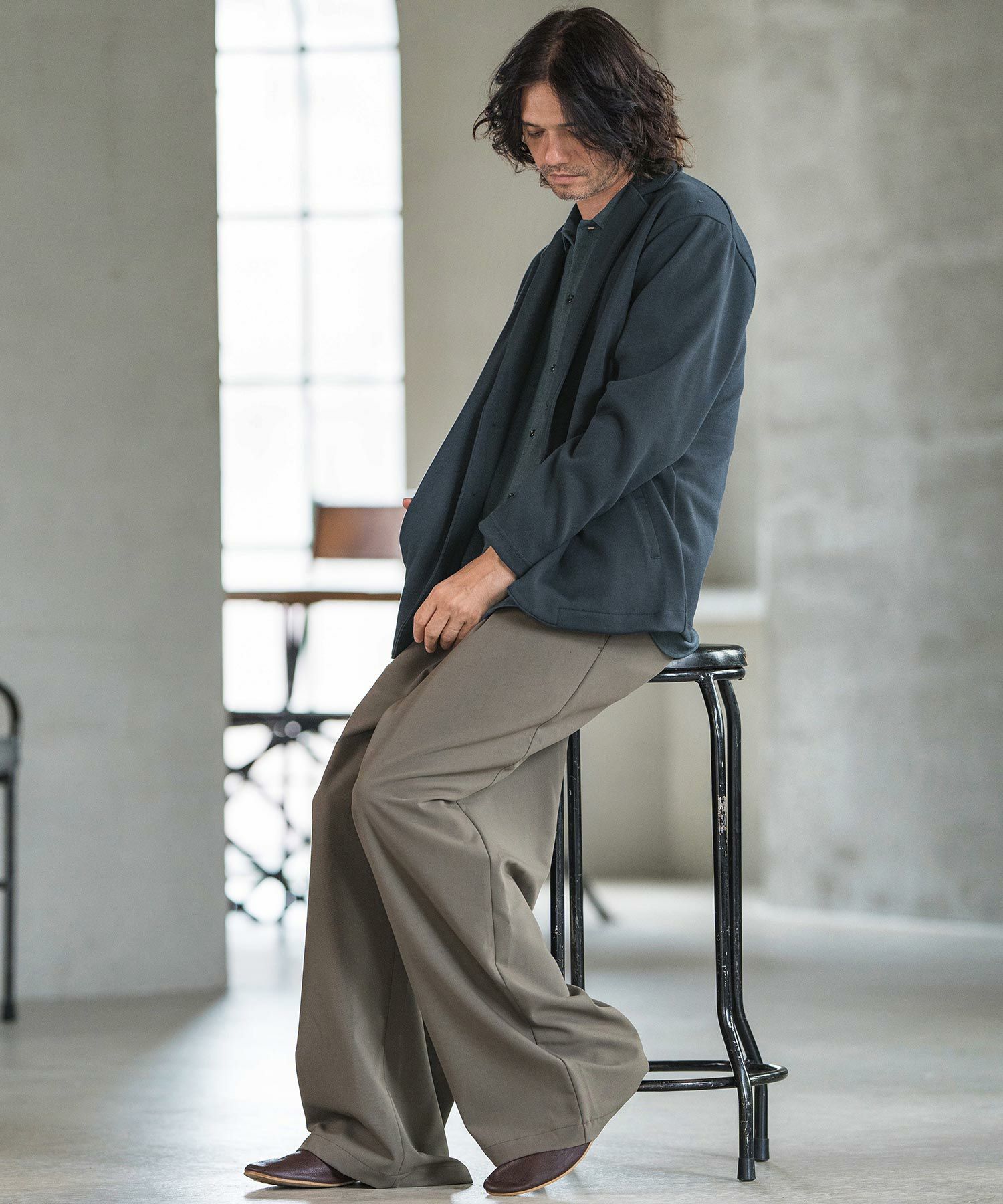同素材のワイドテーパードパンツの展開もあるので、セットアップ着用も可能。