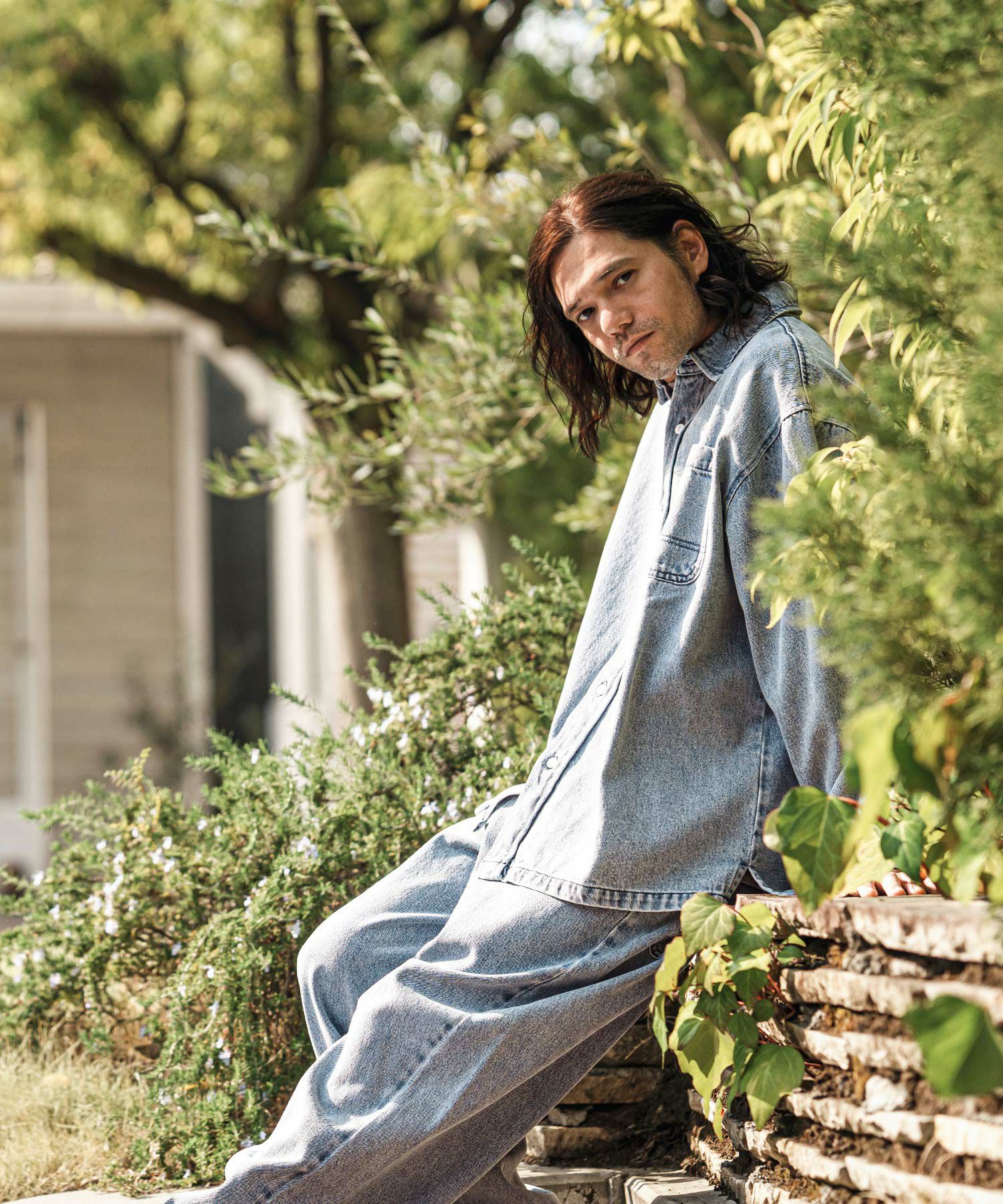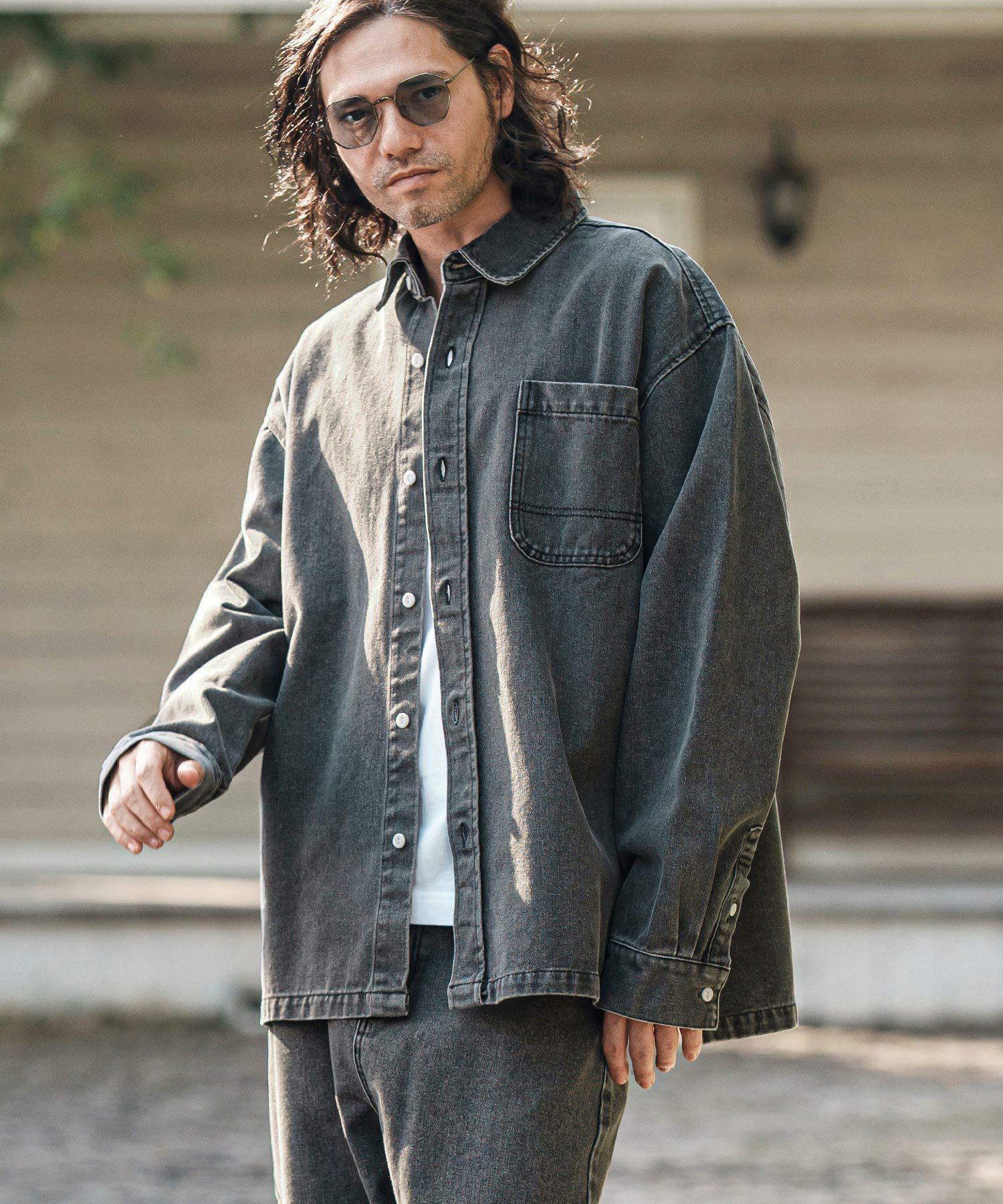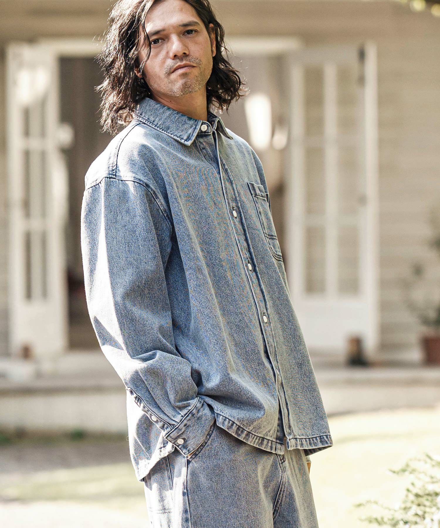 ブリーチ加工を施した10オンスデニムを使用したビッグシルエットシャツ。