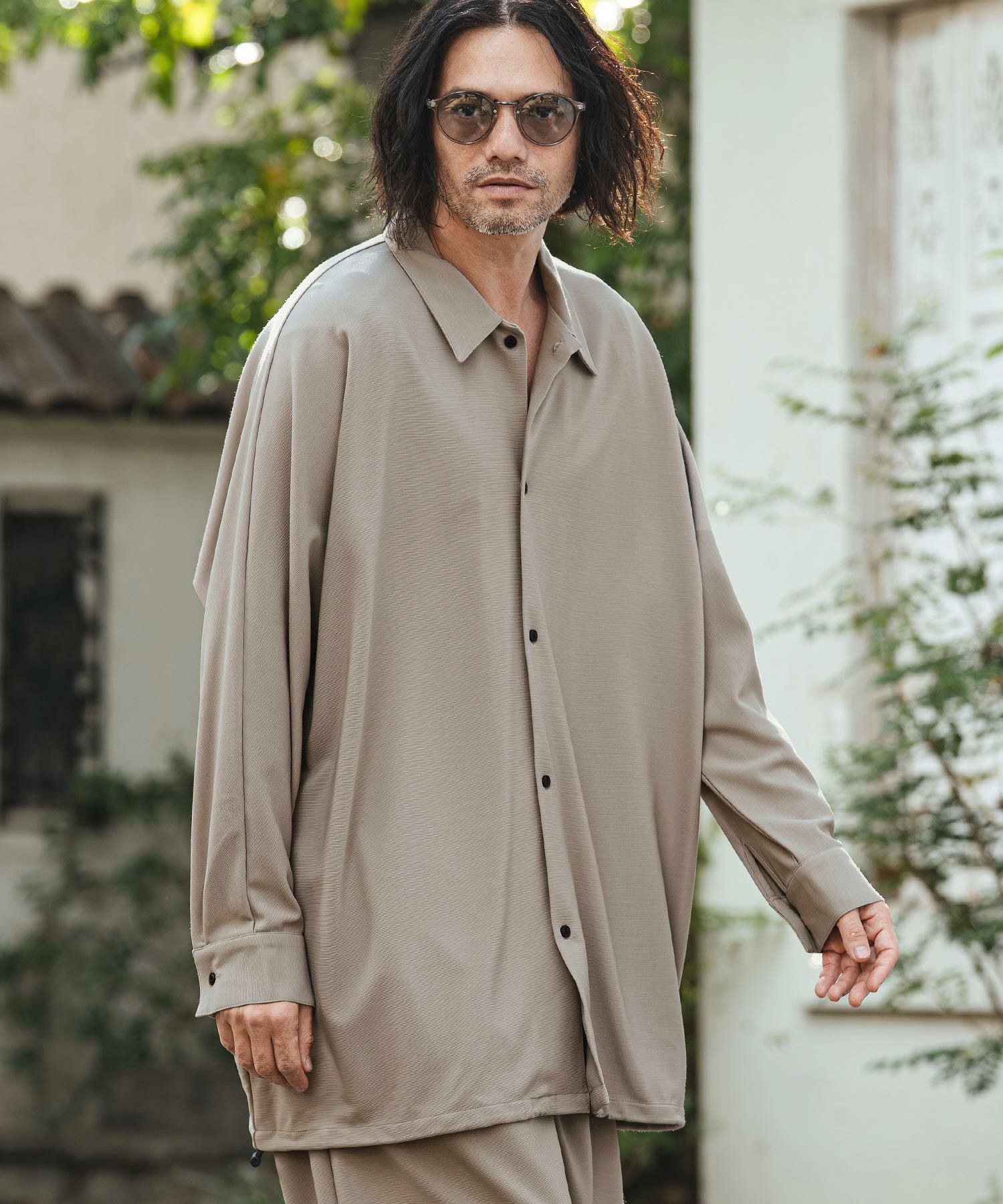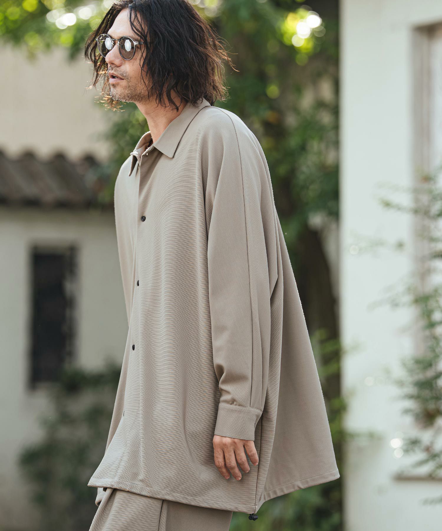 アームホールのないドルマンスリーブを採用した、ゆったりとしたシルエットで、肩のラインを落とした設計と素材の柔らかさが、コクーン調のフォルムと自然なドレープを生み出します。