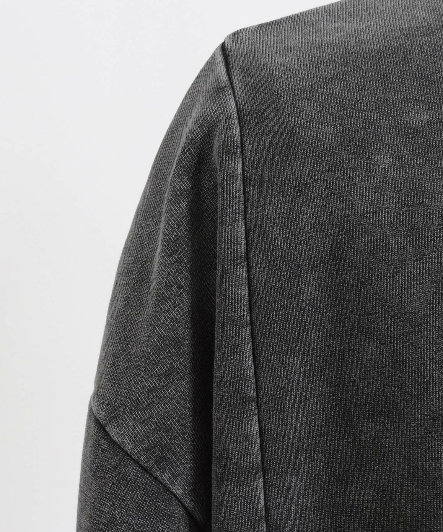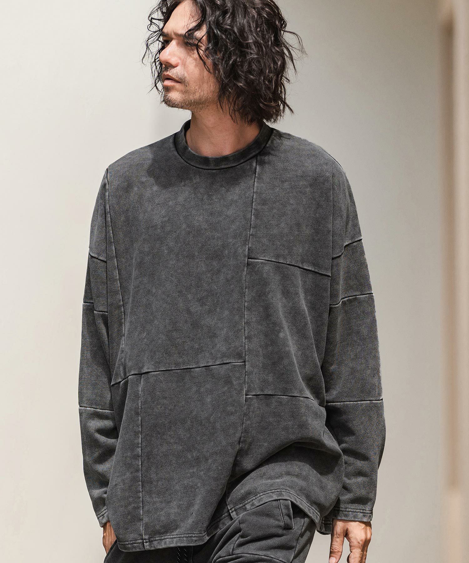 カットデニム生地を切り替えデザインした裏毛CNスウェット。