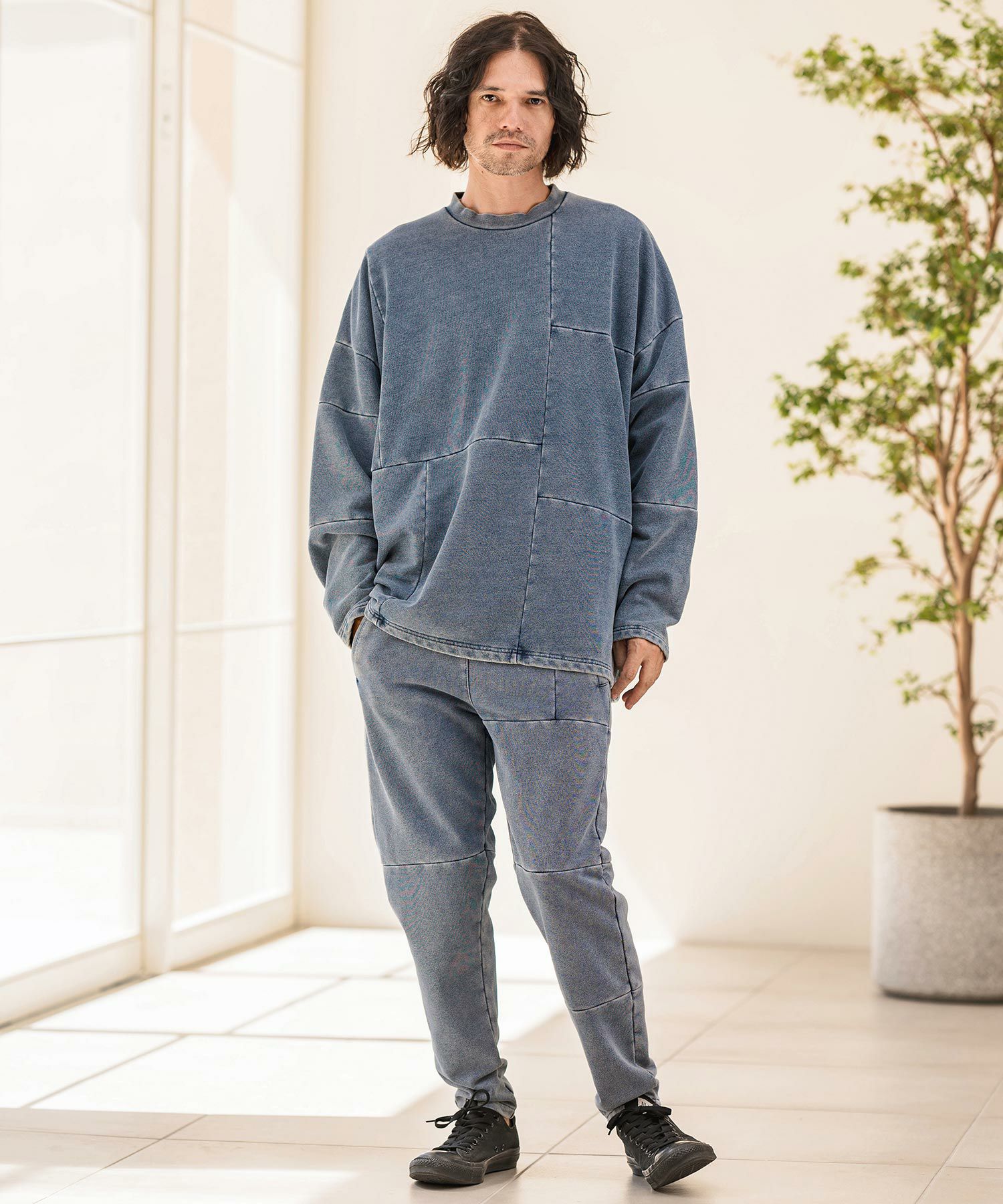 同素材を使用したスウェットパンツの展開もあるので、セットアップアイテムとして着用も可能。
