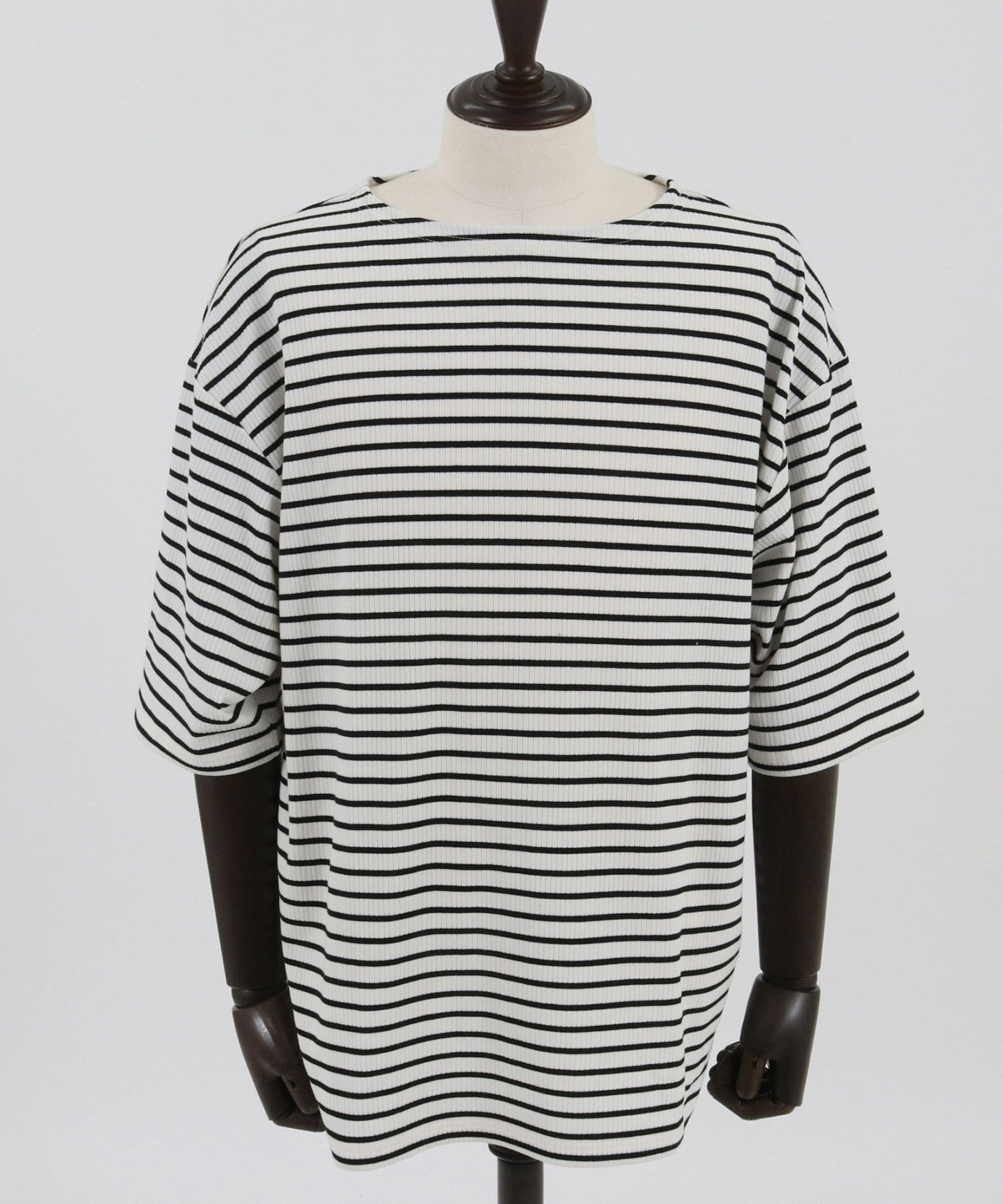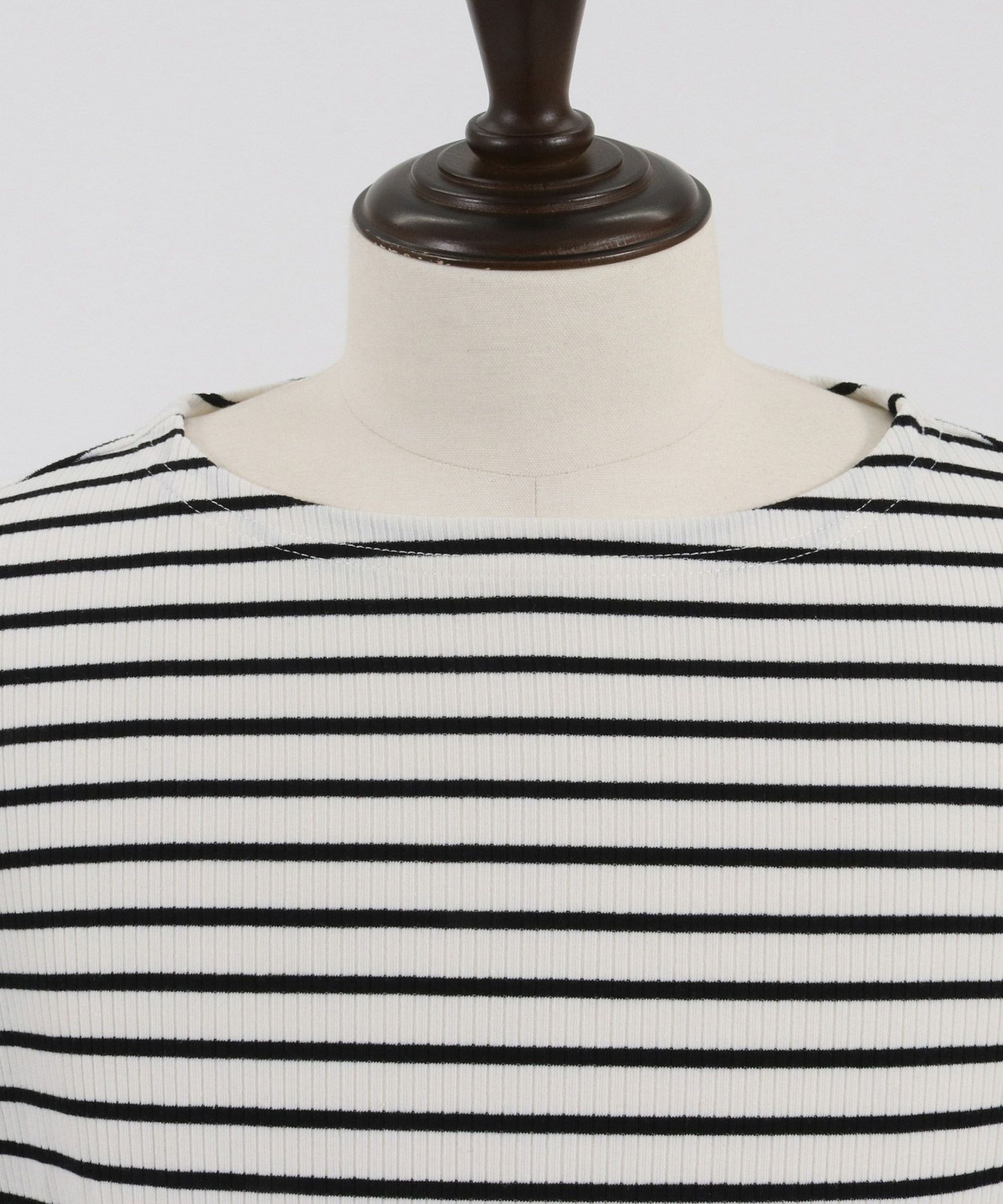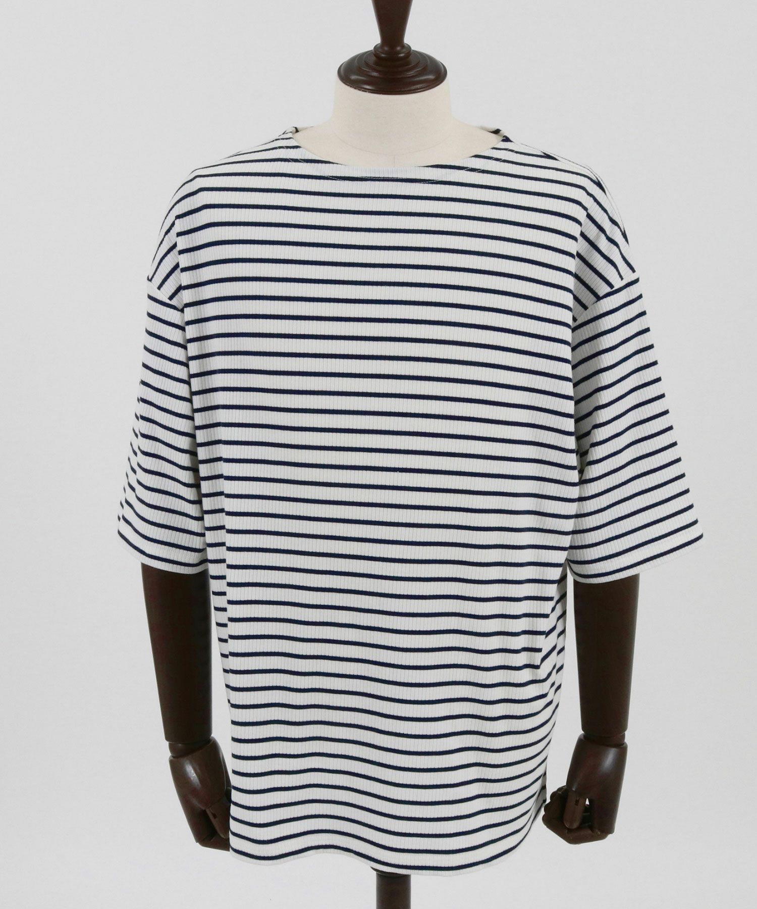 ゆったりと首元のあいたボートネックテレコリブボーダーTシャツ。