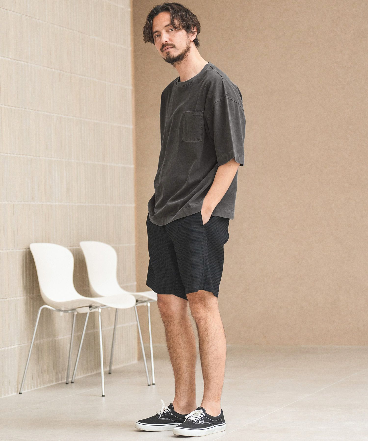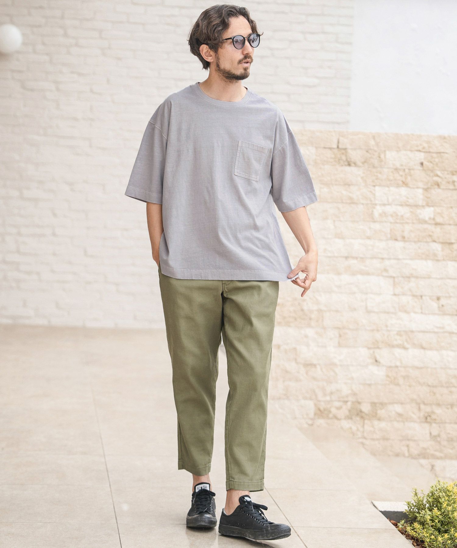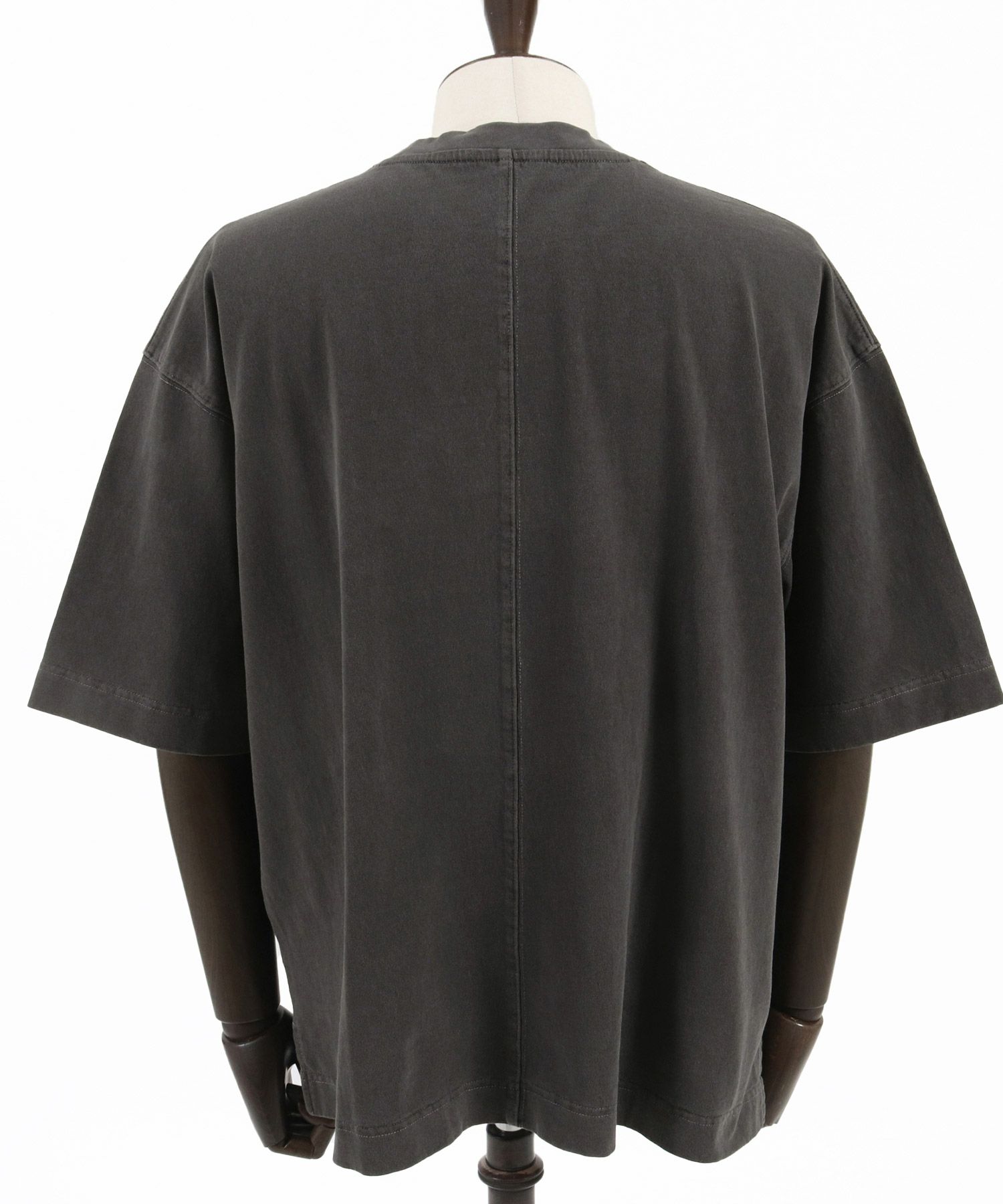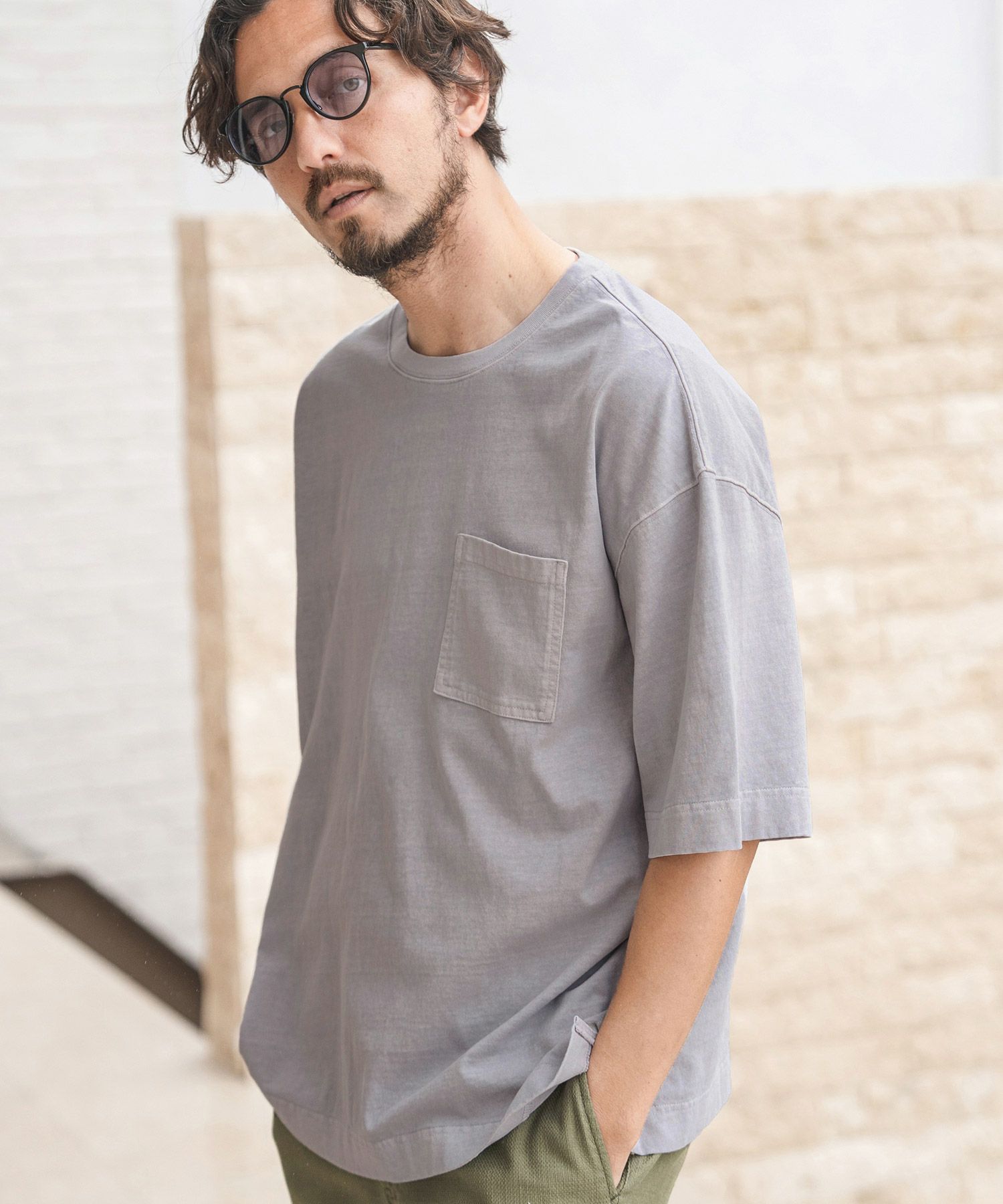 ピグメント加工を施したポケ付きTシャツ。