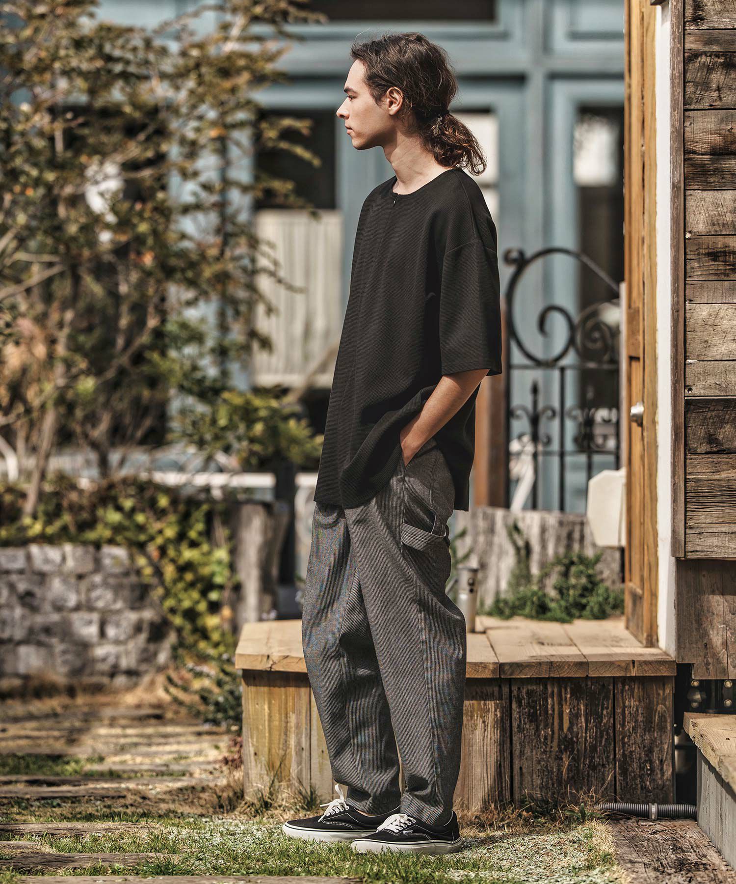 緩めな身幅や肩幅に対して、着丈は腰丈辺り、ボクシーなフォルムに見えるイメージに設定しています。