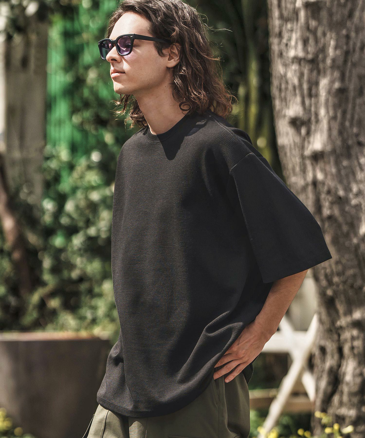 凸凹編み目のテクスチャが特徴的なワッフルカットソーを使用しています。