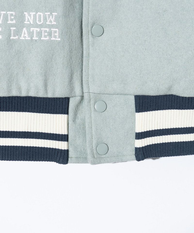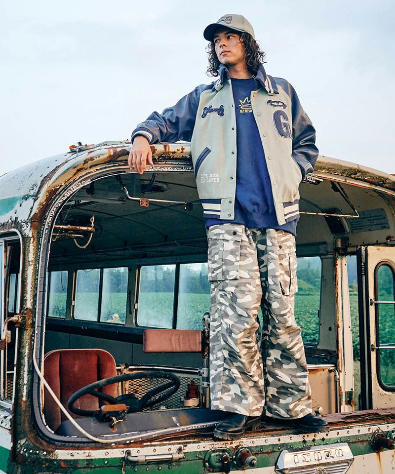 ノスタルジックなアメリカンスポーツウェアの佇まいにブランドのグラフィックワークをかけ合わせたGB Letterman Jacket。