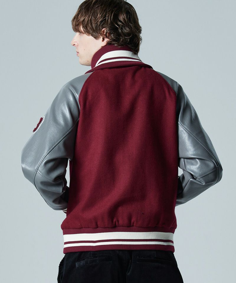 ラグランシルエットとなるボディには中厚手のメルトン、タフなシボ感を備えたシンセティックレザーをコンビネーション使い。
