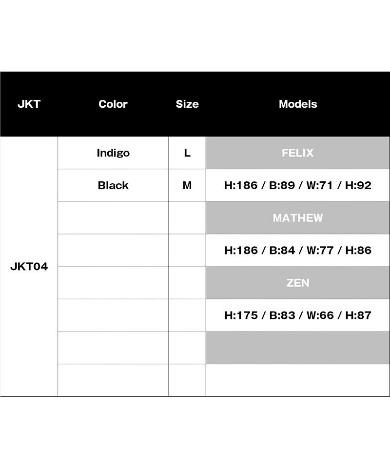 サイズ/着丈(Length)/身幅(Chest)/肩幅(Shoulder)/袖丈(Sleeves) /
