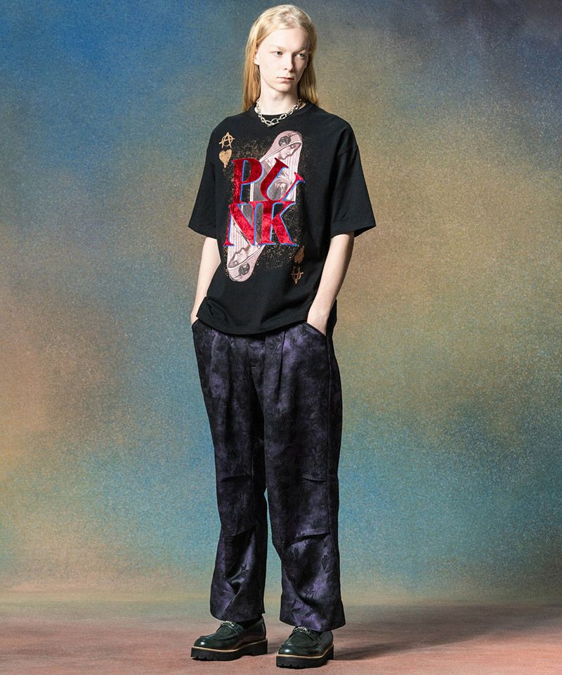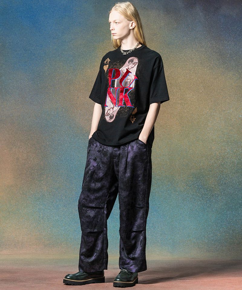 そこにラバーインクとベロアボンディングの2層であしらった“PUNK-ロゴ、金泥インクを用いたモチーフ柄をあしらって、柄使いとプリント技法の両面で重厚なビジュアルを生み出しました。