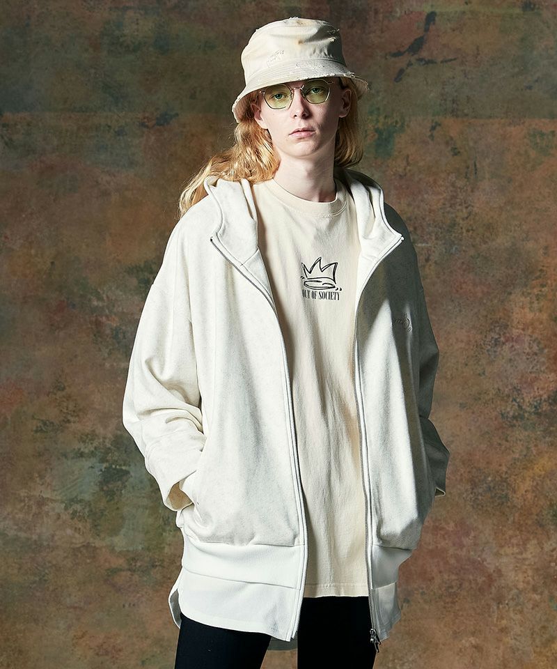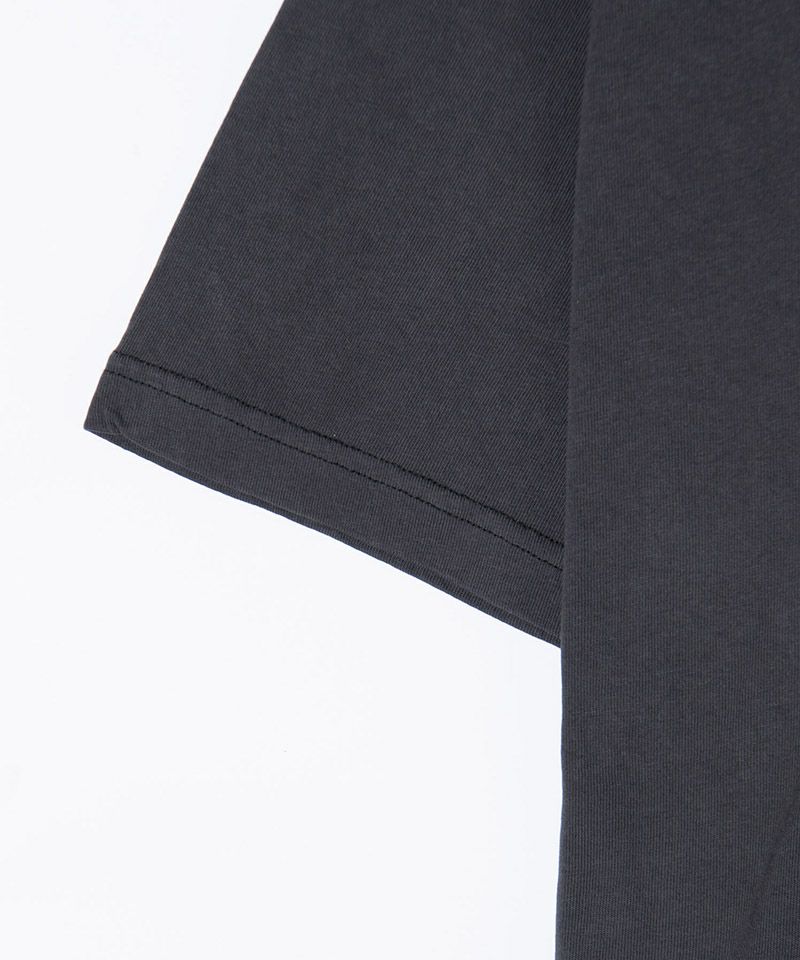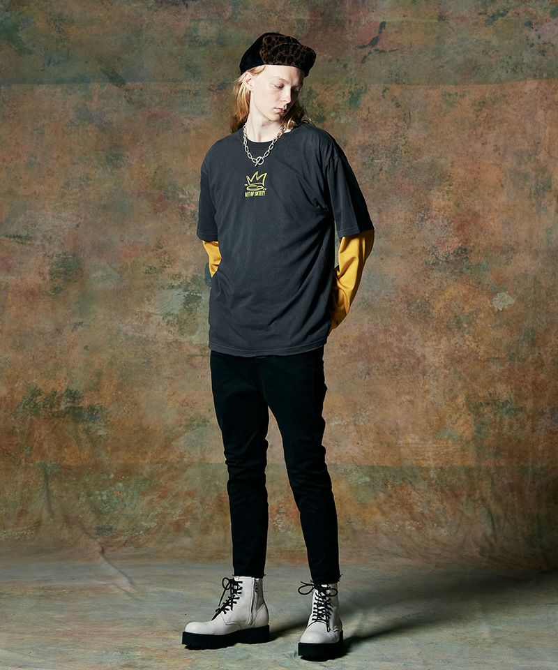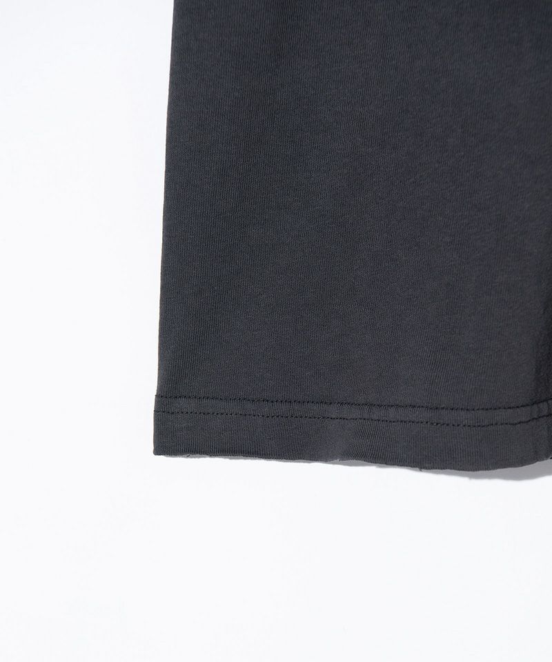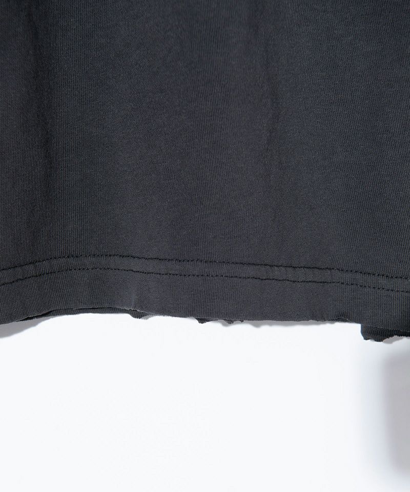 ピグメント染めによるムラ感あるボディは裾をカットオフすることでグランジライクな佇まいに仕上げています。