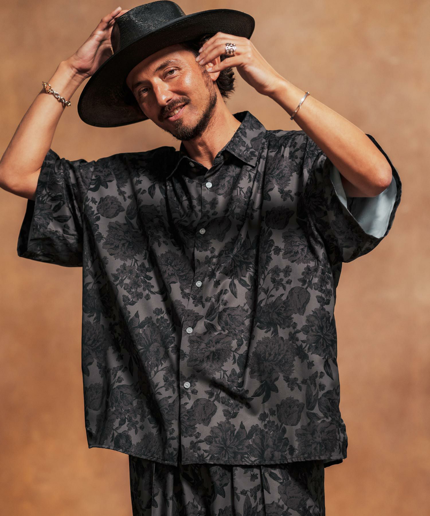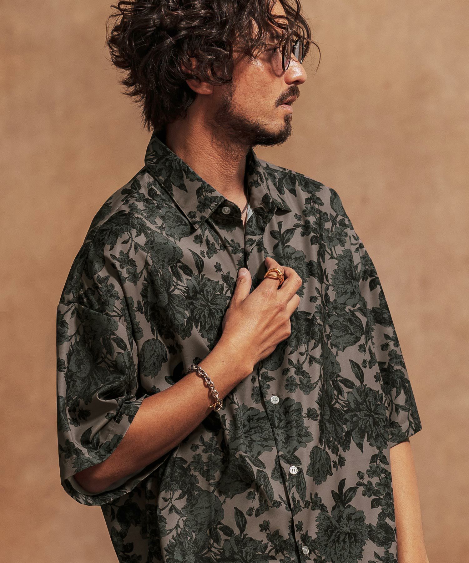 ダークトーンのフラワー柄プリントの総柄シャツ。