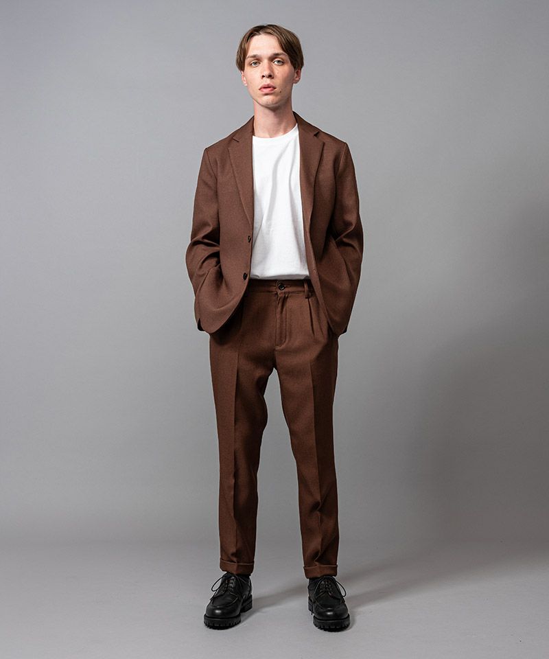 同素材で数種類のスラックスを製作しており、スタイルに変化を出せるセットアップになります。