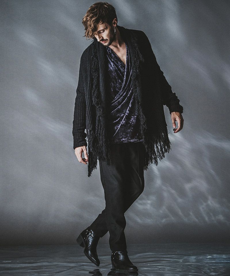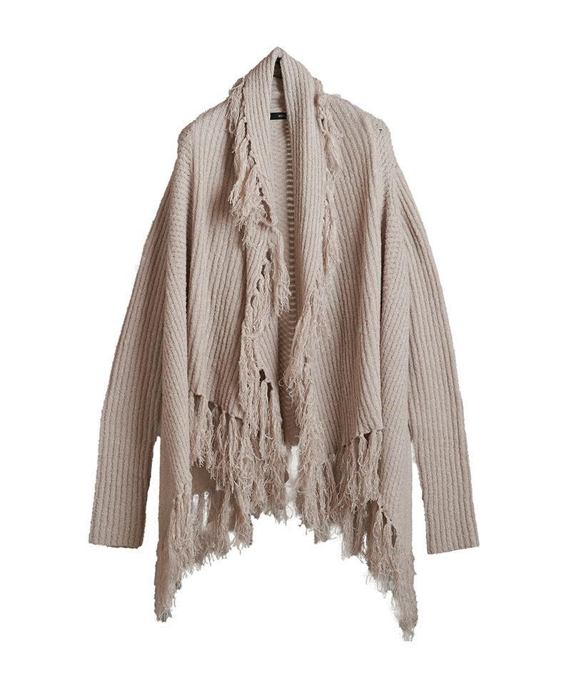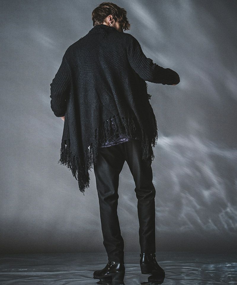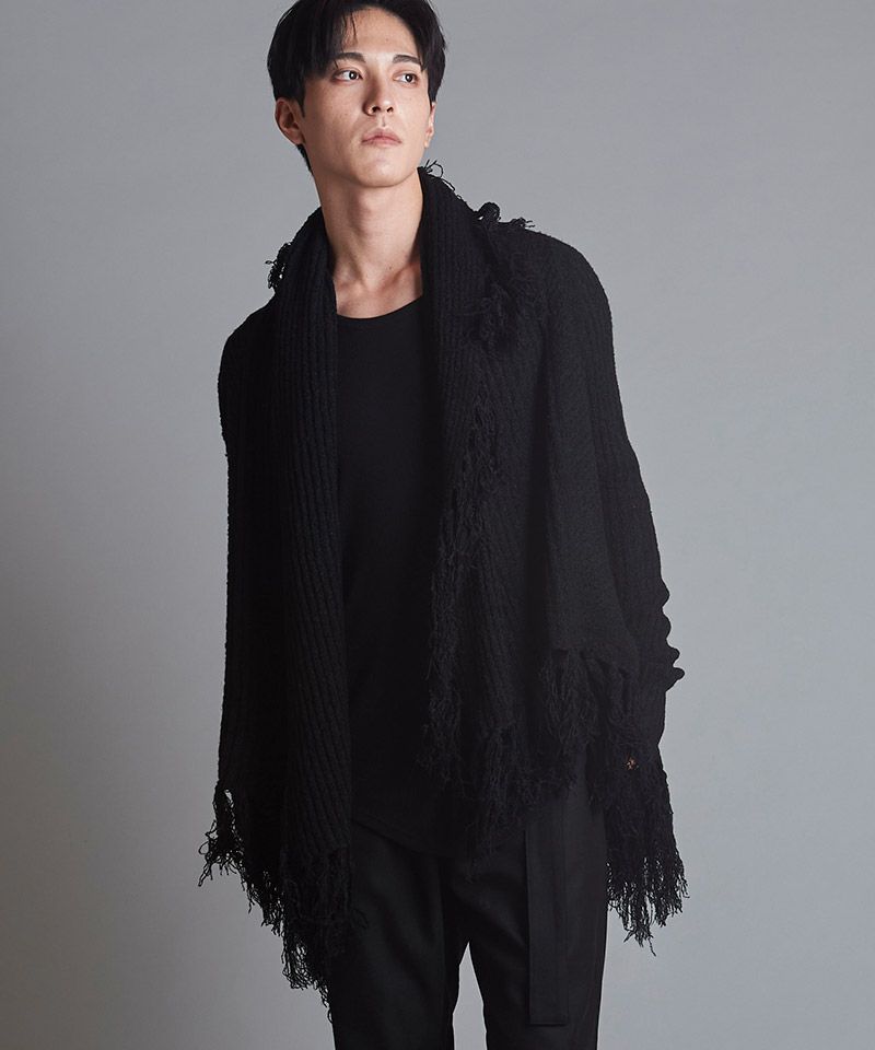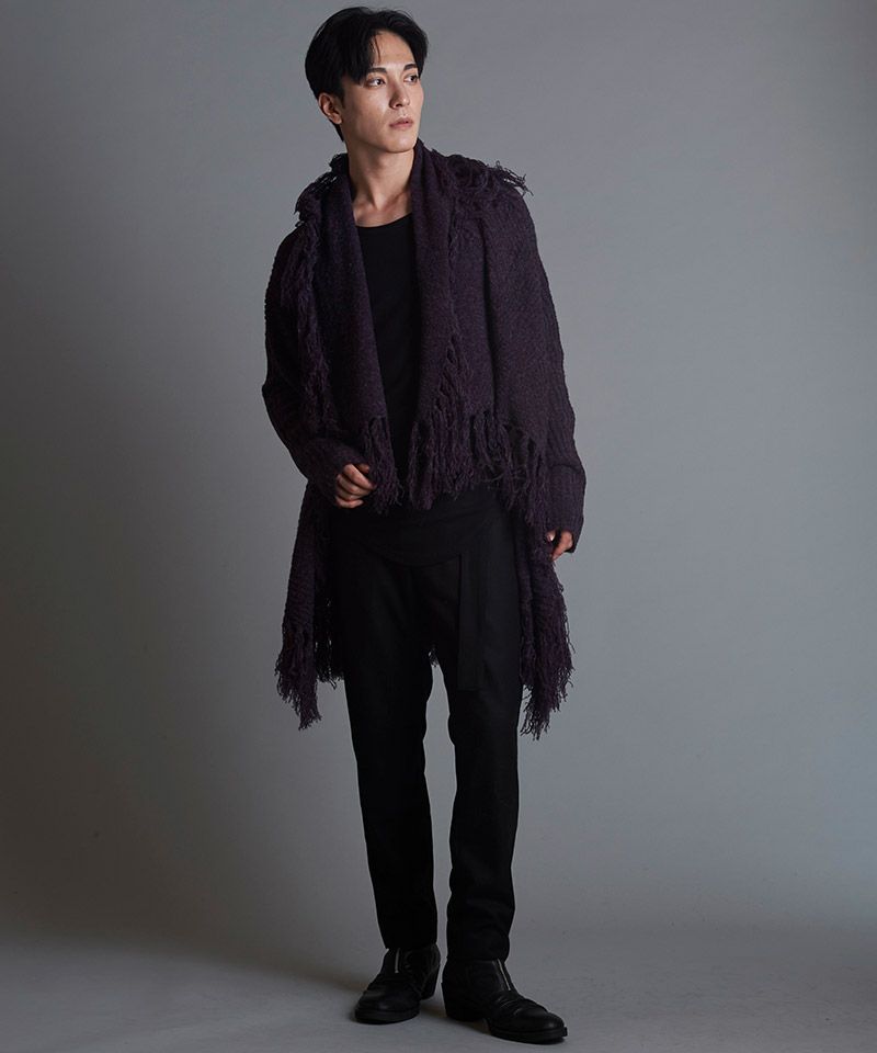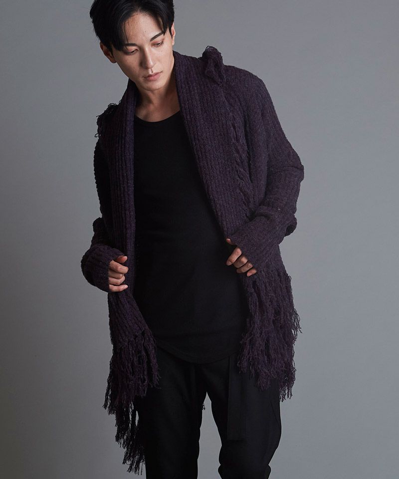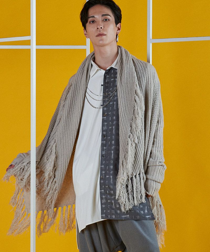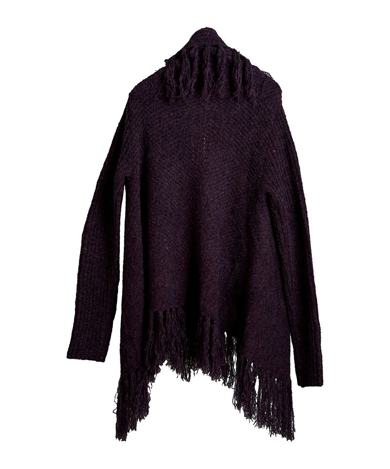 マフラーに多く見られるフリンジをガウンに落とし込み動きのあるデザインニットに仕上げた本作。