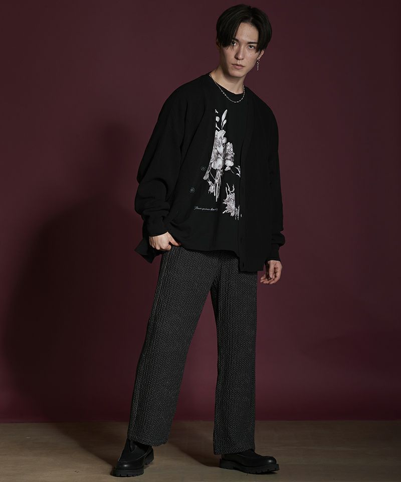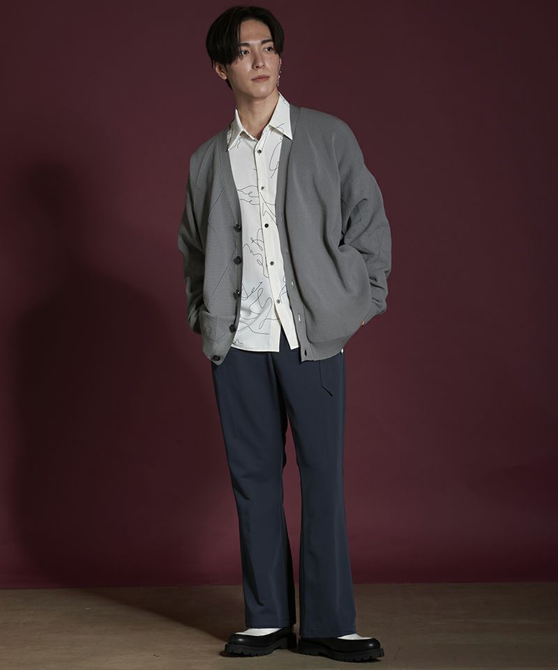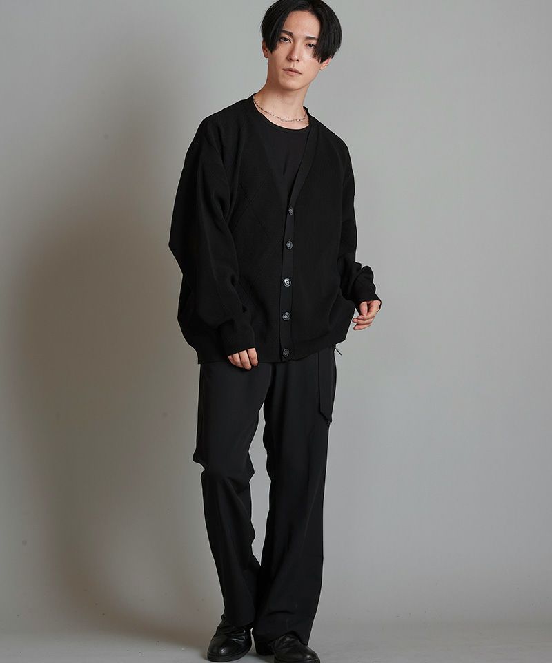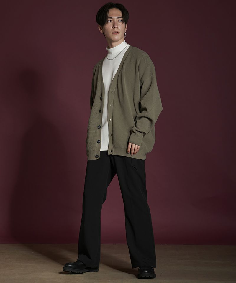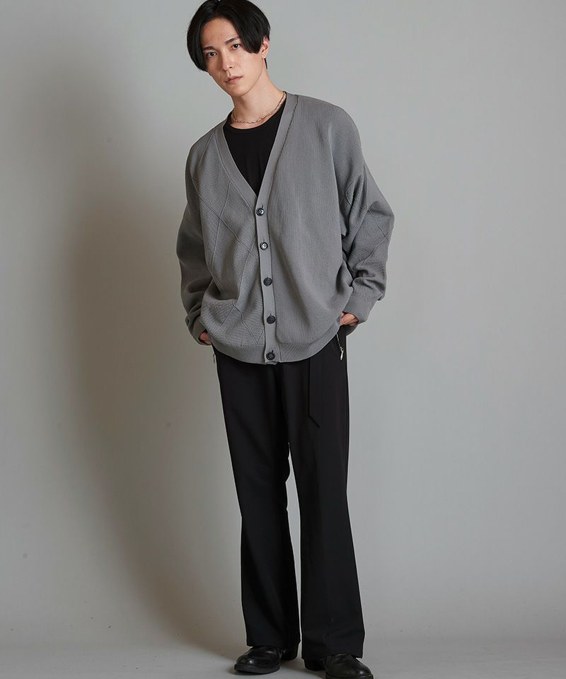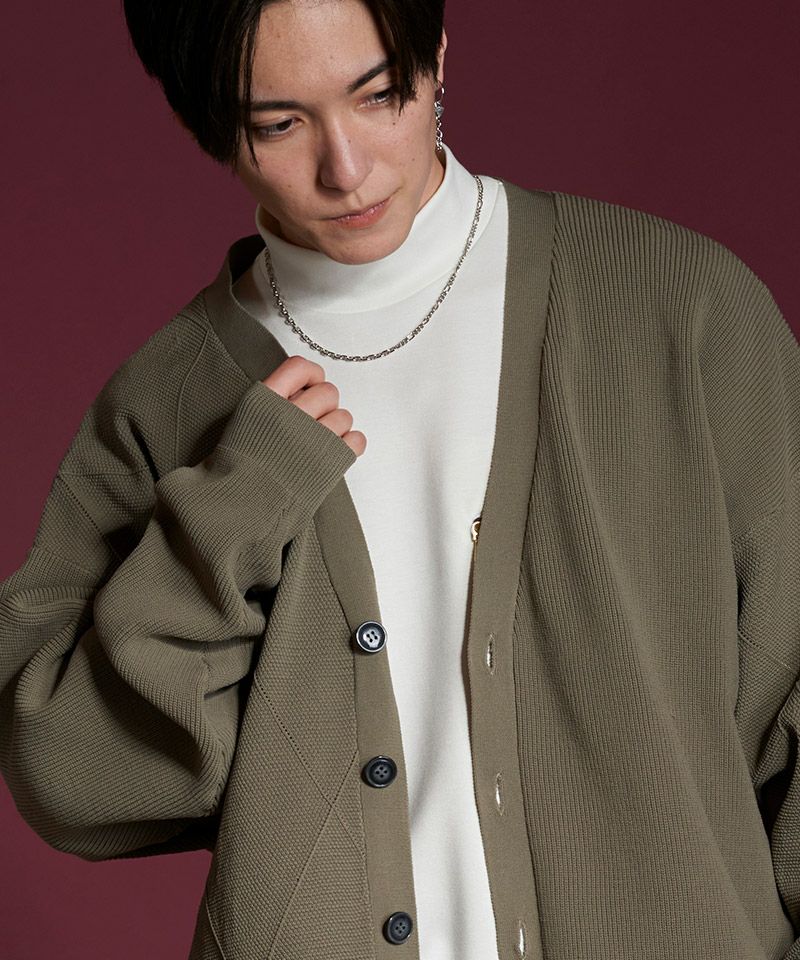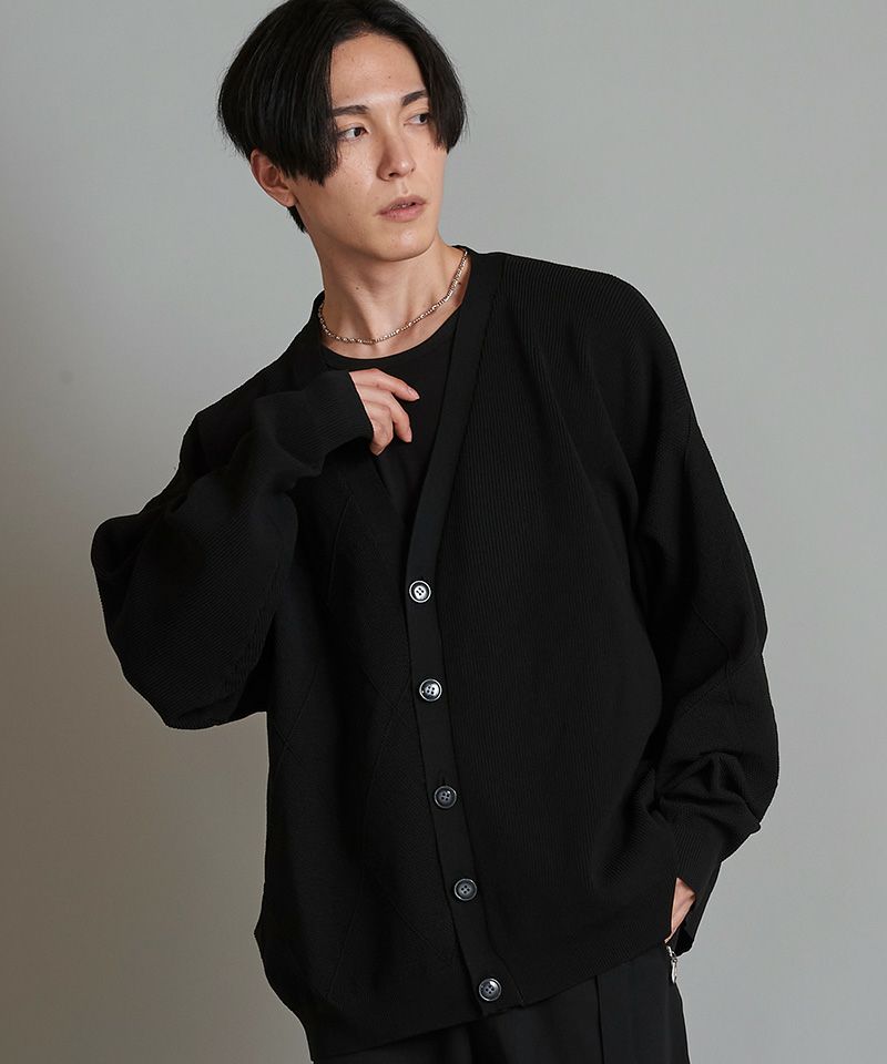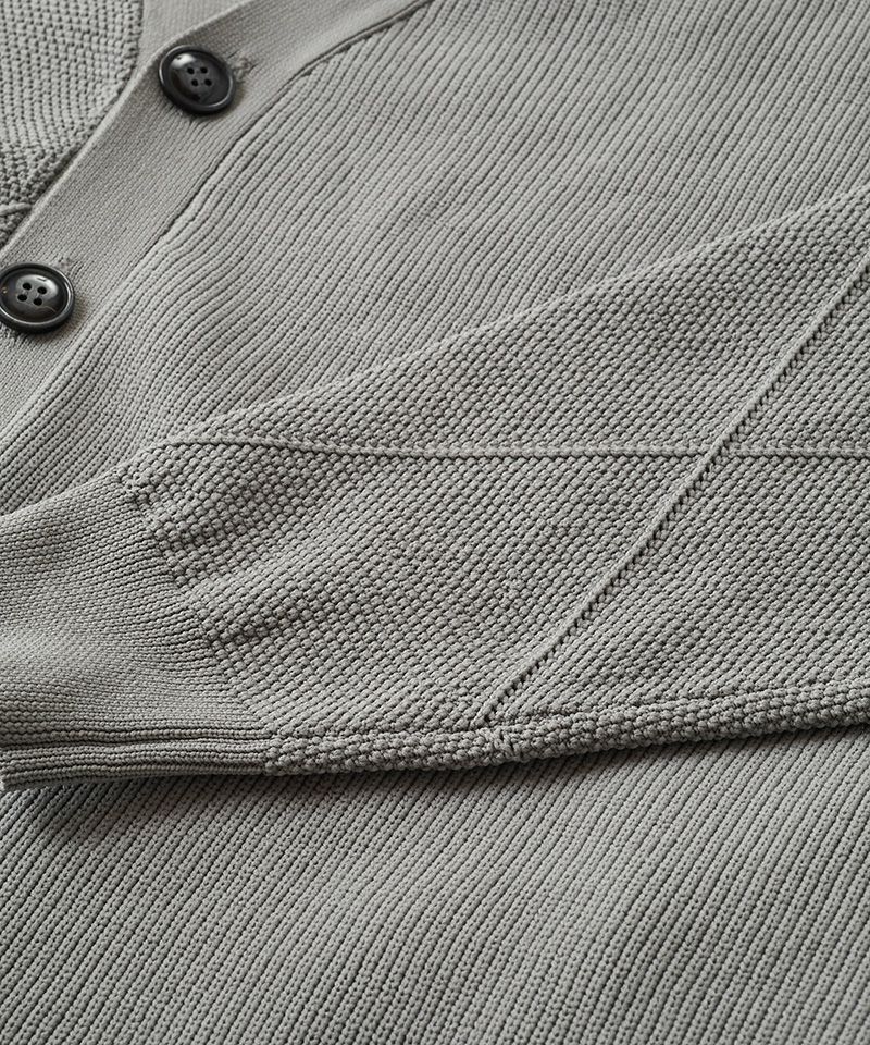 左右身頃、両袖の編み地を入れ替え、異なる編み地を交互に切替える事で、単調になりがちな無地のカーディガンを表情豊かな一着に昇華した本作。