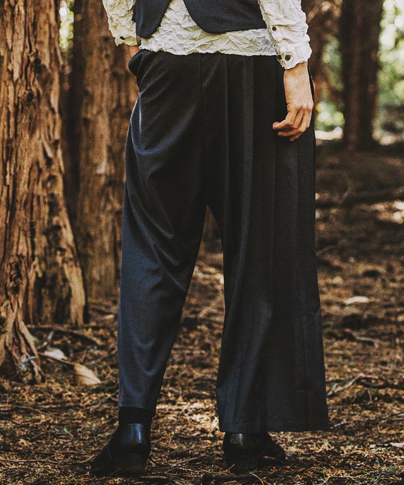 バギーシルエットをベースに片側にはプリーツを施し立体感を表現している。