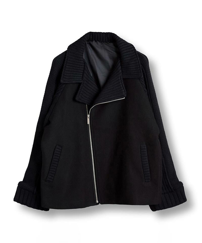 布帛とニットを組み合わせた異素材コンビのライダースジャケット。
