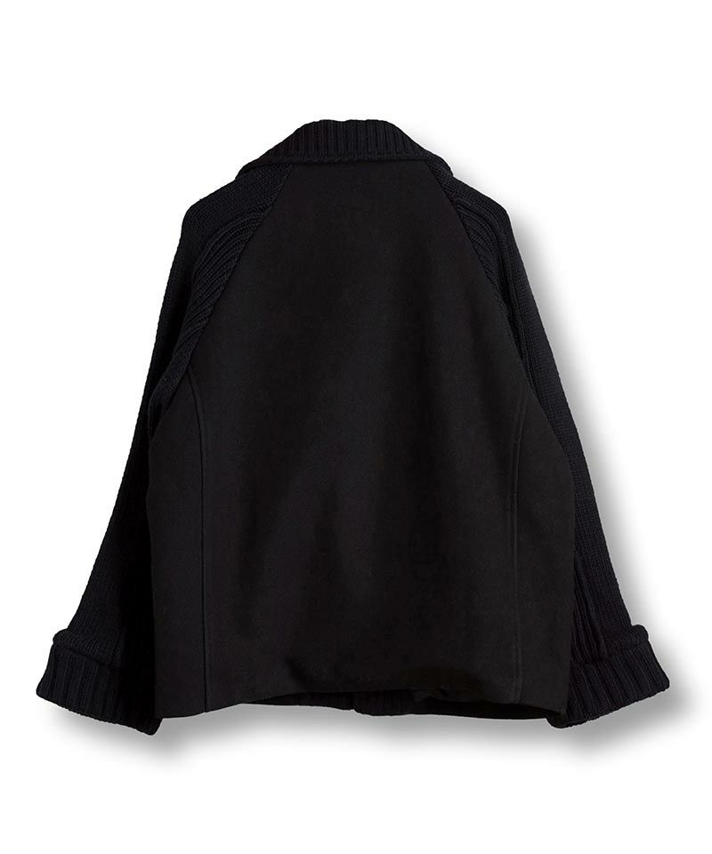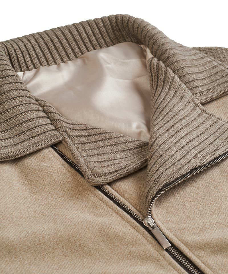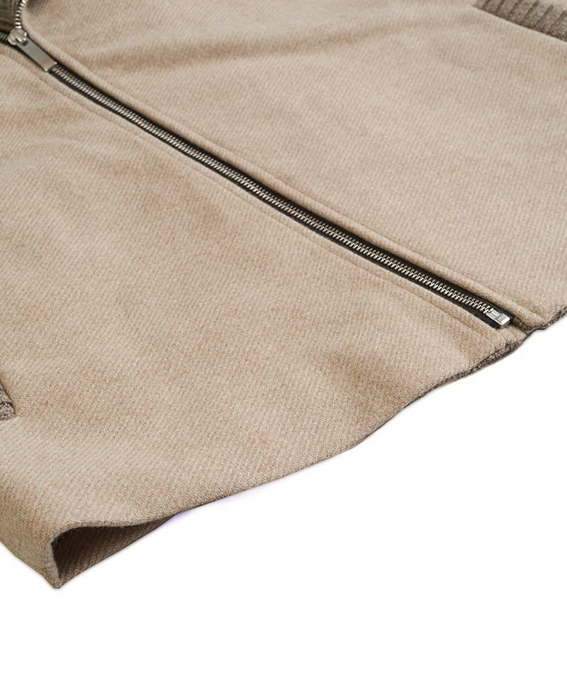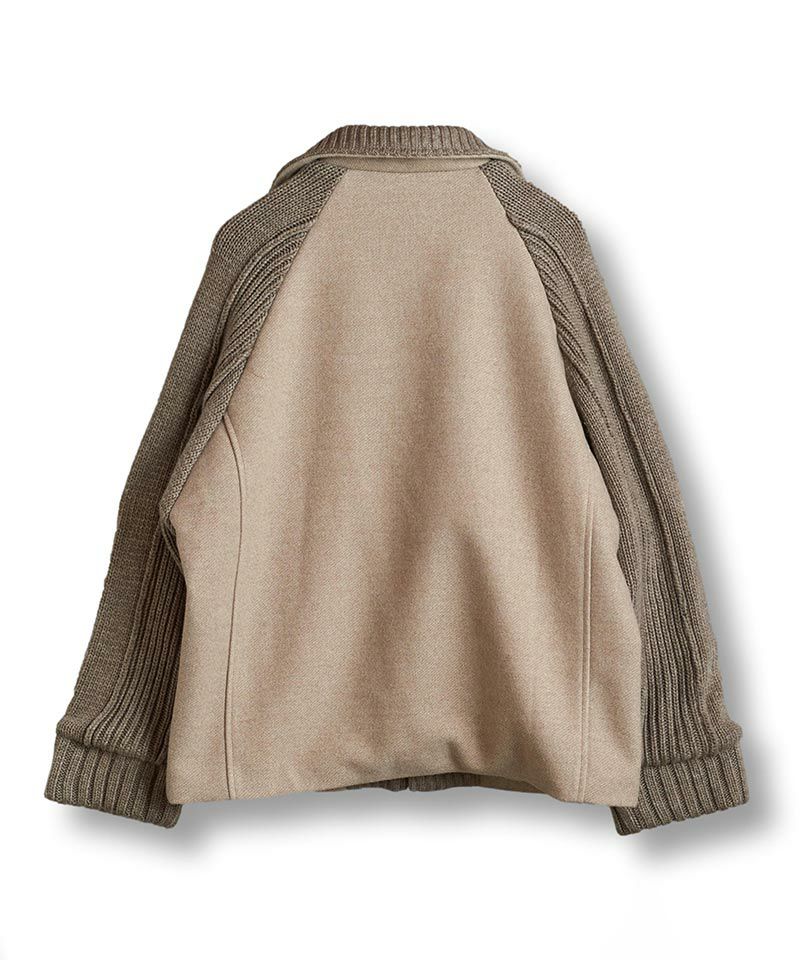 天竺編みとリブ編みを交互に組み合わせた両袖に加えて、襟、見返し、ポケット口をリブ編みのニットで編み立てた布帛との切り替えデザインが特徴的なアイテム。
